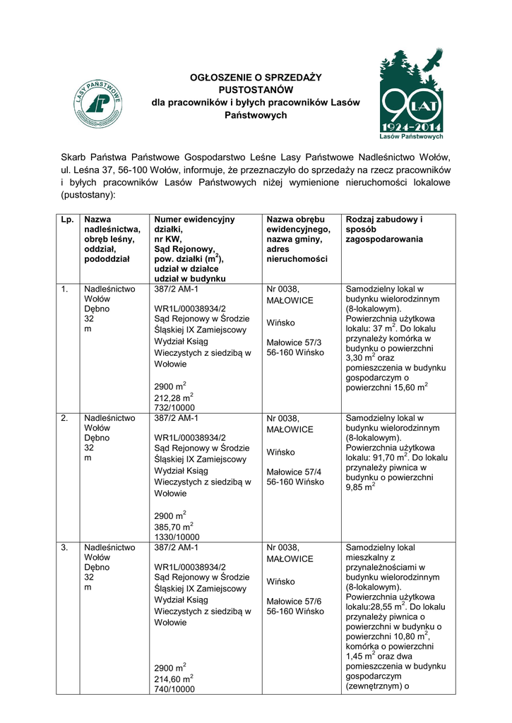 OGŁOSZENIE O SPRZEDAŻY PUSTOSTANÓW dla pracowników i byłych pracowników Lasów Państwowych Skarb Państwa Państwowe Gospodarstwo Leśne Lasy Państwowe Nadleśnictwo Wołów, ul. Leśna 37, 56-100 Wołów, informuje, że przeznaczyło do sprzedaży na rzecz pracowników i byłych pracowników Lasów Państwowych niżej wymienione nieruchomości lokalowe (pustostany): Lp. Nazwa nadleśnictwa, obręb leśny, oddział, pododdział 1. Nadleśnictwo Wołów Dębno 32 m Numer ewidencyjny działki, nr KW, Sąd Rejonowy, 2 pow. działki (m ), udział w działce udział w budynku 387/2 AM-1 WR1L/00038934/2 Sąd Rejonowy w Środzie Śląskiej IX Zamiejscowy Wydział Ksiąg Wieczystych z siedzibą w Wołowie Nazwa obrębu ewidencyjnego, nazwa gminy, adres nieruchomości Rodzaj zabudowy i sposób zagospodarowania Nr 0038, MAŁOWICE Samodzielny lokal w budynku wielorodzinnym (8-lokalowym). Powierzchnia użytkowa 2 lokalu: 37 m . Do lokalu przynależy komórka w budynku o powierzchni 2 3,30 m oraz pomieszczenia w budynku gospodarczym o 2 powierzchni 15,60 m Wińsko Małowice 57/3 56-160 Wińsko 2 2. Nadleśnictwo Wołów Dębno 32 m 2900 m 2 212,28 m 732/10000 387/2 AM-1 WR1L/00038934/2 Sąd Rejonowy w Środzie Śląskiej IX Zamiejscowy Wydział Ksiąg Wieczystych z siedzibą w Wołowie Nr 0038, MAŁOWICE Wińsko Małowice 57/4 56-160 Wińsko Samodzielny lokal w budynku wielorodzinnym (8-lokalowym). Powierzchnia użytkowa 2 lokalu: 91,70 m . Do lokalu przynależy piwnica w budynku o powierzchni 2 9,85 m 2 3. Nadleśnictwo Wołów Dębno 32 m 2900 m 2 385,70 m 1330/10000 387/2 AM-1 WR1L/00038934/2 Sąd Rejonowy w Środzie Śląskiej IX Zamiejscowy Wydział Ksiąg Wieczystych z siedzibą w Wołowie 2 2900 m 2 214,60 m 740/10000 Nr 0038, MAŁOWICE Wińsko Małowice 57/6 56-160 Wińsko Samodzielny lokal mieszkalny z przynależnościami w budynku wielorodzinnym (8-lokalowym). Powierzchnia użytkowa 2 lokalu:28,55 m . Do lokalu przynależy piwnica o powierzchni w budynku o 2 powierzchni 10,80 m , komórka o powierzchni 2 1,45 m oraz dwa pomieszczenia w budynku gospodarczym (zewnętrznym) o 4. Nadleśnictwo Wołów Dębno 32 m 387/2 AM-1 WR1L/00038934/2 Sąd Rejonowy w Środzie Śląskiej IX Zamiejscowy Wydział Ksiąg Wieczystych z siedzibą w Wołowie 2 2900 m 2 302,76 m 1044/10000 Nr 0038, MAŁOWICE Wińsko Małowice 57/8 56-160 Wińsko powierzchni łącznej 15,60 2 2 2 m (kolejno: 7m i 8,60 m ) Samodzielny lokal mieszkalny z przynależnościami w budynku wielorodzinnym (8-lokalowym). Powierzchnia użytkowa 2 lokalu:46,20 m . Do lokalu przynależy piwnica o powierzchni w budynku o 2 powierzchni:14,60 m , WC w osobnym pomieszczeniu 2 o powierzchni: 3,30 m oraz dwa pomieszczenia w budynku gospodarczym (zewnętrznym) o powierzchni łącznej 15,60 2 2 2 m (kolejno: 7m i 8,60 m ) Sprzedaż nastąpi w trybie art. 40a ustawy z dnia 28 września 1991 o lasach (tekst jedn. Dz.U. z 2011 r. nr 12, poz. 59 z późn. zm.) zwanej dalej ustawą i zgodnie z zapisami rozporządzenia Ministra Środowiska z dnia 1 października 2013 r. w sprawie szczegółowych zasad i trybu sprzedaży lokali i gruntów z budynkami mieszkalnymi w budowie oraz kryteriów kwalifikowania ich jako nieprzydatne Lasom Państwowym, a także trybu przeprowadzania przetargu ograniczonego ( Dz.U. z 2013r. poz 1206). Nieruchomości zostały zatwierdzone do sprzedaży przez Dyrektora Generalnego Lasów Państwowych i ogłoszone w Biuletynie Informacyjnym Lasów Państwowych: Lokale: Małowice 57/3, Małowice 57/4 BILP nr 8-9/2014 Lokale: Małowice 57/6, Małowice 57/8 BILP nr 11/2014 Wykaz nieruchomości został opublikowany przez Nadleśnictwo Wołów w Gazecie Wrocławskiej w dniu 13 listopada 2014 r. Zamiar nabycia ww. nieruchomości pracownicy i byli pracownicy Lasów Państwowych, o których mowa w art. 40a ust. 9 ustawy, zgłaszają w formie pisemnego wniosku w terminie jednego miesiąca od dnia ukazania się ogłoszenia w prasie, tj. do 13 grudnia 2014 r. Wniosek może być przesłany pocztą lub złożony w sekretariacie Nadleśnictwa Wołów. Do wniosku o zamiar nabycia nieruchomości należy dołączyć: 1. oświadczenie o przysługującym pierwszeństwie nabycia, 2. dokumenty potwierdzające okres zatrudnienia w Lasach Państwowych oraz innych jednostkach, o których mowa w art. 40a ust. 6 ustawy, 3. propozycję sposobu spłaty należności, a w szczególności ilości rat, w jakich zostanie spłacona należność (spłata należności może być rozłożona maksymalnie na 60 miesięcznych rat). W przypadku gdy wpłynie więcej niż jeden wniosek, zostanie ogłoszony pisemny przetarg ograniczony dla osób uprawnionych, które złożyły wnioski. Wojciech Adamczak Nadleśniczy Nadleśnictwa Wołów
