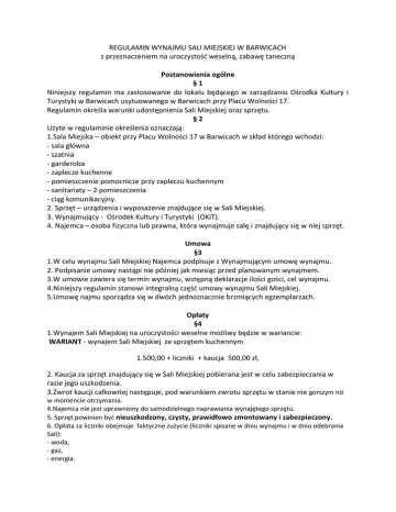 REGULAMIN WYNAJMU SALI MIEJSKIEJ W BARWICACH z przeznaczeniem na uroczystość weselną, zabawę taneczną Postanowienia ogólne §1 Niniejszy regulamin ma zastosowanie do lokalu będącego w zarządzaniu Ośrodka Kultury i Turystyki w Barwicach usytuowanego w Barwicach przy Placu Wolności 17. Regulamin określa warunki udostępnienia Sali Miejskiej oraz sprzętu. §2 Użyte w regulaminie określenia oznaczają: 1.Sala Miejska – obiekt przy Placu Wolności 17 w Barwicach w skład którego wchodzi: - sala główna - szatnia - garderoba - zaplecze kuchenne - pomieszczenie pomocnicze przy zapleczu kuchennym - sanitariaty – 2 pomieszczenia - ciąg komunikacyjny. 2. Sprzęt – urządzenia i wyposażenie znajdujące się w Sali Miejskiej. 3. Wynajmujący - Ośrodek Kultury i Turystyki (OKiT). 4. Najemca – osoba fizyczna lub prawna, która wynajmuje salę i znajdujący się w niej sprzęt. Umowa §3 1.W celu wynajmu Sali Miejskiej Najemca podpisuje z Wynajmującym umowę wynajmu. 2. Podpisanie umowy nastąpi nie później jak miesiąc przed planowanym wynajmem. 3.W umowie zawiera się termin wynajmu, wstępną deklaracje ilości gości, cel wynajmu. 4.Niniejszy regulamin stanowi integralną część umowy wynajmu Sali Miejskiej. 5.Umowę najmu sporządza się w dwóch jednoznacznie brzmiących egzemplarzach. Opłaty §4 1.Wynajem Sali Miejskiej na uroczystości weselne możliwy będzie w wariancie: WARIANT - wynajem Sali Miejskiej ze sprzętem kuchennym 1.500,00 + liczniki + kaucja 500,00 zł, 2. Kaucja za sprzęt znajdujący się w Sali Miejskiej pobierana jest w celu zabezpieczania w razie jego uszkodzenia. 3.Zwrot kaucji całkowitej następuje, pod warunkiem zwrotu sprzętu w stanie nie gorszym niż w momencie otrzymania. 4.Najemca nie jest uprawniony do samodzielnego naprawiania wynajętego sprzętu. 5. Sprzęt powinien być nieuszkodzony, czysty, prawidłowo zmontowany i zabezpieczony. 6. Opłata za liczniki obejmuje faktyczne zużycie (liczniki spisane w dniu wynajmu i w dniu odebrania Sali): - woda, - gaz, - energia. 7. Opłaty określone w punkcie 1 należy uiścić nie później jak 7 dni przed terminem wynajmu w kasie OKiT. 8. Dokonanie wpłaty za wynajem jest potwierdzeniem akceptacji niniejszego Regulaminu. 9. Kaucja podlega zwrotowi po wykonaniu umowy najmu z zastrzeżeniem §5 pkt.5. Wynajmujący §5 1.Wynajumjący jest zobowiązany do prowadzenia bieżącego harmonogramu wynajmu Sali Miejskiej i udzielania zainteresowanym informacji o wolnych terminach wynajmu. 2.Przechowuje listę sprzętu w jaki wyposażona jest Sala Miejska i przedkłada ją do wglądu zainteresowanemu wynajmem. 3.Przygotowuje umowę najmu Sali Miejskiej wraz z załącznikiem , w którym znajduję się lista sprzętu znajdującego się w Sali Miejskiej i udostępnionego zgodnie z wybranym wariantem §4 punkt 1. 4.Przekazuje i odbiera Salę Miejską i sprzęt zgodnie z protokołem zdawczo-odbiorczym w terminie określonym w umowie. 5.W przypadku stwierdzenia uszkodzeń, zniszczeń – wynajmujący zleci naprawę a następnie obciąży kosztami Najemcę. Wynajmujący zastrzega sobie prawo zatrzymanie kaucji do pokrycia powstałych strat. 6. Wynajmujący nie wyraża zgody na oddanie Sali Miejskiej w podnajem. Najemca §6 1.Najemca jest zobowiązany do przestrzegania przepisów sanitarnych, BHP i przeciwpożarowych. 2.Najmeca ponosi odpowiedzialność materialną za wynajętą Salę Miejską i sprzęt. 3.Najemca zobowiązany jest zachować ład i porządek w wynajmowanej Sali jak również wokół posesji. 4.Po zakończeniu umowy najmu, Najemca jest zobowiązany pozostawić salę posprzątaną w niepogorszonym stanie. Nie posprzątanie Sali będzie skutkowało potrąceniem z kaucji kwoty w wysokości określonej w §7 . 5. Najemca odpowiada za wszelkie szkody wyrządzone Wynajmującemu w okresie dysponowania Salą Miejską.Za wyrządzone szkody określone w protokole zdawczo-odbiorczym najemca zostanie obciążony. 6.Odpowiedzialność za szkody wyrządzone przez osoby zaproszone przez najemcę ponosi Najemca. Zasady wyceny szkód §7 Wynajmujący obciąży Najemcę za wyrządzone szkody wg zasad: - za stłuczki, zniszczenie, zgubienie naczyń, sztućców i innych rzeczy będących w protokole zdawczoodbiorczym – wg faktur zakupu, -za uszkodzenia wyposażenia –wg ceny naprawy lub zakupu -za dewastację pomieszczeń ( brudne ściany)– wg kosztorysu naprawy -za pozostawienie Sali nie posprzątanej w dniu odbioru -100,00 złotych. Postanowienia końcowe §8 1.Niniejszy Regulamin stanowi integralną część zawieranych umów najmu 2.Regulamin wchodzi w życie z dniem 01.01 2015 roku.