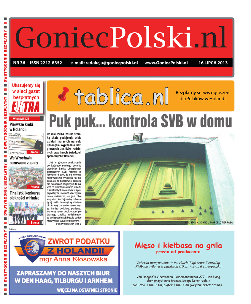 n n n DWUTYGODNIK BEZPŁATNY n n n DWUTYGODNIK BEZPŁATNY n n n DWUTYGODNIK BEZPŁATNY n n n DWUTYGODNIK BEZPŁATNY n n n Ukazujemy się w sieci gazet bezpłatnych W NUMERZE Pierwsze kroki w Holandii Strona 2 We Wrocławiu naruszono zasady Strona 4 Finalistki konkursu piękności w Hadze Strona 8 Reklama Puk puk… kontrola SVB w domu Od roku 2013 SVB na szeroką skalę podejmuje wiele działań mających na celu uniknięcie wypłacania bezprawnych zasiłków rodzinnych oraz innych świadczeń społecznych z Holandii. Już w grudniu praktycznie do każdego swojego petenta urzędnicy Banku Ubezpieczeń Społecznych (SVB) rozsyłali informacje o tym, że od nowego roku wzrośnie wysokość kar nie dość, że za bezprawne pobieranie świadczeń socjalnych, to nawet za nieinformowanie urzędu o zaistniałych zmianach w życiu prywatnym istotnych dla wypłacania świadczeń, co jest obowiązkiem każdej osoby pobierającej zasiłki i emerytury z Holandii. A kary za zaniechanie tego są bardzo dotkliwe, ponieważ wynoszą nawet dwukrotność pobranego zasiłku rodzinnego! W jaki sposób SVB będzie badać rzeczywistą sytuację petentów? DOKOŃCZENIE NA STR. 2 FOT. STOCK. XCHNG / MARCELO TERRAZA 2 Temat numeru WTOREK, 16 lipca 2013 Puk puk… kontrola SVB w domu DOKOŃCZENIE ZE STR. 1 SVB zapowiedziało na swojej stronie internetowej, iż jak co roku rozpoczyna wizyty domowe u swoich petentów zagranicznych. Oznacza to, iż jeśli ktoś pobiera świadczenie z SVB nie jest wykluczone, że pewnego dnia zapuka do niego urzędnik SVB. Wizyty są przeprowadzane przez specjalnych inspektorów do tego wyznaczonych przez Bank Ubezpieczeń Socjalnych, którzy poprzez odwiedziny w domu sprawdzają czy świadczenia są wypłacane dla osób do tego uprawnionych i we właściwej wysokości. Nie są one planowane i osoby do których zapuka inspektor nie zdają sobie sprawy z tego, iż będą przedmiotem kontroli ze strony SVB. Wiele osób pracujących w Holandii, lecz mających swoje faktyczne miejsce zamieszkania w Polsce, pobiera na swoje dzieci zasiłek rodzinny, którego wysokość wynosi od 191,65 do 273,78 euro na kwartał (kwota zasiłku jest zależna od wieku dziecka). Co więcej, osoby które w przeszłości pracowały w Holandii, w pewnych sytuacjach mają prawo do pobie- FOT. STOCK. XCHNG / JORGE VICENTE rania emerytury holenderskiej (AOW). Do nich także może zawitać urzędnik, mimo że mieszkają poza terenem Holandii. Tak więc każda osoba, która pobiera dotację na dziecko lub emeryturę holenderską może już za niedługo mieć niespodziankę w swoim domu w Polsce. Urzędnicy przeprowadzający kontrolę zawsze muszą się wylegitymować i dopiero wtedy mogą rozpocząć wizytę. Spotkanie z urzędnikiem polega na rozmowie z nim na temat swojej sytuacji życiowej. Inspektor ma za zadanie zweryfikować, czy zasiłek lub emerytura są wypłacane w sposób prawidłowy. Powinien zadawać różne pytania – w zależ- ności, które świadczenie jest pobierane. Jeśli jest to zasiłek rodzinny, to wtedy urzędnik sprawdza, czy dzieci faktycznie istnieją (ponieważ jako urząd z zagranicy nie ma możliwości, by to sprawdzić z terenu Holandii), czy chodzą do szkoły, czy osoba, która się opiekuje dzieckiem należycie wykonuje swoje obowiązki. Jeśli natomiast jest pobierana emerytura urzędnik może także zadawać pytania na temat sytuacji życiowej i mieszkaniowej danej osoby. Wizyty urzędników w domach zdarzały się także w poprzednich latach, między innymi w Polsce i przebiegały bez większych zakłóceń. Zwykle sprowadzają się do rozmowy oraz wyjaśnienia ewentualnych niejasności. Dla osób, które mają jakieś wątpliwości i pytania odnośnie swoich świadczeń, są także świetną okazją na usłyszenie odpowiedzi na nie wprost z ust urzędnika, który zajmuje się ich sprawą. (RED.) ARTYKUŁ POWSTAŁ PRZY WSPÓŁPRACY Z KANCELARIĄ PODATKOWĄ MGR ANNA KŁOSOWSKA WWW.ROZLICZSIE.PL FOT. STOCK. XCHNG / CHRISTOPHER THIEMET Jeśli masz jakieś pytania lub potrzebujesz pomocy w tym zakresie prosimy o wysyłanie e-maili na adres [email protected] Pierwsze kroki w Holandii – zameldowanie w gminie FOT. STOCK. XCHNG / PHILLIP BRAMBLE Jeżeli mają Państwo zamiar przebywać w Holandii dłużej niż cztery miesiące, wówczas powinni Państwo zameldować się w swojej nowej gminie. Należy tego obowiązku dopełnić w ciągu pierwszych pięciu dni pobytu, nie licząc dnia przyjazdu. A jeśli przebywają Państwo w Holandii już cztery miesiące, prosimy wówczas o niezwłoczne dopełnienie obowiązku meldunkowego – dokonuje się tego w urzędzie gminy. Jeżeli w Holandii towarzyszą Państwu partnerka lub partner oraz dzieci, to również i oni powinni dopełnić obowiązku zameldowania się w urzędzie gminy. Celem zameldowania się należy zabrać ze sobą następujące dokumenty: – Ważny dowód tożsamości (paszport lub dowód osobisty) każdej stawiającej się osoby. – Umowę najmu lub kupna mieszkania w Holandii. Jeśli mieszkają Państwo u kogoś, to prosimy zabrać ze sobą oświadczenie sporządzone i podpisane przez tę osobę. Prosimy także zadbać o kopię jej dowodu tożsamości. – Akty urodzenia wszystkich stawiających się osób i ewentual- nie akty małżeństwa (również dotyczące poprzednich związków małżeńskich). Wszystkie dokumenty powinny być na drukach międzynarodowych lub winny być przetłumaczone przez tłumacza przysięgłego na jeden z następujących języków: angielski, niemiecki, francuski albo niderlandzki. Tłumaczenia mogą być dostarczone w późniejszym terminie. Zameldowanie w urzędzie gminy jest bezpłatne. Po zameldowaniu się otrzymają Państwo numer ewidencyjno-podatkowy (tzw. ‘Burgerservicenummer” lub ‘Sofinummer” – BSN). Numer ten będzie Państwu potrzebny w wielu sytuacjach, na przykład w szpitalu, w szkole, w pracy czy podczas ubiegania się o świadczenia społeczne. Jeśli postanowią Pańs