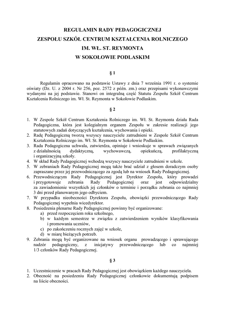 REGULAMIN RADY PEDAGOGICZNEJ ZESPOŁU SZKÓŁ CENTRUM KSZTAŁCENIA ROLNICZEGO IM. WŁ. ST. REYMONTA W SOKOŁOWIE PODLASKIM §1 Regulamin opracowano na podstawie Ustawy z dnia 7 września 1991 r. o systemie oświaty (Dz. U. z 2004 r. Nr 256, poz. 2572 z późn. zm.) oraz przepisami wykonawczymi wydanymi na jej podstawie. Stanowi on integralną część Statutu Zespołu Szkół Centrum Kształcenia Rolniczego im. Wł. St. Reymonta w Sokołowie Podlaskim. §2 1. W Zespole Szkół Centrum Kształcenia Rolniczego im. Wł. St. Reymonta działa Rada Pedagogiczna, która jest kolegialnym organem Zespołu w zakresie realizacji jego statutowych zadań dotyczących kształcenia, wychowania i opieki. 2. Radę Pedagogiczną tworzą wszyscy nauczyciele zatrudnieni w Zespole Szkół Centrum Kształcenia Rolniczego im. Wł. St. Reymonta w Sokołowie Podlaskim. 3. Rada Pedagogiczna uchwala, zatwierdza, opiniuje i wnioskuje w sprawach związanych z działalnością dydaktyczną, wychowawczą, opiekuńczą, profilaktyczną i organizacyjną szkoły. 4. W skład Rady Pedagogicznej wchodzą wszyscy nauczyciele zatrudnieni w szkole. 5. W zebraniach Rady Pedagogicznej mogą także brać udział z głosem doradczym osoby zapraszane przez jej przewodniczącego za zgodą lub na wniosek Rady Pedagogicznej. 6. Przewodniczącym Rady Pedagogicznej jest Dyrektor Zespołu, który prowadzi i przygotowuje zebrania Rady Pedagogicznej oraz jest odpowiedzialny za zawiadomienie wszystkich jej członków o terminie i porządku zebrania co najmniej 3 dni przed planowanym jego odbyciem. 7. W przypadku nieobecności Dyrektora Zespołu, obowiązki przewodniczącego Rady Pedagogicznej wypełnia wicedyrektor. 8. Posiedzenia plenarne Rady Pedagogicznej powinny być organizowane: a) przed rozpoczęciem roku szkolnego, b) w każdym semestrze w związku z zatwierdzeniem wyników klasyfikowania i promowania uczniów, c) po zakończeniu rocznych zajęć w szkole, d) w miarę bieżących potrzeb. 9. Zebrania mogą być organizowane na wniosek organu prowadzącego i sprawującego nadzór pedagogiczny, z inicjatywy przewodniczącego lub co najmniej 1/3 członków Rady Pedagogicznej. §3 1. Uczestniczenie w pracach Rady Pedagogicznej jest obowiązkiem każdego nauczyciela. 2. Obecność na posiedzeniu Rady Pedagogicznej członkowie dokumentują podpisem na liście obecności. 3. Nauczyciele są zobowiązani do nieujawniania spraw poruszanych na posiedzeniu Rady Pedagogicznej, które mogą naruszać dobro osobiste uczniów lub ich rodziców, a także nauczycieli i innych pracowników szkoły. 4. Posiedzenia Rady Pedagogicznej są zwoływane i protokołowane zgodnie z regulaminem Rady. §4 Do podstawowych zadań Rady Pedagogicznej należy: 1. Planowanie i organizowanie pracy dydaktycznej, wychowawczej, opiekuńczeji profilaktycznej. 2. Okresowe i roczne analizowanie i ocenianie stanu nauczania, wychowania, opiekii profilaktyki oraz organizacyjnych i materialnych warunków pracy szkoły. 3. Organizowanie wewnętrznego doskonalenia i upowszechniania nowatorstwa pedagogicznego. 4. Współpraca z rodzicami. 5. Kształtowanie postaw obywatelskich, etycznych i zawodowych swych członków. §5 Do kompetencji stanowiących Rady Pedagogicznej podejmowanych w formie uchwałnależy: 1. Zatwierdzanie planów pracy Zespołu Szkół Centrum Kształcenia Rolniczego w Sokołowie Podlaskim. 2. Podejmowanie uchwał w sprawie wyników klasyfikacji i promocji uczniów. 3. Ustalenie organizacji doskonalenia zawodowego nauczycieli. 4. Podejmowanie uchwał w sprawie innowacji i eksperymentów pedagogicznych w Zespole. 5. Podejmowanie uchwał w sprawie skreślania z listy uczniów. 6. Zatwierdzenie szkolnych regulaminów o charakterze wewnętrznym. 7. Uchwalenie w porozumieniu z Radą Rodziców programu wychowawczego i programu profilaktyki. 8. Podejmowanie uchwał o niepromowaniu do klasy programowo wyższej lub nieukończeniu szkoły przez ucznia, któremu w danej szkole co najmniej dwa razy z rzędu ustalono naganną roczną ocenę klasyfikacyjną zachowania. 9. Podejmowanie uchwał o promowaniu do klasy programowo wyższej ucznia, który jeden raz w ciągu danego etapu edukacyjnego nie zdał egzaminu poprawkowego z jednych obowiązkowych zajęć edukacyjnych pod warunkiem, że te obowiązkowe zajęcia edukacyjne są realizowane w klasie programowo wyższej. §6 Rada Pedagogiczna opiniuje: 1. Organizację pracy Zespołu, w tym zwłaszcza tygodniowy rozkład zajęć lekcyjnychi pozalekcyjnych. 2. Projekt planu finansowego szkoły. 3. Wnioski o przyznanie nauczycielom i pracownikom szkoły odznaczeń, nagród orazinnych form uznania. 4. Propozycje Dyrektora szkoły w sprawach przyznania nauczycielom stałych prac i zajęć w ramach wynagrodzenia zasadniczego oraz dodatkowo płatnych zajęć dydaktycznych, wychowawczych i opiekuńczych. 5. 6. 7. 8. 9. Kandydata na stanowisko dyrektora wskazanego bez konkursu. Kandydata na stanowisko wicedyrektora i kierownika praktycznej nauki zawodu. Przedłużenie powierzenia stanowiska dyrektora szkoły. Zezwolenia na indywidualny program lub tok nauki. Ustalenia średniej ocen ucznia dla otrzymania stypendium za wyniki w nauce lubosiągnięcia sportowe. 10. Wysokość stypendium i przyznanie stypendium za wyniki w nauce lub osiągnięcia sportowe. 11. Dopuszczenie do użytku w szkole programu nauczania ogólnego i zawodowego. 12. Wprowadzenie dodatkowych zajęć edukacyjnych do szkolnego planu nauczania. §7 Rada Pedagogiczna wyraża zgodę na: 1. Uznanie szkoły za eksperymentalną. 2. Egzamin klasyfikacyjny. 3. Wystąpienie Dyrektora do MEN o prowadzenie w szkole eksperymentu. §8 Rada Pedagogiczna może wnioskować w sprawie: 1. Odwołania dyrektora lub innej osoby ze stanowiska kierowniczego. 2. Przyznania uczniowi stypendium ministra. §9 1. Uchwały Rady Pedagogicznej są podejmowane zwykłą większością głosów w obecności conajmniej połowy jej członków. 2. W głosowaniu jawnym członkowie Rady głosują przez podni