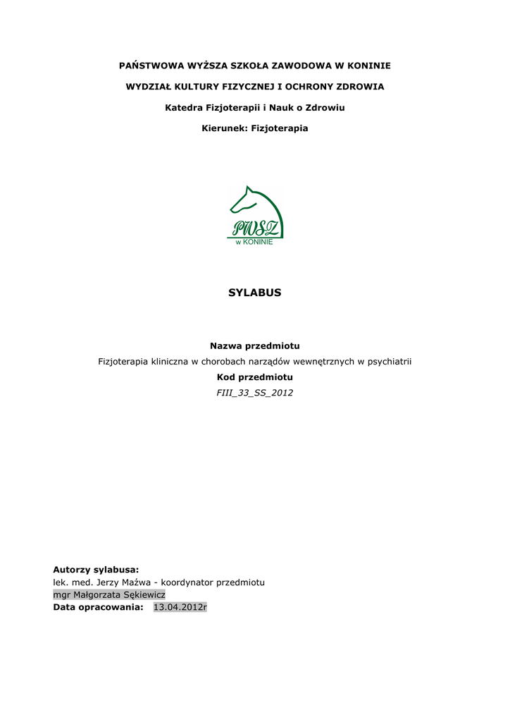 PAŃSTWOWA WYŻSZA SZKOŁA ZAWODOWA W KONINIE WYDZIAŁ KULTURY FIZYCZNEJ I OCHRONY ZDROWIA Katedra Fizjoterapii i Nauk o Zdrowiu Kierunek: Fizjoterapia SYLABUS Nazwa przedmiotu Fizjoterapia kliniczna w chorobach narządów wewnętrznych w psychiatrii Kod przedmiotu FIII_33_SS_2012 Autorzy sylabusa: lek. med. Jerzy Maźwa - koordynator przedmiotu mgr Małgorzata Sękiewicz Data opracowania: 13.04.2012r 1. Podstawowe informacje Poziom kształcenia studia pierwszego stopnia Profil kształcenia praktyczny Forma studiów stacjonarne Rok studiów III Semestr VI Moduł kształcenia kierunkowy Forma zajęć wykłady/ćwiczenia Wymiar godzinowy 8 godz. wykłady, 30 godz. ćwiczenia Liczba punktów ECTS 1,5 Język wykładowy polski Forma zaliczenia zaliczenie z oceną Rok akademicki 2014/2015 2. Cele kształcenia C01 Zapoznanie studenta z pojęciem szeroko rozumianej rehabilitacji w chorobach psychiatrycznych. C02 Umiejętność opisu i interpretacji jednostek chorobowych w psychiatrii oraz towarzyszących im współistniejących chorób. C03 Umiejętność pracy z pacjentem – korzystanie z doboru właściwych sposobów postępowania fizjoterapeutycznego u osób z chorobami psychiatrycznymi. 3. Wymagania wstępne Student, który rozpoczyna zajęcia z przedmiotu: • • • Posiada podstawową wiedzę z zakresu anatomii i fizjologii człowieka. Posiada podstawową wiedzę z fizjoterapii klinicznej w psychiatrii. Potrafi dostosować ćwiczenia do danej jednostki chorobowej. 4. Efekty kształcenia Objaśnienie oznaczeń: P – przedmiotowe efekty kształcenia W – kategoria wiedzy U – kategoria umiejętności K (po podkreślniku) – kategoria kompetencji społecznych K (przed podkreślnikiem) – kierunkowe efekty kształcenia K_…… – efekty kształcenia dla kierunku studiów ……………….. …… – efekty kształcenia w obszarze kształcenia w zakresie nauk ……………….. dla studiów pierwszego stopnia 01, 02, 03 i kolejne – numer efektu kształcenia Tabela odniesień przedmiotowych efektów kształcenia do efektów kierunkowych i obszarowych Efekty kształcenia dla przedmiotu Symbol Fizjoterapia kliniczna w chorobach narządów wewnętrznych w psychiatrii Student, który zaliczył przedmiot: P_W01 Zna metody opisu i interpretacji podstawowych jednostek i zespołów chorobowych w stopniu umożliwiającym racjonalne stosowanie środków Odniesienie do efektów kształcenia dla kierunku studiów Fizjoterapia Odniesienie do efektów kształcenia w obszarze kształcenia w zakresie nauk medycznych, o zdrowiu oraz o kulturze fizycznej K_W15 M1_W03 2 fizjoterapii i planowanie procesu rehabilitacyjnego P_W02 Zna zasób ćwiczeń i umie je dobrać w określone zestawy przydatne do realizacji różnych zadań leczniczych, korekcyjnych i profilaktycznych. K_W35 M1_W07 P_U01 Potrafi wykonywać zabiegi z zakresu fizjoterapii u osób z chorobami i dysfunkcjami dotyczącymi różnych narządów i układów- stosownie do ich stanu leczniczego i funkcjonalnego. K_U16 M1_U02 P_U02 Potrafi dobrać poszczególne ćwiczenia oraz metodycznie ich uczyć, stopniując natężenie wysiłku fizycznego dla osób z różnymi możliwościami funkcjonalnymi. K_U29 M1_U11 P_K01 Rozumie konieczność współpracy ze specjalistami o innych kompetencjach zawodowych oraz z przedstawicielami innych zawodów. K_K04 M1_K02 M1_K04 P_K02 Potrafi określić obszary działań fizjoterapeutycznych i obiektywnie formułować opinię dotyczących pacjentó K_K17 K_K18 M1_K01 5. Treści kształcenia WYKŁADY liczba godzin WYK01 Rehabilitacja jako nieodzowny element współpracy psychiatrii. Pojęcie i zasady rehabilitacji w odniesieniu do chorych psychicznie. 4 WYK02 Podstawowe jednostki chorobowe w psychiatrii i choroby towarzyszące. Trening umiejętności aktywnego udziału we własnym leczeniu. 4 ogółem 8 ĆWICZENIA liczba godzin ĆW01 Rehabilitacja społeczna w psychiatrii. ĆW02 Specyfika kompleksowej rehabilitacji chorych na choroby psychiczne. 5 ĆW03 Terapia pracą. 1 ĆW04 Ćwiczenia zręcznościowo-sprawnościowe, aktywizujące, uspakajające, relaksacyjno-koncentrujące, gry i zabawy ruchowe – jako podstawowe formy wspomagania leczenia chorych psychicznie z uwzględnieniem dysfunkcji ruchowych. 6 Ćwiczenia z choreoterapii, muzykoterapii – jako podstawowe formy wspomagające terapię w wybranych jednostkach chorobowych z uwzględnieniem dysfunkcji ruchowych. 6 ĆW05 ĆW06 Umiejętność zastosowania poznanych ćwiczeń (uwzględniając jednostkę chorobową i towarzyszące jej choroby) u pacjentów z chorobami psychicznymi. ogółem 2 10 30 6. Metody kształcenia MK01 Wykład MK02 Prezentacja multimedialna MK03 Zadania i praca w grupach MK04 Przygotowanie referatów 7. Metody oceny (ocena formująca, ocena podsumowująca) OF01 Przygotowanie recenzji referatów opracowanych przez studentów. OF02 Zadania przedkolokwialne. OF03 Aktywność studenta na zajęciach – ocean. OF04 Opracowanie prezentacji. OP01 Kolokwium 3 8. Obciążenie pracą studenta liczba godzin Godziny kontaktowe z nauczycielem 38 Praca indywidualna studenta, w tym: • Przygotowanie do zajęć 5 • Udział w wykładzie 8 • Przygotowanie ćwiczeń do danej jednostki chorobowej 5 • Przygotowanie do zaliczenia 5 • Przygotowanie prezentacji 5 Łączne obciążenie pracą studenta 71 • 5 9. Liczba punktów ECTS Liczba punktów ECTS, którą student uzyskuje za: • udział w zajęciach wymagających bezpośredniego udziału nauczycieli i studentów (godziny kontaktowe z nauczycielem) • pracę indywidualną 1 0,5 Sumaryczna liczba punktów ECTS dla przedmiotu 1,5 10. Literatura podstawowa • • • • Bilikiewicz A. „Psychiatria. Podręcznik dla studentów medycyny” PZWL 2004 Medner J. „ Rehabilitacja w psychiatrii” Urban&Partners 2003 Namysłowska „Gdy odchudzanie jest chorobą. Anoreksja INTRA W-wa 2000 Florkowski A. „Fizjoterapia w psychiatrii”. PZWL 2012 11. Literatura uzupełniająca • Bogdahowicz M., 
