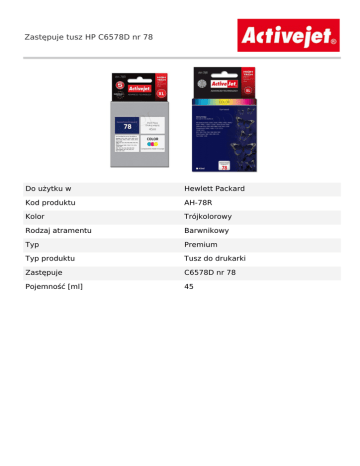 Zastępuje tusz HP C6578D nr 78 Do użytku w Hewlett Packard Kod produktu AH-78R Kolor Trójkolorowy Rodzaj atramentu Barwnikowy Typ Premium Typ produktu Tusz do drukarki Zastępuje C6578D nr 78 Pojemność [ml] 45