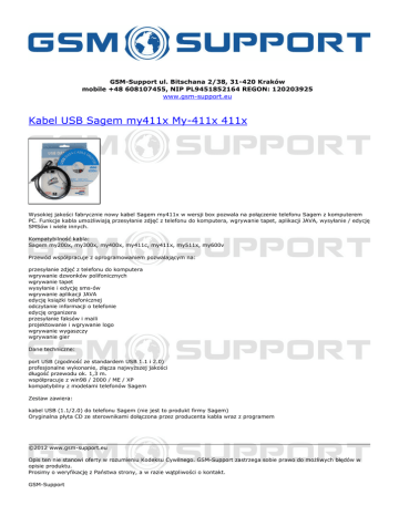 GSM-Support ul. Bitschana 2/38, 31-420 Kraków mobile +48 608107455, NIP PL9451852164 REGON: 120203925 www.gsm-support.eu Kabel USB Sagem my411x My-411x 411x Wysokiej jakości fabrycznie nowy kabel Sagem my411x w wersji box pozwala na połączenie telefonu Sagem z komputerem PC. Funkcje kabla umożliwiają przesyłanie zdjęć z telefonu do komputera, wgrywanie tapet, aplikacji JAVA, wysyłanie / edycję SMSów i wiele innych. Kompatybilność kabla: Sagem my200x, my300x, my400x, my411c, my411x, my511x, my600v Przewód współpracuje z oprogramowaniem pozwalającym na: przesyłanie zdjęć z telefonu do komputera wgrywanie dzwonków polifonicznych wgrywanie tapet wysyłanie i edycję sms-ów wgrywanie aplikacji JAVA edycję książki telefonicznej odczytanie informacji o telefonie edycję organizera przesyłanie faksów i maili projektowanie i wgrywanie logo wgrywanie wygaszczy wgrywanie gier Dane techniczne: port USB (zgodność ze standardem USB 1.1 i 2.0) profesjonalne wykonanie, złącza najwyższej jakości długość przewodu ok. 1,3 m. współpracuje z win98 / 2000 / ME / XP kompatybilny z modelami telefonów Sagem Zestaw zawiera: kabel USB (1.1/2.0) do telefonu Sagem (nie jest to produkt firmy Sagem) Oryginalna płyta CD ze sterownikami dołączona przez producenta kabla wraz z programem ©2012 www.gsm-support.eu Opis ten nie stanowi oferty w rozumieniu Kodeksu Cywilnego. GSM-Support zastrzega sobie prawo do możliwych błędów w opisie produktu. Prosimy o weryfikację z Państwa strony, a w razie wątpliwości o kontakt. GSM-Support ul. Bitschana 2/38 31-420 Kraków POLSKA tel. 608107455 e-mail: [email protected] Powered by TCPDF (www.tcpdf.org)