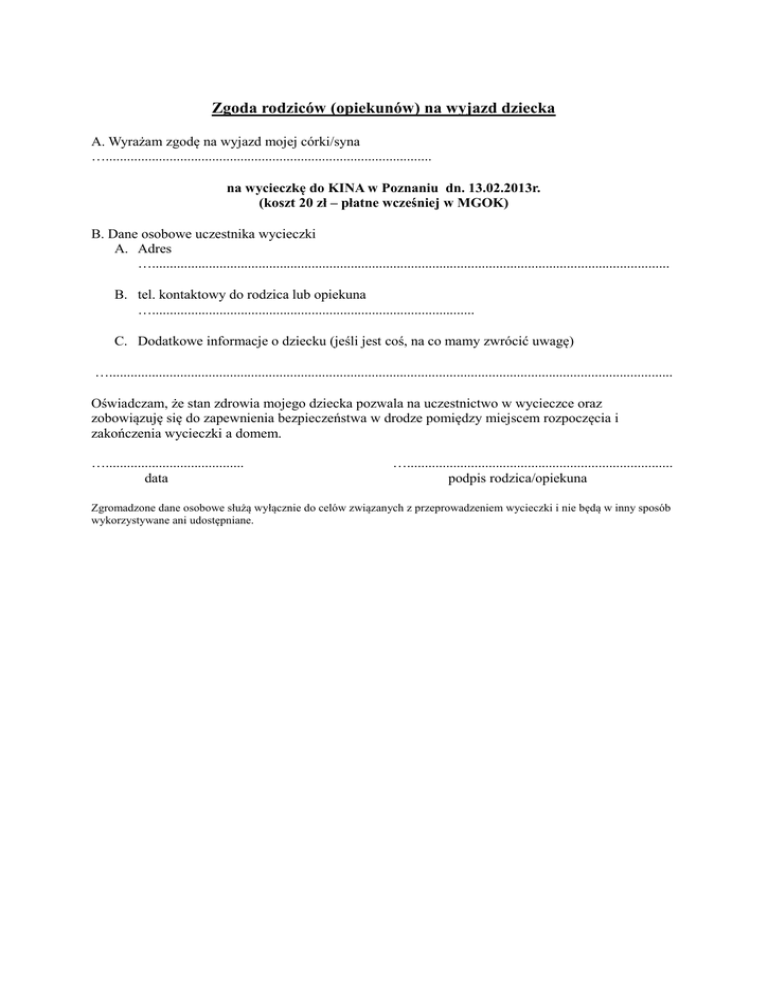 Zgoda rodziców (opiekunów) na wyjazd dziecka A. Wyrażam zgodę na wyjazd mojej córki/syna …............................................................................................ na wycieczkę do KINA w Poznaniu dn. 13.02.2013r. (koszt 20 zł – płatne wcześniej w MGOK) B. Dane osobowe uczestnika wycieczki A. Adres ….................................................................................................................................................. B. tel. kontaktowy do rodzica lub opiekuna …........................................................................................... C. Dodatkowe informacje o dziecku (jeśli jest coś, na co mamy zwrócić uwagę) …............................................................................................................................................................... Oświadczam, że stan zdrowia mojego dziecka pozwala na uczestnictwo w wycieczce oraz zobowiązuję się do zapewnienia bezpieczeństwa w drodze pomiędzy miejscem rozpoczęcia i zakończenia wycieczki a domem. …....................................... data …........................................................................... podpis rodzica/opiekuna Zgromadzone dane osobowe służą wyłącznie do celów związanych z przeprowadzeniem wycieczki i nie będą w inny sposób wykorzystywane ani udostępniane.