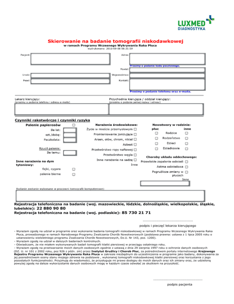 Skierowanie na badanie tomografii niskodawkowej Rejestracja telefoniczna na badanie (woj. mazowieckie, łódzkie, dolnośląskie, wielkopolskie, śląskie, lubelskie): 22 880 90 80 Rejestracja telefoniczna na badanie (woj. podlaskie): 85 730 21 71 ............................................ podpis i pieczęć lekarza kierującego - Wyrażam zgodę na udział w programie oraz wykonanie badania tomografii niskodawkowej w ramach Programu Wczesnego Wykrywania Raka Płuca, prowadzonego w ramach Narodowego Programu Zwalczania Chorób Nowotworowych (podstawa prawna: ustawa z 1 lipca 2005 roku o ustanowieniu wieloletniego programu Zwalczania Chorób Nowotworowych, Dz.U. Nr 143, poz. 1200). - Wyrażam zgodę na udział w dalszych badaniach kontrolnych. - Oświadczam, że nie miałem wykonywanych badań tomografii klatki piersiowej w przeciągu ostatniego roku. - Wyrażam zgodę na przetwarzanie moich danych osobowych zgodnie z ustawą z dnia 29 sierpnia 1997 roku o ochronie danych osobowych (DZ. U. nr 101 z 2002 roku, poz 926 z późn. zm) przez Instytut Gruźlicy i Chorob Płuc, za pośrednictwem portalu internetowego Krajowego Rejestru Programu Wczesnego Wykrywania Raka Płuca w zakresie niezbędnym do uczestniczenia w programie jako badany, dokonywania za jej posrednictwem oceny stanu mojego zdrowia na podstawie , wykonanej tomografii niskodawkowej klatki piersiowej oraz korzystania z jego pozostałych funkcjonalności. Przyjmuję do wiadomości, że przysługuje mi prawo dostępu do moich danych oraz ich zmiany oraz, że udzieloną powyżej zgodę na dalsze wykorzystanie danych osobowych mogę w każdym czasie odwołać ze skutkiem na przyszłość. ........................................... podpis pacjenta
