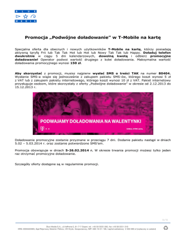 Promocja „Podwójne doładowanie” w T-Mobile na kartę Specjalna oferta dla obecnych i nowych użytkowników T-Mobile na kartę, którzy posiadają aktywną taryfę Frii lub Tak Tak Hot lub Hot lub Nowy Tak Tak lub Happy. Doładuj telefon dwukrotnie w ciągu 5 dni kalendarzowych, dowolną kwotą i odbierz promocyjne doładowanie! Operator podwoi wartość drugiego z kolei doładowania. Maksymalna wartość doładowania promocyjnego wynosi 150 zł. Aby skorzystać z promocji, musisz najpierw wysłać SMS o treści TAK na numer 80404. Wysłanie SMS-a wiąże się jednocześnie z zakupem pakietu SMS-ów, którego koszt wynosi 5 zł z VAT lub z zakupem pakietu internetowego, którego koszt wynosi 10 zł z VAT. Pakiet internetowy przysługuje osobom, które skorzystały z oferty „Podwójne doładowanie” w okresie od 2.12.2013 do 15.12.2013 r. Doładowanie promocyjne zostanie przyznane w przeciągu 7 dni. Dodanie pakietu nastąpi w dniach 5.02 – 5.03.2014 r. oraz zostanie potwierdzone SMS’em. Promocja obowiązuje w dniach 5-26.02.2014 r. W okresie trwania promocji możesz tylko jeden raz otrzymać promocyjne doładowanie. Szczegóły oferty dostępne są w regulaminie promocji. 1/1