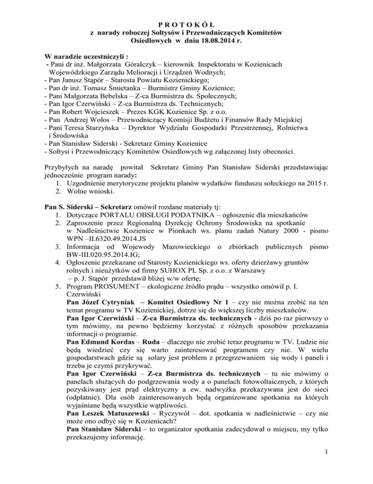 PROTOKÓŁ z narady roboczej Sołtysów i Przewodniczących Komitetów Osiedlowych w dniu 18.08.2014 r. W naradzie uczestniczyli : - Pani dr inż. Małgorzata Góralczyk – kierownik Inspektoratu w Kozienicach Wojewódzkiego Zarządu Melioracji i Urządzeń Wodnych; - Pan Janusz Stąpór – Starosta Powiatu Kozienickiego; - Pan dr inż. Tomasz Śmietanka – Burmistrz Gminy Kozienice; - Pani Małgorzata Bebelska – Z-ca Burmistrza ds. Społecznych; - Pan Igor Czerwiński – Z-ca Burmistrza ds. Technicznych; - Pan Robert Wojcieszek – Prezes KGK Kozienice Sp. z o.o. - Pan Andrzej Wołos – Przewodniczący Komisji Budżetu i Finansów Rady Miejskiej - Pani Teresa Starzyńska – Dyrektor Wydziału Gospodarki Przestrzennej, Rolnictwa i Środowiska - Pan Stanisław Siderski - Sekretarz Gminy Kozienice - Sołtysi i Przewodniczący Komitetów Osiedlowych wg załączonej listy obecności. Przybyłych na naradę powitał Sekretarz Gminy Pan Stanisław Siderski przedstawiając jednocześnie program narady: 1. Uzgodnienie merytoryczne projektu planów wydatków funduszu sołeckiego na 2015 r. 2. Wolne wnioski. Pan S. Siderski – Sekretarz omówił rozdane materiały tj: 1. Dotyczące PORTALU OBSŁUGI PODATNIKA – ogłoszenie dla mieszkańców 2. Zaproszenie przez Regionalną Dyrekcję Ochrony Środowiska na spotkanie w Nadleśnictwie Kozienice w Pionkach ws. planu zadań Natury 2000 - pismo WPN –II.6320.49.2014.JS 3. Informacja od Wojewody Mazowieckiego o zbiórkach publicznych pismo BW-III.020.95.2014.IG; 4. Ogłoszenie przekazane od Starosty Kozienickiego ws. oferty dzierżawy gruntów rolnych i nieużytków od firmy SUHOX PL Sp. z o.o. z Warszawy – p. J. Stąpór przedstawił bliżej w/w ofertę; 5. Program PROSUMENT – ekologiczne źródło prądu – wszystko omówił p. I. Czerwiński Pan Józef Cytryniak – Komitet Osiedlowy Nr 1 – czy nie można zrobić na ten temat programu w TV Kozienickiej, dotrze się do większej liczby mieszkańców. Pan Igor Czerwiński – Z-ca Burmistrza ds. technicznych - dziś po raz pierwszy o tym mówimy, na pewno będziemy korzystać z różnych sposobów przekazania informacji o programie. Pan Edmund Kordas – Ruda – dlaczego nie zrobić teraz programu w TV. Ludzie nie będą wiedzieć czy się warto zainteresować programem czy nie. W wielu gospodarstwach gdzie są solary jest problem z przegrzewaniem się wody i paneli i trzeba je czymś przykrywać. Pan Igor Czerwiński – Z-ca Burmistrza ds. technicznych – tu nie mówimy o panelach służących do podgrzewania wody a o panelach fotowoltaicznych, z których pozyskiwany jest prąd elektryczny a ew. nadwyżka przekazywana jest do sieci (odpłatnie). Dla osób zainteresowanych będą organizowane spotkania na których wyjaśniane będą wszystkie wątpliwości. Pan Leszek Matuszewski – Ryczywół – dot. spotkania w nadleśnictwie – czy nie może ono odbyć się w Kozienicach? Pan Stanisław Siderski – to organizator spotkania zadecydował o miejscu, my tylko przekazujemy informację. 1 6. Plakat o Kozienickim Festiwalu Triatlonu 2014 (sołtysi przez których wsie przechodzi trasa triatlonu dostali dodatkowe informacje przygotowane przez KCKRiS) 7. Plakat na Dożynki Powiatowo Gminne Janików 2014 8. Plakat na Festiwal Muzyki Rozrywkowej im. B. Klimczuka. 9. Zaproszenia na Dzień Energetyka – Pożegnanie Lata. 10. Wyciąg z ustawy o samorządzie gminnym – art. 7 dot. zadań gminy. 11. Artykuł ze strony www.funduszesoleckie.pl w sprawie wniosków na zadania z funduszu sołeckiego. Ad.2. Programu spotkania – wolne wnioski Pani Janina Golik – Świerże Górne - na drodze do Wisły właściciel przystani promowej postawił znak STOP i przegrodził drogę łańcuchem – czy może tak robić? - przy ujściu Zagożdżonki do Wisły stoi barka i tamuje wpływ wody – prośba o interwencję - czy będzie kończone wzmocnienie wału od strony Zagożdżonki – ok. 800 m - na terenie osiedla pojawił się bezdomny, nocuje w śmietniku. Jak można pomóc takiej osoby, mieszkańcy trochę się go boją; - sprawa nieużytków przylegających do ogrodów działkowych. Wiosną są częste podpalenia na tych terenach i zagraża to działkom. Czy można ustalić właścicieli i ew. zmusić ich do koszenia? W Starostwie Powiatowym nie można uzyskac informacji o właścicielach Odpowiedział Pan J. Stąpór – Starosta Co do znaku STOPU – wszystko zostanie sprawdzone, samowolnie nie można takich rzeczy robić. Sprawa bezdomnego – póki nie narusza on prawa to nie można nic mu zrobić. Jak przyjdzie zima to trzeba zgłosić sprawę policji, która takie osoby zabiera do Domu Pomocy Społecznej. Sprawa właścicieli działek – rzeczywiście ustawa o ochronie danych osobowych zabrania ujawniać takie dane, chyba że będzie wszczęte postępowanie przeciwko właścicielowi ale wtedy wnioskują właściwe organy (policja, prokuratura itp.). Starosta sprawdzi czy nie są to grunty Skarbu Państwa. Pan Tomasz Śmietanka – Burmistrz – spróbujemy razem z Miejsko Gminnym Ośrodkiem Pomocy Społecznej pomóc tej osobie. Co do spraw związanych z zagrożeniem powodzią to gmina Kozienice przekazuje środki do WZMiUW aby utrzymać urządzenia melioracyjne na terenie gminy w dobrym stanie i zminimalizować możliwości wylewów i podtopień. Kanały oczyszczone w roku ubiegłym są już zarośnięte. Dyrektor Kwiecień z WZMiUW obiecał więcej działań w tym zakresie ale część obszarów objęta jest ochrona lub jest to obszar NATURA 2000 i wtedy potrzebne są szczegółowe uzgodnienia. W Świerżach Górnych powinien być jaz, bo okular powstrzymuje zejście wód z Zagożdżonki ale jest to już kosztowna inwestycja. Sprawa barki na Wiśle – podobno barka nie wpływa na spływ wód z Zagożdżonki do Wisły, zdania są podzielone. Trzeba wziąć pod uwagę, że zbyt szybki spadek wód też może źle wpłynąć na poziom wód gruntowych na Powiślu. Pani dr inż. Małgorzata Gór