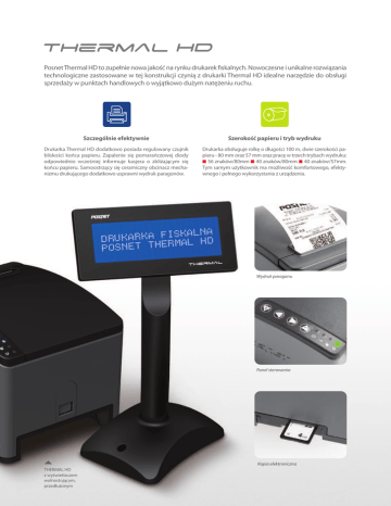 Posnet Thermal HD to zupełnie nowa jakość na rynku drukarek fiskalnych. Nowoczesne i unikalne rozwiązania technologiczne zastosowane w tej konstrukcji czynią z drukarki Thermal HD idealne narzędzie do obsługi sprzedaży w punktach handlowych o wyjątkowo dużym natężeniu ruchu. Szczególnie efektywnie Szerokość papieru i tryb wydruku Drukarka Thermal HD dodatkowo posiada regulowany czujnik bliskości końca papieru. Zapalenie się pomarańczowej diody odpowiednio wcześniej informuje kasjera o zbliżającym się końcu papieru. Samoostrzący się ceramiczny obcinacz mechanizmu drukującego dodatkowo usprawni wydruk paragonów. Drukarka obsługuje rolkę o długości 100 m, dwie szerokości papieru - 80 mm oraz 57 mm oraz pracę w trzech trybach wydruku: n 56 znaków/80mm n 40 znaków/80mm n 40 znaków/57mm. Tym samym użytkownik ma możliwość komfortowego, efektywnego i pełnego wykorzystania z urządzenia. Wydruk paragonu Panel sterowania Kopia elektroniczna THERMAL HD z wyświetlaczem wolnostojącym, przedłużonym Specyfikacja techniczna Thermal XL Thermal HD Kopia elektroniczna typ karta 4 GB SD/SDHC Eurofiskalizacja Eurofiskalizacja Eurofiskalizacja możliwość zaprogramowania dowolnej waluty w jakiej moduł fiskalny będzie rejestrował sprzedaż (np. euro) Bazy danych wielowalutowość Bazy danych Bazy danych 250 000 80 znaków + dodatkowa linia opisu POSNET/THERMAL 7 (A...G) baza PLU nazwa towaru protokół komunikacyjny stawki VAT 250 000 80 znaków + dodatkowa linia opisu POSNET/THERMAL 7 (A...G) Wyświetlacze wspólny z wyświetlaczem klienta wspólny z wyświetlaczem klienta OLED kompaktowy, LCD 2 x 20 znaków alfanumeryczny, podświetlany n standardowy (zintegrowany) n wolnostojący LCD 4 x 20 znaków alfanumeryczny, podświetlany n podwieszany LCD 4 x 20 znaków alfanumeryczny, podświetlany n standardowy (zintegrowany) n wolnostojący n podwieszany Termiczny Seiko „drop-in – wrzuć i drukuj” 57 mm 47 linii/s 40 100 m w standardzie Termiczny Axiohm „drop-in – wrzuć i drukuj” 57 mm lub 80 mm 47 linii/s (standard) 80 linii/s (premium) 40 100 m w standardzie (ceramiczny) membranowa 4 membranowa 4 Ethernet, 1 x RS232, 1 x USB Ethernet (opcjonalnie) w wersji z wyśw. zintegrowanym 6 V/12 V/18 V/ 24 V Ethernet, 2 x RS232, 1 x USB 230 V/24 V AGM 12 V/1,2 Ah 230 V/24 V NiMH 7,2 V/1,6 Ah 125 x 139 x 171 mm (bez wyświetlacza klienta) 125 x 149 x 171 mm (z kompaktowym wyświetlaczem klienta) 158 x 242 x 232 mm (ze zintegrowanym wyświetlaczem klienta) ~ 2,2 kg 143 x 144 x 181 mm (bez wyświetlacza klienta) 158 x 242 x 242 mm (z wyświetlaczem klienta) wyświetlacz operatora wyświetlacz klienta Mechanizm drukujący typ szerokość papieru szybkość wydruku liczba znaków w wierszu długość rolki obcinacz papieru Klawiatura typ liczba klawiszy Złącza interfejsy standardowe interfejsy dodatkowe sterowanie szufladą 6 V/12 V/18 V/ 24 V zasilacz zewnętrzny wbudowany akumulator Wymiary i waga wymiary (szer. x wys. x dł.) waga ~ 2,2 kg Ważne funkcje n wydruk NIP nabywcy w części fiskalnej paragonu n drukowanie faktur VAT n kody kreskowe w stopce paragonu (code 128) n kody 2D (QR Code, Data Matrix, Aztec, PDF417) n grafika na paragonach n przypominanie o terminie obowiązkowego przeglądu technicznego n integracja z systemami wideomonitoringu sklepowego Autoryzowany Przedstawiciel Posnet POSNET POLSKA S.A. ul. Municypalna 33 | 02-281 Warszawa tel. (22) 868 68 88 | fax (22) 868 68 89 Ulotka ma charakter informacyjny i nie stanowi oferty w rozumieniu przepisów kodeksu cywilnego. Zasilanie Drukarki fiskalne Rodzina drukarek Thermal jest obecna na rynku od prawie dwudziestu lat, sukcesywnie zwiększając grono zadowolonych klientów. Linia Thermal łączy w sobie sprawdzone rozwiązania z nowoczesnymi funkcjami i designem. Zastosowanie unikatowych rozwiązań technologicznych sprawia, że są to jedne z najczęściej wybieranych drukarek fiskalnych przez największe sieci sprzedaży w Polsce. Ergonomia i wygoda Przypominanie o przeglądach okresowych Nowatorskie rozwiązania konstrukcyjne drukarek Thermal, takie jak wolnostojące i podwieszane wyświetlacze czy kompaktowe rozmiary pozwalają na wyjątkowo łatwe i ergonomiczne zagospodarowanie stanowiska kasowego. Drukarki posiadają funkcję automatycznego przypominania o konieczności wykonania przeglądu okresowego. Od 30 dnia przed zaprogramowaną datą obowiązkowego przeglądu, drukowana jest informacja z przypomnieniem po każdorazowym uruchomieniu drukarki. Kompatybilność z większością szuflad Konfigurowane napięcie sterowania szufladą pozwala na współpracę z szufladami z o różnych interfejsach napięciowych: 6V, 12V, 18V, oraz 24V. Dzięki temu, drukarka współpracuje z większością szuflad dostępnych na rynku – również starszymi modelami. Kody kreskowe i 2D Dostępny jest wydruk kodu kreskowego (code 128) z dowolną informacją (np. numerem systemowym), co ułatwia identyfikację transakcji w systemie. Kody dwuwymiarowe (2D) mogą być drukowane w stopce paragonu, faktury oraz w dowolnym miejscu na wydruku niefiskalnym. Jest to doskonałe narzędzie do prowadzenia działań marketingowych skierowanych do klienta. Za pośrednictwem takich kodów możemy przekazać bony promocyjne czy link do strony z aktualną promocją. Standardy obsługiwanych kodów 2D: QR Code, Aztec, Data Matrix, PDF417. Polecane do: n punkty handlowe o wyjątkowo dużym natężeniu ruchu Szybki mechanizm – „wrzuć i drukuj” Zastosowanie wytrzymałego mechanizmu drukującego z obcinaczem papieru w standardzie, pozwala na wydruk z prędkością do 47 linii/s (150 mm/s), a wrzutowy system „drop in” zapewnia wymianę 100-metrowej rolki papieru w kilka sekund. FVAT Otwarta Faktura – nowy format wydruku Ethernet i porty komunikacyjne Drukarki zapewniają wydruk na fakturze wymaganych pozycji, takich jak transakcje, podsumowanie czy dane sprzedawcy. Natomiast pozostałe dane w dokumencie definiowane s