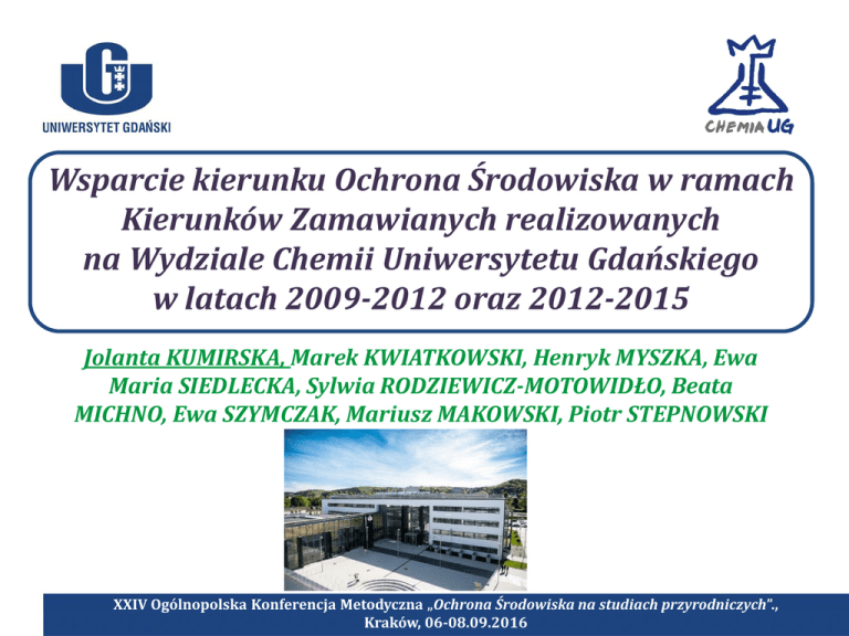 Wsparcie kierunku Ochrona Środowiska w ramach Kierunków Zamawianych realizowanych na Wydziale Chemii Uniwersytetu Gdańskiego w latach 2009-2012 oraz 2012-2015 Jolanta KUMIRSKA, Marek KWIATKOWSKI, Henryk MYSZKA, Ewa Maria SIEDLECKA, Sylwia RODZIEWICZ-MOTOWIDŁO, Beata MICHNO, Ewa SZYMCZAK, Mariusz MAKOWSKI, Piotr STEPNOWSKI XXIV Ogólnopolska Konferencja Metodyczna „Ochrona Środowiska na studiach przyrodniczych”., Kraków, 06-08.09.2016 Kierunek Ochrona Środowiska 1990 STUDIA STACJONARNE I STOPNIA STUDIA STACJONARNE I NIESTACJONARNE II STOPNIA Wydział Chemii Administracja kierunku Wydział Biologii Wydział Oceanografii i Geografii W latach 2009-2012 oraz 2012-2015 nastąpiło wsparcie kierunku OCHRONA ŚRODOWISKA w ramach Kierunków Zamawianych XXIV Ogólnopolska Konferencja Metodyczna, Kraków, 06-08.09.2016 Uniwersytet Gdański promotorem zasobów nowoczesnej gospodarki zwiększanie liczby absolwentów kierunków przyrodniczych i ścisłych (PRO GOS) lata 2009 -2012 Budżet : 11 717 010,40 PLN Kierownik Projektu: prof. dr hab. Piotr Stepnowski Biotechnologia Chemia Fizyka Informatyka OCHRONA ŚRODOWISKA (zadanie nr 7) https://inf.ug.edu.pl/kierunkizamawiane/?m=k XXIV Ogólnopolska Konferencja Metodyczna, Kraków, 06-08.09.2016 Kształcenie kadr dla innowacyjnej gospodarki opartej na wiedzy w zakresie agrochemii, chemii i ochrony środowiska (Inno-AgroChemOś) lata 2012 -2015 Budżet : 8 439 080 PLN Kierownik Projektu: dr hab. Sylwia RodziewiczMotowidło, prof. UG Chemia Agrochemia OCHRONA ŚRODOWISKA http://iaco.mirocms.pl/ XXIV Ogólnopolska Konferencja Metodyczna, Kraków, 06-08.09.2016 Cel projektu PRO-GOS Zwiększenie liczby absolwentów UG na wszystkich pięciu kierunkach Uczelni uznawanych za kluczowe dla gospodarki, tj.: biotechnologii, chemii, fizyki, informatyki, matematyki i OCHRONY ŚRODOWISKA Podniesienie poziomu ich wykształcenia Dostosowanie umiejętności praktycznych do potrzeb rynku pracy i oczekiwań pracodawców XXIV Ogólnopolska Konferencja Metodyczna, Kraków, 06-08.09.2016 Cel projektu Inno-AgroChemOś Zwiększenie liczby absolwentów kierunków ścisłych i przyrodniczych w odpowiedzi na rosnące zapotrzebowanie rynku pracy na specjalistów w zakresie agrochemii, chemii i OCHRONY ŚRODOWISKA XXIV Ogólnopolska Konferencja Metodyczna, Kraków, 06-08.09.2016 CEL prezentacji posterowej Omówienie najważniejszych form wsparcia kierunku OCHRONA ŚRODOWISKA oraz osiągniętych wskaźników tego wsparcia XXIV Ogólnopolska Konferencja Metodyczna, Kraków, 06-08.09.2016 Szkoły letnie Szkoła letnia 2012 Sobieszewo XXIV Ogólnopolska Konferencja Metodyczna, Kraków, 06-08.09.2016 ZESPOŁY ZAANGAŻOWANE W REALIZACJĘ PROJEKTÓW KIEROWNICY PROJEKTÓW: prof. dr hab. Piotr STEPNOWSKI Prof. UG dr hab. Sylwia RODZIEWICZ-MOTOWIDŁO ZESPÓŁ WSPÓŁPRACOWNIKÓW: Kierownicy poszczególnych zadań, Asystenci Kierowników zadań, Koordynatorzy ds. kontaktu z pracodawcami Koordynatorzy ds. kontaktu z osobami niepełnosprawnymi Konsultanci merytoryczni ds. osób niepełnosprawnych Specjaliści ds. ewaluacji projektu XXIV Ogólnopolska Konferencja Metodyczna, Kraków, 06-08.09.2016 ZAPRASZAM SERDECZNIE DO OBEJRZENIA POSTERU… XXIV Ogólnopolska Konferencja Metodyczna, Kraków, 06-08.09.2016