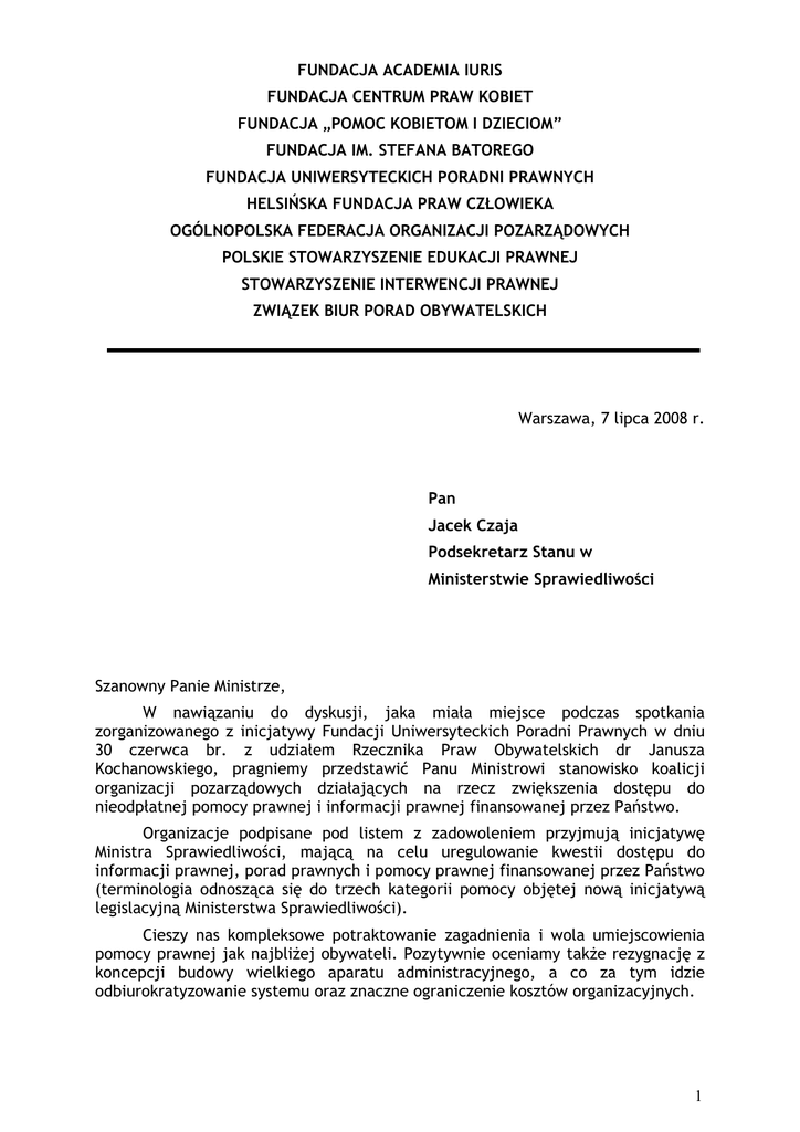 FUNDACJA ACADEMIA IURIS FUNDACJA CENTRUM PRAW KOBIET FUNDACJA „POMOC KOBIETOM I DZIECIOM” FUNDACJA IM. STEFANA BATOREGO FUNDACJA UNIWERSYTECKICH PORADNI PRAWNYCH HELSIŃSKA FUNDACJA PRAW CZŁOWIEKA OGÓLNOPOLSKA FEDERACJA ORGANIZACJI POZARZĄDOWYCH POLSKIE STOWARZYSZENIE EDUKACJI PRAWNEJ STOWARZYSZENIE INTERWENCJI PRAWNEJ ZWIĄZEK BIUR PORAD OBYWATELSKICH Warszawa, 7 lipca 2008 r. Pan Jacek Czaja Podsekretarz Stanu w Ministerstwie Sprawiedliwości Szanowny Panie Ministrze, W nawiązaniu do dyskusji, jaka miała miejsce podczas spotkania zorganizowanego z inicjatywy Fundacji Uniwersyteckich Poradni Prawnych w dniu 30 czerwca br. z udziałem Rzecznika Praw Obywatelskich dr Janusza Kochanowskiego, pragniemy przedstawić Panu Ministrowi stanowisko koalicji organizacji pozarządowych działających na rzecz zwiększenia dostępu do nieodpłatnej pomocy prawnej i informacji prawnej finansowanej przez Państwo. Organizacje podpisane pod listem z zadowoleniem przyjmują inicjatywę Ministra Sprawiedliwości, mającą na celu uregulowanie kwestii dostępu do informacji prawnej, porad prawnych i pomocy prawnej finansowanej przez Państwo (terminologia odnosząca się do trzech kategorii pomocy objętej nową inicjatywą legislacyjną Ministerstwa Sprawiedliwości). Cieszy nas kompleksowe potraktowanie zagadnienia i wola umiejscowienia pomocy prawnej jak najbliżej obywateli. Pozytywnie oceniamy także rezygnację z koncepcji budowy wielkiego aparatu administracyjnego, a co za tym idzie odbiurokratyzowanie systemu oraz znaczne ograniczenie kosztów organizacyjnych. 1 Z uwagi na to, że nie mogliśmy jeszcze zapoznać się z konkretnymi projektowanymi zapisami ustawowymi, chcielibyśmy w niniejszym piśmie zwrócić się do Pana Ministra z kilkoma uwagami wstępnymi. Uważamy za celowe, aby: 1. środowisko organizacji pozarządowych uczestniczyło w konsultacjach założeń do projektu ustawy na etapie, w którym możliwa jest jeszcze modyfikacja ogólnych wytycznych do ustawy bez konieczności ewentualnej zmiany gotowej konstrukcji. Zasadnym byłoby także, aby w dalszych pracach nad ustawą uczestniczyli nasi przedstawiciele, którzy wówczas chętnie szerzej omówią i uzasadnią nasze stanowisko; 2. projekt ustawy wyraźnie wskazywał na możliwość uczestniczenia organizacji pozarządowych i akademickich poradni prawnych w projektowanym systemie. Podmioty te były wymieniane we wcześniejszych projektach ustawy, a ich rola powinna być doceniona nie tylko ze względu na wieloletnie doświadczenie, ale także fachowość i specjalistyczną wiedzę. Z uwagi na dobro beneficjentów nowej regulacji wydaje się nieuzasadnionym pominięcie organizacji pozarządowych i akademickich poradni prawnych w systemie świadczenia informacji prawnej i porad prawnych; 3. uległ rozszerzeniu katalog uprawnionych do uzyskania bezpłatnej porady prawnej - proponujemy rozszerzenie go o osoby prowadzące indywidualną działalność gospodarczą oraz o organizacje pozarządowe, zgodnie z definicją zawartą w art. 3 ustawy o działalności pożytku publicznego i o wolontariacie; 4. utworzone zostało centralne ciało koordynujące działania związane z organizacją, weryfikacją jakości i ewaluacją funkcjonowania systemu. Proponujemy powołanie przez Ministra Sprawiedliwości opiniodawczodoradczej Rady Pomocy Prawnej i stworzenie komórki w Ministerstwie Sprawiedliwości, która zajmowałaby się kwestiami związanymi z pomocą prawną oraz koordynacją realizacji zaleceń Rady. W skład Rady, działającej na społecznych zasadach, mogliby wejść przedstawiciele korporacji prawniczych oraz organizacji pozarządowych udzielających porad prawnych. Do zadań komórki w ministerstwie należałyby także następujące zagadnienia: opracowywanie materiałów informacyjnych i poradniczych, prowadzenie bazy danych tych materiałów oraz ich dystrybucja, zlecanie badań działania systemu pomocy prawnej (socjologicznych, statystycznych, ewaluacji itp.), przygotowanie zaleceń, co do ewentualnych zmian mających podnieść efektywność systemu pomocy prawnej, zlecanie i koordynacja działalności szkoleniowej (np. szkolenia dla udzielających porad prawnych). Jako organ centralny komórka ta powinna także koordynować i zbierać dorobek różnych organizacji i instytucji, opracowujących materiały informacyjne i poradnicze (tworzyć bazy danych). Wreszcie powinna współpracować także z sądami (w których powstają punkty obsługi interesantów – jednostki o częściowo podobnych zadaniach) i prokuraturami; 5. minimum dochodów, od którego zależy przyznanie pomocy prawnej, było określone co najmniej na poziomie minimum socjalnego, gdyż w rzeczywistości ta grupa osób ma znacznie utrudniony dostęp do pomocy prawnej ze względu na bardzo ograniczone dochody. Ponadto uważamy, że należy uwzględnić sytuacje nadzwyczajne, takie jak, na przykład, sytuacje osób, które są ofiarami przemocy domowej, gdyż pomimo teoretycznie wyższych dochodów niż wymagane, mogą one faktycznie nie posiadać realnych możliwości skorzystania z tych środków; 2 6. skróceniu uległ termin na wydanie decyzji o przyznaniu darmowej porady czy pomocy prawnej, np. do 3 dni; 7. stworzono Fundusz Pomocy Prawnej, którego dysponentem byłaby Rada Pomocy Prawnej, a środki z funduszu przeznaczane byłyby na wsparcie działania systemu pomocy prawnej. Na konto tego Funduszu można byłoby przekazywać środki z darowizn i zapisów; nawiązki orzekane przez sądy; orzekane grzywny lub część grzywien. Wzorem Francji – konto Funduszu mogłoby być także tym kontem, na które wpłacano by środki z tytułu kaucji czy zabezpieczeń majątkowych, a które dotychczas były wpłacane do kasy sądów. Odsetki od zgromadzonych wpłat zasilałyby Fundusz. Można też rozważyć inne znane praktyce światowej sposoby zasilania wskazanego funduszu. Zwracamy się z prośbą o uwzględnienie wyżej wymienionych postulatów i deklaruj