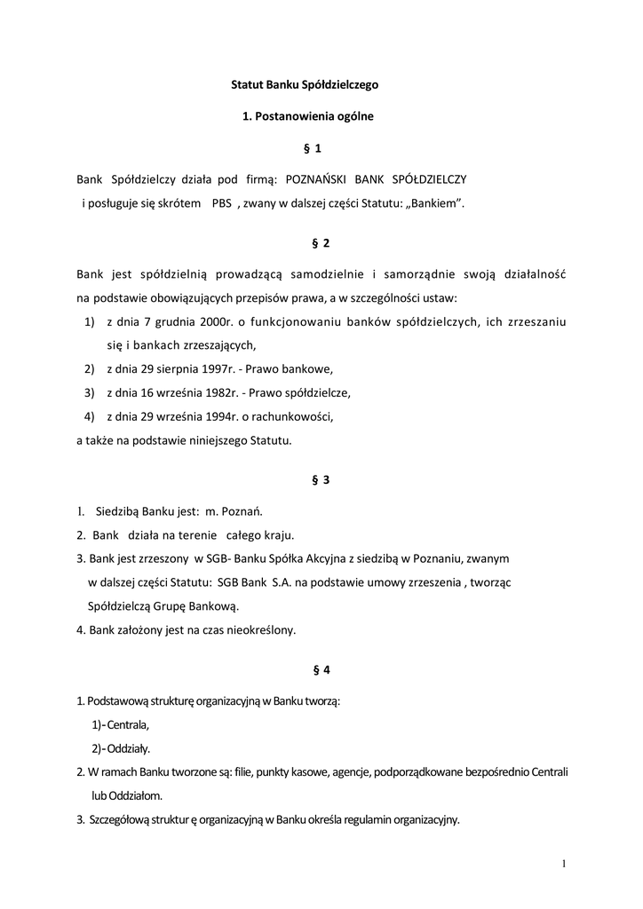 Statut Banku Spółdzielczego 1. Postanowienia ogólne §1 Bank Spółdzielczy działa pod firmą: POZNAŃSKI BANK SPÓŁDZIELCZY i posługuje się skrótem PBS , zwany w dalszej części Statutu: „Bankiem”. §2 Bank jest spółdzielnią prowadzącą samodzielnie i samorządnie swoją działalność na podstawie obowiązujących przepisów prawa, a w szczególności ustaw: 1) z dnia 7 grudnia 2000r. o funkcjonowaniu banków spółdzielczych, ich zrzeszaniu się i bankach zrzeszających, 2) z dnia 29 sierpnia 1997r. - Prawo bankowe, 3) z dnia 16 września 1982r. - Prawo spółdzielcze, 4) z dnia 29 września 1994r. o rachunkowości, a także na podstawie niniejszego Statutu. §3 1. Siedzibą Banku jest: m. Poznań. 2. Bank działa na terenie całego kraju. 3. Bank jest zrzeszony w SGB- Banku Spółka Akcyjna z siedzibą w Poznaniu, zwanym w dalszej części Statutu: SGB Bank S.A. na podstawie umowy zrzeszenia , tworząc Spółdzielczą Grupę Bankową. 4. Bank założony jest na czas nieokreślony. §4 1. Podstawową strukturę organizacyjną w Banku tworzą: 1)- Centrala, 2)- Oddziały. 2. W ramach Banku tworzone są: filie, punkty kasowe, agencje, podporządkowane bezpośrednio Centrali lub Oddziałom. 3. Szczegółową struktur ę organizacyjną w Banku określa regulamin organizacyjny. 1 2. Przedmiot działania § 5 1. Bank wykonuje następujące czynności bankowe: 1) przyjmowanie wkładów pieniężnych płatnych na żądanie lub z nadejściem oznaczonego terminu oraz prowadzenie rachunków tych wkładów, 2) prowadzenie innych rachunków bankowych, 3) udzielanie kredytów i pożyczek pieniężnych osobom fizycznym zamieszkującym lub prowadzącym przedsiębiorstwo na terenie działania Banku lub osobom prawnym i jednostkom organizacyjnym nieposiadającym osobowości prawnej a posiadającym zdolność prawną, mającym siedzibę lub jednostki organizacyjne na terenie działania Banku, 4) udzielanie, w zakresie i trybie uzgodnionym z SGB Bank S.A, gwarancji bankowych i poręczeń osobom fizycznym zamieszkującym lub prowadzącym przedsiębiorstwo na terenie działania Banku lub osobom prawnym i jednostkom organizacyjnym nieposiadającym osobowości prawnej a posiadającym zdolność prawną, mającym siedzibę lub jednostki organizacyjne na terenie działania Banku, 5) przeprowadzanie bankowych rozliczeń pieniężnych, 6) operacje czekowe i wekslowe, 7) wydawanie kart płatniczych oraz wykonywanie operacji przy ich użyciu, 8) nabywanie i zbywanie wierzytelności pieniężnych, 9) przechowywanie przedmiotów i papierów wartościowych oraz udostępnianie skrytek sejfowych, 10) prowadzenie skupu i sprzedaży wartości dewizowych, 11) pośrednictwo w dokonywaniu rozliczeń w kraju z nierezydentami. 2. Bank wykonuje następujące czynności bankowe w imieniu i na rzecz SGB Bank S.A.: 1) wydawanie kart płatniczych, 2) udzielanie kredytów. 3. Ponadto Bank wykonuje następujące czynności: 1) obejmuje lub nabywa akcje i prawa z akcji, udziały innej osoby prawnej i jednostki uczestnictwa w funduszach inwestycyjnych, przy czym każdorazowe objęcie 2 lub nabycie z wyłączeniem objęcia lub nabycia akcji, praw z akcji lub udziałów banków wymaga uzyskania zgody SGB Bank S.A., 2) dokonuje obrotu papierami wartościowymi, 3) dokonuje, na warunkach uzgodnionych z dłużnikiem, zamiany wierzytelności na składniki majątku dłużnika, z tym że Bank jest obowiązany do ich sprzedaży w okresie nie dłuższym niż: a) 5 lat od daty nabycia – w odniesieniu do nieruchomości, b) 3 lata od daty nabycia – w odniesieniu do pozostałych składników majątku, 4) nabywa i zbywa nieruchomości, 5) świadczy usługi konsultacyjno – doradcze w sprawach finansowych, 6) świadczy inne usługi finansowe w zakresie: a) przyjmowania i przekazywania zleceń nabycia lub zbycia jednostek uczestnictwa funduszy inwestycyjnych, b) pośrednictwa przy zawieraniu umów ubezpieczeniowych, c) działalności akwizycyjnej na rzecz otwartych funduszy emerytalnych, d) wykonywania w imieniu i na rzecz SGB Bank S.A. określonych w pełnomocnictwie tego Banku operacji związanych z pośrednictwem w dokonywaniu przekazów pieniężnych za granicę. 4. Obowiązek sprzedaży, o którym mowa w ust. 3 pkt 3 nie spoczywa na Banku jeżeli przejęte składniki majątku wykorzysta do prowadzenia własnej działalności bankowej. 3. Członkowie, ich prawa i obowiązki §6 1. Członkiem Banku może być: 1) osoba fizyczna mająca pełną zdolność do czynności prawnych, 2) osoba prawna. 2. Warunkiem przyjęcia na członka Banku jest złożenie podpisanej przez wnioskodawcę pisemnej deklaracji. O przyjęciu w poczet członków Banku decyduje Zarząd podejmując uchwałę w tym przedmiocie w terminie 30 dni od dnia złożenia deklaracji. 3 3. Zainteresowany powinien zostać powiadomiony pisemnie o uchwale o przyjęciu w poczet członków Banku lub uchwale odmawiającej przyjęcia, w terminie 14 dni od jej podjęcia. Zawiadomienie o odmowie przyjęcia powinno zawierać uzasadnienie. 4. Zainteresowanemu przysługuje prawo wniesienia do Rady pisemnego odwołania od uchwały odmawiającej przyjęcia w poczet członków Banku w terminie 14 dni od dnia jej otrzymania. 5. Rada zobowiązana jest do rozpatrzenia odwołania w terminie 90 dni od daty otrzymania odwołania przez Bank. Decyzja Rady jest ostateczna. 6. Uchwały o przyjęciu lub odmowie przyjęcia w poczet członków Banku wchodzą w życie z dniem podjęcia. 7. Deklaracja zawiera: 1) w przypadku osoby fizycznej: imię, nazwisko, miejsce zamieszkania, wykonywany zawód, 2) w przypadku osoby prawnej: nazwę, siedzibę, informację o statusie prawnym wynikającą z wypisu z właściwego rejestru lub ewidencji. 8. Ponadto w deklaracji powinny znaleźć się informacje o ilości zadeklarowanych udziałów, ewentualnie może być wskazana osoba, której po śmierci członka Banku należy wypłacić udziały. 9. Rejestr członków prowadzi Zarząd . W rejestrze ewidencjonuje