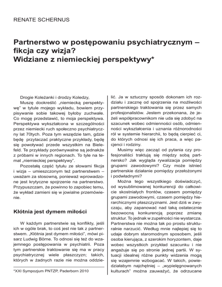 130 Renate Schernus RENATE SCHERNUS Partnerstwo w postępowaniu psychiatrycznym – fikcja czy wizja? Widziane z niemieckiej perspektywy* Drogie Koleżanki i drodzy Koledzy, Muszę dookreślić „niemiecką perspektywę” w tytule mojego wykładu, bowiem przypisywanie sobie takowej byłoby zuchwałe. Co mogę przedstawić, to moja perspektywa. Perspektywa wykształcona w szczególności przez niemiecki ruch społeczno psychiatryczny lat 70tych. Poza tym wszędzie tam, gdzie będę przytaczać praktyczne przykłady, będę się powoływać przede wszystkim na Bielefeld. Te przykłady porównywalne są jednakże z próbami w innych regionach. To tyle na temat „niemieckiej perspektywy”. Pozostałą część tytułu ze słowami fikcja i wizja – umieszczonym też partnerstwem – uważam za stosowną, ponieważ wprowadzone jest krytyczne spojrzenie na partnerstwo. Przypuszczam, że powinno to zapobiec temu, że wykład zamieni się w jowialne przemówienie. Kłótnia jest dymem miłości W każdym partnerstwie są konflikty, jeśli ich w ogóle brak, to coś jest nie tak z partnerstwem. „Kłótnia jest dymem miłości”, mówi pisarz Ludwig Börne. To odnosi się też do wzajemnego postępowania w psychiatrii. Poza tym partnerskie traktowanie się ma w pracy psychiatrycznej wiele płaszczyzn; takich, których w żadnych razie nie można oddzie*XXI Sympozjum PNTZP, Paderborn 2010 lić. Ja w sztuczny sposób dokonam ich rozdziału i zacznę od spojrzenia na możliwości partnerskiego traktowania się przez samych profesjonalistów. Jestem przekonana, że jeżeli współpracownikom nie uda się zdobyć na szacunek wobec odmienności osób, odmienności wykształcenia i uznania różnorodności ról w systemie hierarchii, to będą cierpieć ci, do których odnosi się ich praca, a więc pacjenci i rodziny. Musimy więc zacząć od pytania czy profesjonaliści traktują się między sobą partnersko? Jak wygląda rywalizacja pomiędzy grupami zawodowymi? Czy może istnieć partnerskie działanie pomiędzy przełożonymi i podwładnymi? Można tego wszystkiego doświadczyć, od wysublimowanej konkurencji do całkowicie skostniałych frontów, czasem pomiędzy grupami zawodowymi, czasem pomiędzy hierarchicznymi płaszczyznami. Jest dziś w zwyczaju, aby zapanować nad taką ostatecznie bezowocną konkurencją poprzez zmianę struktur. To jednak w zupełności nie wystarcza. Partnerstwa nie można tak po prostu strukturalnie narzucić. Według mnie najlepiej się to udaje dobrym staromodnym sposobem, jeśli osoba kierująca, z szerokim horyzontem, daje wobec wszystkich przykład szacunku i nie angażuje się po stronie jednej partii. W sytuacji idealnej różne punkty widzenia mogą się wzajemnie wzbogacać. W takich, powiedziałabym najchętniej – „wypielęgnowanych kulturach” można zauważyć, że odrzucane Partnerstwo w postępowaniu psychiatrycznym jest pasywne zachowanie, współpracownicy respektują specyfikę innej grupy zawodowej a perspektywę innej osoby doświadczają jako uzupełnienie własnego działania. Temat „konflikty i konkurencja pomiędzy różnymi grupami zawodowymi” można odmieniać bez końca i opatrywać przykładami: pomiędzy pracownikami lekarzami i pielęgniarkami a psychologami, pielęgniarkami a lekarzami lub pomiędzy psychologami a lekarzami, itd. Zostawmy to; tylko na jedno zwróćmy uwagę: w wyniku partnerskiej współpracy z innymi grupami zawodowymi lekarze w Niemczech znacznie się poprawili – przynajmniej w znanych mi obszarach społeczno- psychiatrycznych. Znam jeszcze czasy, kiedy ordynator z całą powagą sądził, że tylko psychiatrzy są w stanie rozmawiać z chorymi na psychozę ludźmi, abstrahując od tego, że pogłębione rozmowy z nimi uważane były za raczej szkodliwe. Jeszcze jedno słowo na temat ważnego dla mnie aspektu odpowiedzialności kierownika. Znam wizjonersko uzdolnionych szefów, wspaniale angażujących się politycznie na rzecz „umacniania” (empowerment) i innych super partnerskich koncepcji odnoszących się do osób „mających doświadczenie z psychiatrią” (beneficjentów), którzy zapominają, że równolegle do wzmocnienia emancypacji pacjentów powinna zostać rozpoznana, jako zadanie, emancypacja pracowników. Jedno bez drugiego jest według mnie niemożliwe. Do partnerstwa należy też, aby pracownicy nie tylko odważnie, ale również troskliwie obchodzili się ze swoimi przełożonymi i nie wykorzystywali ich jako „projekcyjnych ekranów” dla konfliktów z autorytetem. A dalej, profesjonaliści muszą w interesie własnych klientów (beneficjentów) wykorzystać swoje partnerskie uzdolnienia i wyjść poza wąskie ramy swojej własnej instytucji. Hasłem jest w Niemczech „Gminny Związek Psychiatrii Środowiskowej” (po reformie opieki psychiatrycznej w Niemczech w każdej niemieckiej gminie/powiecie powstał związek na rzecz współpracy wszystkich instytucji zaangażowanych na różnych poziomach – rodzina, mieszkanie, czas wolny i praca – w pomoc osobom chorującym psychicznie). W mojej ocenie można go stwo- 131 rzyć tylko wówczas jeśli: 1. nie będzie polecony strukturalnie, odgórnie, lecz będzie rozwijał się stopniowo 2. idea partnerskiej współpracy nie zostanie popsuta przez rosnącą rywalizację opieki psychiatrycznej i pomocy społecznej. „Uwolnienie rodziny“ – odkrycie obecności krewnych Podejmując temat relacji partnerskich trzeba zacząć od kilku spostrzeżeń o krewnych osób chorujących psychicznie. Konieczne konflikty, które muszą istnieć w każdym partnerstwie, mogły wystąpić pomiędzy profesjonalistami i krewnymi dopiero wówczas, kiedy ci ostatni zostali zauważeni i poważnie potraktowani. Pierwsze próby w Niemczech można wiązać z rokiem 1982. Przedtem krewni czuli się nierzadko jak więźniowie, więźniowie profesjonalnych ideologii. Nie bez powodu opublikowana przez Dörner’a i jego współpracowników książka nosiła