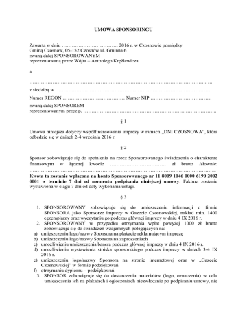 UMOWA SPONSORINGU Zawarta w dniu ……………………………. 2016 r. w Czosnowie pomiędzy Gminą Czosnów, 05-152 Czosnów ul. Gminna 6 zwaną dalej SPONSOROWANYM reprezentowaną przez Wójta – Antoniego Kręźlewicza a ……………………………………………………………………………………………..…. z siedzibą w ……….…………………………………………….…………………………… Numer REGON …………………..…………… Numer NIP ………………………………. zwaną dalej SPONSOREM reprezentowanym przez p. …………………………………………………….……………….. §1 Umowa niniejsza dotyczy współfinansowania imprezy w ramach „DNI CZOSNOWA”, która odbędzie się w dniach 2-4 września 2016 r. §2 Sponsor zobowiązuje się do spełnienia na rzecz Sponsorowanego świadczenia o charakterze finansowym w łącznej kwocie ……………………………. zł brutto /słownie: ………………………………………………………………………………………………….. Kwota ta zostanie wpłacona na konto Sponsorowanego nr 11 8009 1046 0000 6190 2002 0001 w terminie 7 dni od momentu podpisania niniejszej umowy. Faktura zostanie wystawiona w ciągu 7 dni od daty wykonania usługi. §3 1. SPONSOROWANY zobowiązuje się do umieszczeniu informacji o firmie SPONSORA jako Sponsorze imprezy w Gazecie Czosnowskiej, nakład min. 1400 egzemplarzy oraz wyczytaniu go podczas głównej imprezy w dniu 4 IX 2016 r. 2. SPONSOROWANY w przypadku otrzymania wpłat powyżej 1000 zł brutto zobowiązuje się do świadczeń wzajemnych polegających na: a) umieszczeniu logo/nazwy Sponsora na plakacie reklamującym imprezę b) umieszczeniu logo/nazwy Sponsora na zaproszeniach c) umożliwieniu umieszczenia banera podczas głównej imprezy w dniu 4 IX 2016 r. d) umożliwieniu wystawienia stoiska sponsorskiego podczas imprezy w dniach 3-4 IX 2016 r. e) umieszczeniu logo/nazwy Sponsora na stronie internetowej oraz w „Gazecie Czosnowskiej” w formie podziękowań f) otrzymaniu dyplomu – podziękowań 3. SPONSOR zobowiązuje się do dostarczenia materiałów (logo, oznaczenia) w celu umieszczenia ich na plakatach i ogłoszeniach niezwłocznie po podpisaniu umowy, nie później niż do 12 sierpnia 2016 r. oraz dostarczenia ewentualnego banera do dnia 31 sierpnia 2016 r. §4 Strony niniejszej umowy wyznaczą po jednym przedstawicielu odpowiedzialnym za współdziałanie i czuwanie nad właściwą realizacją postanowień umowy w trakcie trwania imprezy: 1) ze strony Sponsorowanego Pani Katarzyna Chojnacka tel. 22 785 00 02 w. 172 e-mail: [email protected] 2) ze strony Sponsora Pan/Pani ….................................................... tel …......................... e-mail …………………………............... §5 Strony niniejszej umowy zobowiązują się do wzajemnego poszanowania swoich interesów i udzielania sobie wszelkich informacji niezbędnych do prawidłowego wykonania postanowień umowy. §6 1. Umowa wygasa po wywiązaniu się stron ze wszystkich zobowiązań wynikających z zawartego kontraktu. 2. Umowa wygasa również w przypadku braku stwierdzenia wpłaty przez Sponsora w terminie określonym w § 2 niniejszej umowy. §7 Wszelkie zmiany i uzupełnienia niniejszej umowy wymagają zgody obu stron i zachowania formy pisemnej pod rygorem nieważności. §8 W sprawach nieuregulowanych w umowie będą miały zastosowanie przepisy kodeksu cywilnego. §9 Umowę spisano w dwóch egzemplarzach, jeden dla SPONSORA i jeden dla SPONSOROWANEGO. § 10 Spory pomiędzy stronami rozstrzyga właściwy miejscowo i rzeczowo Sąd dla siedziby SPONSOROWANEGO. SPONSOR SPONSOROWANY