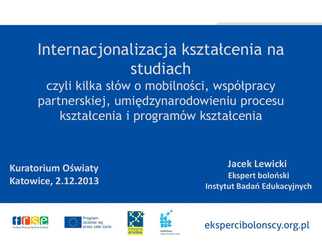Internacjonalizacja kształcenia na studiach czyli kilka słów o mobilności, współpracy partnerskiej, umiędzynarodowieniu procesu kształcenia i programów kształcenia Kuratorium Oświaty Katowice, 2.12.2013 Jacek Lewicki Ekspert boloński Instytut Badań Edukacyjnych Definicja „Internacjonalizacja to proces integrowania wymiaru międzynarodowego, międzykulturowego i globalnego z celem, funkcjami i sposobami działania szkół wyższych” (Jane Knight, 2003) WYMIAR MIĘDZYNARODOWY /EUROPEJSKI/ Ważny od zarania dziejów: • Dla indywidualnego toku kształcenia (od średniowiecza do XX w.) • Także dla instytucjonalnego podejścia do kształcenia (od początku lat 80. XX w.) - przejście od procesów reaktywnych do strategii proaktywnych - od wartości dodanej (value added) do działań w głównym nurcie (mainstream) - od współpracy do konkurowania między HEIs - komercjalizacja [J. Urbanikowa] WYMIAR MIĘDZYNARODOWY Tradycja umiędzynarodowienia środowiska akademickiego w dzisiejszych czasach nabiera nowego wymiaru, nowych form, a przede wszystkim zmienia się skala zjawiska. INTERNACJONALIZACJA • Klasyczna (mobilność i współpraca partnerska) - Credit mobility -> pozioma - Degree mobility -> pionowa • „w domu” - Umiędzynarodowienie procesu kształcenia i programów kształcenia [J. Urbanikowa] MOBILNOŚĆ • migracje (dobrowolne jak i wymuszone) towarzyszą ludzkości od samego początku • przez wieki wyjazdy zagraniczne stanowiły ważny element rozwoju gospodarczego, kulturowego i edukacyjnego • mobilność zawodowa oraz akademicka (edukacyjna) nabrała nowego wymiaru wraz z integracją europejską MOBILNOŚĆ POZIOMA (credit mobility) Mobilność edukacyjna w ramach danego poziomu kształcenia w ramach której osoby uczące się uzyskują część efektów uczenia się poza macierzystą szkołą. np. tradycyjna mobilność międzynarodowa studentów w formie jedno- lub dwusemestralne studiowania za granicą. Przykłady: program Erasmus , wymiany w ramach umów bilateralnych ERASMUS • Erasmus od 1987 r. • Pierwszy przewodnik po systemie ECTS w 1989 r. • Projekty programu TEMPUS realizowane w latach 1990 – 2000 • Erasmus w Polsce od 1998 r. • Dofinansowanie na opracowywanie pakietów informacyjnych ECTS (Socrates-Erasmus) • Działalność Doradców ECTS → Promotorów ECTS → Ekspertów Bolońskich • Utworzenie Europejskiego Obszaru Szkolnictwa Wyższego 2010 r. [FRSE] ERASMUS w Europie [FRSE] ERASMUS Program Erasmus to szereg działań związanych z mobilnością: • Mobilność studentów w ramach studiów – część studiów odbywa się za granicą (SMS) • Mobilność studentów w ramach praktyk zawodowych (SMP) • Mobilność kadry uczelnianej: wyjazdy dydaktyczne i szkoleniowe ERASMUS to także: • Kursy intensywne dla studentów (min. 3 uczelnie z 3 państw) • Intensywne kursy językowe • Promowanie dobrych rozwiązań w zakresie systemu akumulowania i transferu osiągnięć ECTS – ECTS label ERASMUS Wyjazdy w ramach Erasmusa: - Są szansą na zdobycie nowych kompetencji społecznych i językowcyh - Są poznaniem innych kultur - Są szansą na „wzbogacenie” własnych studiów i CV - Są „szkołą życia” - Dla studentów stacjonarnych i niestacjonarnych po I r. - NIE są wakacjami - NIE są darmowymi studiami za granicą (stypendium jest tylko wspraciem mającym zniwelować różnice w kosztach utrzymania) ERASMUS W listopadzie 2013 r. Parlament Europejski przyjął program Erasmus + Erasmus + zastępuje dotychczasowych 7 programów. budżet ma wynieść 14,7 mld euro skorzystać ma 4-5 mln osób ponad 115 tys. instytucji MOBILNOŚĆ PIONOWA (degree mobility) Mobilność edukacyjna polegająca odbywaniu kolejnych etapów kształcenia w innych miejscach. np. studia licencjackie w rodzimym kraju, a magisterskie za granicą Często wpływ na decyzję o kontynuowaniu studiów za granicą ma udział w wymianie Erasmusa, ale rośnie liczba maturzystów rekrutujących się na pierwsze studia poza Polską. MOBILNOŚĆ PIONOWA (degree mobility) Wybór miejsca i kierunku: - lokalizacja (koszty utrzymania, odpłatność za studia) - kontakt z biurami ds. studentów zagranicznych - zasady rekrutacji (kontakt z uczelnią lub krajową agencją np. w W. Bryt. UCAS) - egzaminy językowe / certyfikaty możliwość pracy, ubezpieczenie [M. Wilczyński] Internacjonalizacja „w domu” • • • • Programy studiów w językach obcych Wspólne programy (np. podwójny dyplom) Kursy w językach obcych Kadra wizytująca z zagranicy (ale także wyjazdy naszych wykładowców) • Etatowi wykładowcy cudzoziemcy • • • • Studenci cudzoziemcy Szkoły letnie Badania naukowe E-learning , „wirtualna mobilność” Internacjonalizacja „w domu” Coraz więcej uczelni wyższych pozyskuje środki z funduszy unijnych i innych (np. fundusz wyszehradzki) na studia w językach obcych przygotowywanych we współpracy międzynarodowej. Nieraz studia takie mają wpisany w program semestr w jednostce partnerskiej. WSPÓŁCZESNY KONTEKST INTERNACJONALIZACJI - Umasowienie kształcenia na studiach wyższych - Kształcenie na potrzeby różnych sektorów i branż - Rola badań naukowych w rozwoju gospodarczym - Globalizacja - Nowe technologie - Integracja europejska - Otwarty rynek szkolnictwa wyższego POWODY INTERNACJONALIZACJI • POLITYCZNE np. proces boloński • EKONOMICZNE np. rynek pracy, korporacje ponadnarodowe • SPOŁECZNE I KULTUROWE np. ciekawość świata, globalna kultura popularna • AKADEMICKIE np. współpraca przy badaniach naukowych nie wykluczają się WADY I ZALETY INTERNACJONALIZACJI - „drenaż mózgów” - nieuczciwa konkurencja - koszty - skutki psychologiczne - trudności organizacyjne + nowa polityka językowa + elastyczność studiów + standardy międzynarodowe + skutki psychologiczne + nowe rynki PROCES BOLOŃSKI • Wskaźnik: 20% absolwentów EOSzW do 2020 r. powinno mieć za sobą okres studiów za