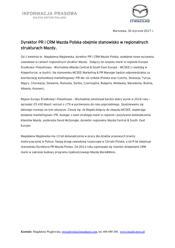 Warszawa, 30 stycznia 2017 r. Dyrektor PR i CRM Mazda Polska obejmie stanowisko w regionalnych strukturach Mazdy. Od 1 kwietnia br. Magdalena Węglewska, dyrektor PR i CRM Mazda Polska, podejmie nowe wyzwania zawodowe w ramach regionalnych struktur Mazdy. Dołączy do zespołu marki w regionie Europa Środkowa i Południowo - Wschodnia (Mazda Central & South East Europe – MCSEE) z siedzibą w Klagenfurcie, w Austrii. Na stanowisku MCSEE Marketing & PR Manager będzie odpowiedzialna za koordynację komunikacji marketingowej i PR dla 16 rynków (Polska oraz Czechy, Słowacja, Turcja, Węgry, Chorwacja, Słowenia, Rumunia, Serbia, Czarnogóra, Bułgaria, Mołdawia, Macedonia, Bośnia, Albania, Kosowo). Region Europy Środkowej i Południowo – Wschodniej zanotował bardzo dobry wynik w 2016 roku – sprzedaż 25 430 Mazd i wzrost o 17% w porównaniu do roku poprzedniego. Spodziewamy się dalszego rozwoju na tym obszarze. Cieszę się, że Magda dołączy do zespołu MCSEE, wspierając działania marketingowe i PR, budując z nami strategię marki w regionie i pozytywne doświadczenia Klientów Mazdy, podkreśla David McGonigle, dyrektor regionalny Mazda Central & South East Europe. Magdalena Węglewska ma 13 lat doświadczenia w pracy dla działów prasowych branży motoryzacyjnej w Polsce. Swoją drogę zawodową rozpoczęła w Citroën Polska, a od 9 lat obejmuje stanowisko Dyrektora PR Mazda Polska. Od 2013 roku zajmowała się również działaniami CRM marki w zakresie budowy programu lojalnościowego Mazda More&More. Kontakt: Magdalena Węglewska, [email protected], tel. 606 600 260, www.mazda-press.pl
