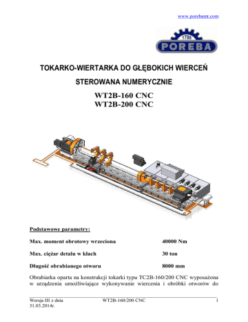 www.porebamt.com TOKARKO-WIERTARKA DO GŁĘBOKICH WIERCEŃ STEROWANA NUMERYCZNIE WT2B-160 CNC WT2B-200 CNC Podstawowe parametry: Max. moment obrotowy wrzeciona 40000 Nm Max. ciężar detalu w kłach 30 ton Długość obrabianego otworu 8000 mm Obrabiarka oparta na konstrukcji tokarki typu TC2B-160/200 CNC wyposażona w urządzenia umożliwiające wykonywanie wiercenia i obróbki otworów do ___________________________________________________________________________ Wersja III z dnia WT2B-160/200 CNC 1 31.03.2014r. www.porebamt.com długości 8000 mm z wykorzystaniem wysokowydajnych specjalistycznych narzędzi. Zastosowanie obrabiarki w procesach, gdzie oprócz podstawowych procesów toczenia wymagane jest wykonywanie długich otworów metodą wiercenia i wytaczania. PRZEZNACZENIE OBRÓBCZE Tokarko-wiertarka WT2B-160/200 CNC przeznaczona jest do wykonywania długich otworów oraz do toczenia zewnętrznego i wewnętrznego, rozwiercania, kształtowego nacinania gwintów. Wysokie walory i trwałość obrabiarki zagwarantowane są poprzez zastosowanie sprawdzonych w użytkowaniu układów napędowych i elementów sterowania. 1 Charakterystyka ogólna obrabiarki 1.1 łoże trójprowadnicowe odlewane z żeliwa o podwyższonych własnościach wytrzymałościowych, znormalizowane, dobrze użebrowane, wsparte na podłożu na całej długości; 1.2 suport wzdłużny przesuwa się po dwóch prowadnicach zapewniających doskonałe precyzyjne prowadzenie; 1.3 prowadnice łoża i suportu są hartowane do twardości min 45 HRC; 1.4 przesuw suportu wzdłużnego i poprzecznego odbywa się po prowadnicach wyłożonych materiałem przeciwciernym i wspomagany jest centralnym smarowaniem; 1.5 korpus wrzeciennika odlewany z żeliwa o podwyższonych własnościach wytrzymałościowych; 1.6 wrzeciono wsparte na łożyskach o podwyższonej klasie dokładności; 1.7 wszystkie wałki i koła zębate nawęglane, hartowane i szlifowane; 1.8 głowica ciśnieniowa do doprowadzenia czynnika chłodzącego do wiercenia na niezależnej płycie; ___________________________________________________________________________ Wersja III z dnia WT2B-160/200 CNC 2 31.03.2014r. www.porebamt.com 1.9 suport wiertniczy z obejmą dla drągów narzędziowych z tulejami umożliwiającymi mocowanie różnych średnic; 1.10 podtrzymki tłumiące dla drągów narzędziowych niwelujące drgania powstające podczas wiercenia; 1.11 system hydrauliczny do wytwarzania strumienia cieczy chłodzącej do wiercenia ze zbiornikiem 10000 l 2 Wykonanie standard 2.1 2.2 2.3 2.4 2.5 2.6 2.7 średnica przelotu nad łożem Ø 1600 (WT2B-160 CNC); długość toczenia 3-20 m, co 1m; suport wsparty na dwóch prowadnicach; moc napędu głównego 75 kW (praca ciągła); obroty wrzeciona 0,5-250 obr/min; zasilanie 3x400/50 Hz; system sterowania numerycznego GE FANUC 0i-TD z Manual Guide i z podstawowymi funkcjami toczenia i mocą napędu głównego 71kW; automatyczna głowica narzędziowa 4-ro pozycyjna; przesuw osi Z realizowany z bezluzowej przekładni zębatej; ruch suportu poprzecznego (oś X) realizowany za pomocą śruby kulowej; automatyczna zmiana zakresu prędkości obrotowych wrzeciennika; centralne smarowanie zarządzane przez CNC; konik wiertniczy ze stałym narzędziem; suport głowicy ciśnieniowej z obsadą; konik z pinolą Ø 280 mm z obrotowym wrzecionem, wskaźnikiem siły docisku i kompensacją wydłużenia przedmiotu, z automatyzowanym wysuwem pinoli i przesuwem po łożu; kieł stały - 2 szt.; pulpit sterowniczy; kliny ustawcze do poziomowania i śruby do zakotwiczenia na fundamencie; certyfikat CE; instrukcja użytkowania 2.8 2.9 2.10 2.11 2.12 2.13 2.14 2.15 2.16 2.17 2.18 2.19 2.20 ___________________________________________________________________________ Wersja III z dnia WT2B-160/200 CNC 3 31.03.2014r. www.porebamt.com 3 Wykonanie opcjonalne 3.1 3.2 3.3 3.4 3.5 średnica przelotu nad łożem Ø 2000 (WT2B-200 CNC); wrzeciono z końcówką A1-20; obroty wrzeciona 0,6-315 obr/min; -----------------------------------------------------------------------------------system sterowania numerycznego SIEMENS SINUMERIK 840D sl z mocą napędu głównego 71 kW (praca ciągła): Opcje: 3.5.1 Shop Turn – podstawowe funkcje toczenia; 3.5.2 PCU 50.3; 3.5.3 opcje językowe; 3.5.4 symulacje w czasie rzeczywistym; 3.5.5 symulacje 3D; 3.6 system sterowania numerycznego SIEMENS SINUMERIK 840D sl z mocą napędu głównego 100 kW (praca ciągła); Opcje: 3.6.1 Shop Turn – podstawowe funkcje toczenia; 3.6.2 PCU 50.3; 3.6.3 opcje językowe; 3.6.4 symulacje w czasie rzeczywistym; 3.6.5 symulacje 3D; 3.7 automatyczna głowica narzędziowa z napędzanym narzędziem (napęd CNC) i sterowaną osią C realizowaną z silnika głównego; 3.7.1 opcje dla narzędzia obrotowego – zależne od wykorzystywanej technologii do uzgodnienia; 3.8 automatyczna głowica narzędziowa z napędzanym narzędziem (napęd CNC), osią Y (napęd CNC) i sterowaną osią C realizowaną z silnika głównego; 3.8.1 opcje dla narzędzia obrotowego – zależne od wykorzystywanej technologii do uzgodnienia; 3.9 suport 2-deskowy; 3.10 liniowy układ pomiarowy w osi Z i X; 3.11 system pomiarowy narzędzia i przedmiotu: 3.11.1 cykle pomiarowe według zapotrzebowania klienta; 3.12 klimatyzacja szafy sterowniczej; 3.13 nakładki stalowe na prowadnicach łoża hartowane do twardości min 56HRC i szlifowane; 3.14 inne wykonania wg ustaleń z klientem 4 Wyposażenie dodatkowe ___________________________________________________________________________ Wersja III z dnia WT2B-160/200 CNC 4 31.03.2014r. www.porebamt.com 4.1 4.2 4.3 4.4 4.5 4.6 4.7 4.8 podtrzymka stała Ø 100-400; podtrzymka stała Ø 250-600; podtrzymka stała C Ø 150-700; podtrzymka stałą C Ø 400-800; podtrzymka stałą C Ø 700-1000; podtrzymka otwarta Ø 1100-1600 nie mija się z suportem; uchwyt tokarski 4-ro szczękowy Ø 1600; głowica szlifierska 5,5 kW dla automatycznej głowicy narzędziowej 4-ro pozycyjnej; 4.9 głowi