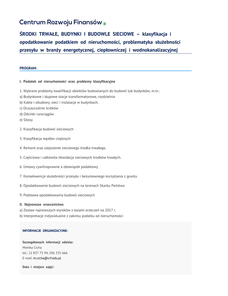 ŚRODKI TRWAŁE, BUDYNKI I BUDOWLE SIECIOWE – klasyfikacja i opodatkowanie podatkiem od nieruchomości, problematyka służebności przesyłu w branży energetycznej, ciepłowniczej i wodnokanalizacyjnej PROGRAM: I. Podatek od nieruchomości oraz problemy klasyfikacyjne 1. Wybrane problemy kwalifikacji obiektów budowlanych do budowli lub budynków, m.in.: a) Budynkowe i słupowe stacje transformatorowe, rozdzielnie b) Kable i obudowy, sieci i instalacje w budynkach. c) Oczyszczalnie ścieków d) Odcinki rurociągów e) Silosy 2. Klasyfikacja budowli sieciowych 3. Klasyfikacja węzłów cieplnych 4. Remont oraz ulepszenie sieciowego środka trwałego. 5. Częściowa i całkowita likwidacja sieciowych środków trwałych. 6. Umowy cywilnoprawne a obowiązek podatkowy 7. Konsekwencje służebności przesyłu i bezumownego korzystania z gruntu 8. Opodatkowanie budowli sieciowych na terenach Skarbu Państwa 9. Podstawa opodatkowania budowli sieciowych II. Najnowsze orzecznictwo a) Zestaw najnowszych wyroków z tezami orzeczeń na 2017 r. b) Interpretacje indywidualne z zakresu podatku od nieruchomości INFORMACJE ORGANIZACYJNE: Szczegółowych informacji udziela: Monika Cicha tel.: 22 837 75 94, 506 335 666 E-mail: [email protected] Data i miejsce zajęć: 23 luty 2017 r. Poznań 2 marzec 2017 r. Warszawa 14 marzec 2017 r. Katowice Godziny zajęć:10.00-16.00 Cena obejmuje:uczestnictwo w szkoleniu, autorskie materiały szkoleniowe przygotowane przez trenera, zaświadczenie, lunch, przerwy kawowe PROMOCJA: 550 zł od każdej kolejnej osoby z firmy Koszt szkolenia: od jednej osoby - 590 zł + VAT* * cena bez VAT dla opłacających szkolenie w co najmniej 70% ze środków publicznych Płatności prosimy dokonać po otrzymaniu potwierdzenia na konto: ALIOR BANK S.A. 98 2490 0005 0000 4500 6222 8867 Uprzejmie prosimy na przelewie umieścić temat, datę szkolenia oraz nazwiska uczestników. Zgłoszenia prosimy nadsyłać faksem na nr 22 203 62 18 lub mailem [email protected] Warunki rezygnacji:Rezygnację przyjmujemy najpóźniej na 7 dni przed szkoleniem w formie pisemnej. Rezygnacja w późniejszym terminie wiąże się z koniecznością pokrycia kosztów w 100%. Nieobecność na szkoleniu nie zwalnia z dokonania opłaty.