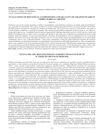 Zbigniew WASILEWSKI Instytut Technologiczno-Przyrodniczy w Falentach, Zakad Uytków Zielonych Al. Hrabska 3, Falenty, 05-090 Raszyn e-mail: [email protected] EVALUATION OF BOTANICAL COMPOSITION AND QUALITY OF GRAZED SWARD IN THREE HABITAT GROUPS Summary Poland is seen as the country boasting a richness of quantitative and qualitative resources of widely understood biodiversity, especially on grasslands. This is part of objectives of the Common Agricultural Policy for the period after 2013 where the high priority was given to maintain the richness of biodiversity. The easiest way to preserve and protect, especially in extreme habitat conditions, is grazing by animals. This method of agricultural utilization of green areas is very effective, cheap and simple to use. Abandoned and not utilized lands quickly undergo degradation process which involves weeds and shrubs development that on major areas is already well advanced. The study was conducted on grasslands located in eight habitats: three dry habitats, two post-peatland habitats and three flooded habitats. Grasses dominated in the sward of all habitats, then herbs and weeds. The share of legumes was low. In case of dry and post-peatland habitats it were grasslands communities and in case of flooded habitats - grass-rush communities. Using the phyto-indication method, the moisture status of habitats was determined and they were qualified to fresh and moist and highly humid and wet. The calculated utilization value number (Lwu) of sward indicated that in terms of feed value the most valuable plant communities were found in dry ground and post-peatland habitats (good utilization value) but of small value - in the flooded (poor value). Their value resulting from chemical composition and especially from the content of crude protein and crude fiber shaped conversely. Key words: meadow sward; habitats; botanical composition; field experimentation OCENA SKADU BOTANICZNEGO I JAKOCI SPASANYCH RUNI W TRZECH GRUPACH SIEDLISK Streszczenie Polska postrzegana jest jako kraj szczyccy si bogactwem ilociowym i jakociowym zasobów szeroko rozumianej biorónorodnoci, w tym zwaszcza na uytkach zielonych. Powysze wpisuje si w zaoenia Wspólnej Polityki Rolnej na lata po 2013 r. gdzie wysok rang nadano zachowaniu bogactwa biorónorodnoci. Najprostszym sposobem jej zachowania i ochrony, zwaszcza w ekstremalnych warunkach siedliskowych, jest wypas zwierzt. Taki sposób rolniczego wykorzystania terenów zadarnionych jest bardzo efektywny, tani i prosty w stosowaniu. Uytki porzucone i nie uytkowane szybko podlegaj procesowi degradacji wyraajcej si zachwaszczeniem i zakrzaczeniem runi, który na znacznych powierzchniach jest ju mocno zaawansowany. Badania prowadzono na uytkach zielonych pooonych w omiu siedliskach: trzech grdowych, dwóch pobagiennych i trzech gowych. We wszystkich siedliskach dominoway w runi trawy, nastpnie zioa i chwasty. Udzia rolin bobowatych by niewielki. W przypadku siedlisk grdowych i pobagiennych byy to zbiorowiska rolinne trawiaste, a w przypadku gowych trawiasto-szuwarowe. Wykorzystujc metod fitoindykacji, okrelono stan uwilgotnienia siedlisk i zakwalifikowano je do wieych i wilgotnych oraz do silnie wilgotnych i mokrych. Wyliczone liczby wartoci uytkowej runi (Lwu) wskazuj, e najwartociowsze, pod wzgldem paszowym, zbiorowiska rolinne stwierdzono w siedliskach grdowych i pobagiennych (warto uytkowa dobra) natomiast maowartociowe w gowych (warto mierna). Odwrotnie ukadaa si ich warto na podstawie skadu chemicznego, a zwaszcza zawartoci biaka ogólnego i wókna surowego. Sowa kluczowe: ru kowa; siedliska; skad botaniczny; badania polowe • gospodarstwa rodzinne, z rónych wzgldów (politycznych, ekonomicznych), nie rozwijay si na wzór farmerski (tworzenie wielkoobszarowych i specjalistycznych gospodarstw), • wyjtkowe zrónicowanie siedliskowe naszych trwaych k i pastwisk, w tym zwaszcza pod wzgldem jakoci gleb (pooenie na wszystkich klasach bonitacyjnych) oraz warunków wilgotnociowych (od bardzo suchych a do bagiennych) co stao si podstaw wydzielenie a szesnastu ich typowych rodzajów, • rónorodno ich pooenia w topografii terenu, od k polderowych, przez zmeliorowane torfowiska, doliny rzeczne i midzymorenowe, wysoczyzny morenowe a do hal wysokogórskich). Zachowanie ich cennych walorów produkcyjnych i pozaprodukcyjnych jest cile uzalenione od ich gospodarczego wykorzystania. Nieuytkowane trac wszystkie swoje najcenniejsze walory. Jednym z najprostszych sposo- 1. Wstp Polska postrzegana jest jako kraj szczyccy si bogactwem ilociowym i jakociowym zasobów szeroko rozumianej biorónorodnoci, w tym zwaszcza na uytkach zielonych. Powysze wpisuje si w zaoenia Wspólnej Polityki Rolnej na lata po 2013 r., gdzie wysok rang nadano zachowaniu bogactwa biorónorodnoci. Bogactwo to jest efektem specyficznych zaszoci zarówno ustrojowych, gospodarczych, jak i rodowiskowych, a zwaszcza: • mimo socjalistycznego systemu ustrojowego, w drugiej poowie XX wieku, zachowano rodzinne gospodarstwa rolne, które z rónych wzgldów, prowadziy w wikszoci póintensywny sposób gospodarowania na uytkach zielonych (intensyfikowano produkcj w gospodarstwach pastwowych), • gospodarstwa rodzinne nie podday si kolektywizacji (tworzenie spódzielni produkcyjnych), Z. Wasilewski 172 „Journal of Research and Applications in Agricultural Engineering” 2012, Vol. 57(4) bów ich uytkowania oraz zachowania i ochrony bogactwa biorónorodnoci, zwaszcza w ekstremalnych warunkach siedliskowych, jest wypas zwierzt [7]. Taki sposób uytkowania, pod wzgldem ich ochrony, jest bardzo efektywny oraz tani i prosty w stosowaniu. Jego efektywno jest wypadkow cisego zwizku, jaki zachodzi midzy warunkami siedliskowymi a szat rolinn i zwierztami. Wypasane zwierzta bardzo intensywnie oddziauj na gleb, dar i ru. Wpyw ten wyraa si m.in. nierównomiernym zgryzaniem runi na spasanej powierzchni, wybiórczym zjadaniem rónych gatunków, w tym ich czci (organów), rón intensywnoci po