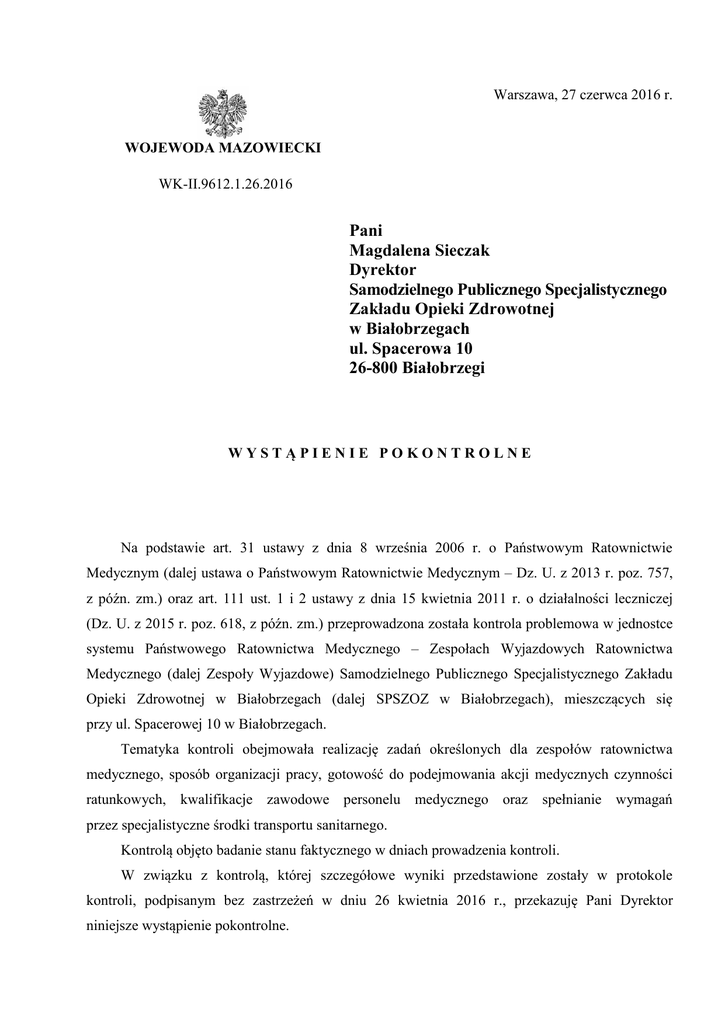 Warszawa, 27 czerwca 2016 r. WOJEWODA MAZOWIECKI WK-II.9612.1.26.2016 Pani Magdalena Sieczak Dyrektor Samodzielnego Publicznego Specjalistycznego Zakładu Opieki Zdrowotnej w Białobrzegach ul. Spacerowa 10 26-800 Białobrzegi WYSTĄPIENIE POKONTROLNE Na podstawie art. 31 ustawy z dnia 8 września 2006 r. o Państwowym Ratownictwie Medycznym (dalej ustawa o Państwowym Ratownictwie Medycznym – Dz. U. z 2013 r. poz. 757, z późn. zm.) oraz art. 111 ust. 1 i 2 ustawy z dnia 15 kwietnia 2011 r. o działalności leczniczej (Dz. U. z 2015 r. poz. 618, z późn. zm.) przeprowadzona została kontrola problemowa w jednostce systemu Państwowego Ratownictwa Medycznego – Zespołach Wyjazdowych Ratownictwa Medycznego (dalej Zespoły Wyjazdowe) Samodzielnego Publicznego Specjalistycznego Zakładu Opieki Zdrowotnej w Białobrzegach (dalej SPSZOZ w Białobrzegach), mieszczących się przy ul. Spacerowej 10 w Białobrzegach. Tematyka kontroli obejmowała realizację zadań określonych dla zespołów ratownictwa medycznego, sposób organizacji pracy, gotowość do podejmowania akcji medycznych czynności ratunkowych, kwalifikacje zawodowe personelu medycznego oraz spełnianie wymagań przez specjalistyczne środki transportu sanitarnego. Kontrolą objęto badanie stanu faktycznego w dniach prowadzenia kontroli. W związku z kontrolą, której szczegółowe wyniki przedstawione zostały w protokole kontroli, podpisanym bez zastrzeżeń w dniu 26 kwietnia 2016 r., przekazuję Pani Dyrektor niniejsze wystąpienie pokontrolne. W trakcie kontroli ustalono, że w gotowości wyjazdowej pozostawały dwa zespoły wyjazdowe – jeden specjalistyczny (gotowość całodobowa) i jeden podstawowy (gotowość w godzinach 800 – 2000). Pomieszczenia będące miejscem stacjonowania Zespołów Wyjazdowych oraz specjalistyczne środki transportu sanitarnego wyposażone zostały w środki łączności zapewniające stały kontakt z centrum powiadamiania ratunkowego. Sprzęt i aparatura medyczna wykorzystywane do udzielania świadczeń zdrowotnych umożliwiały niezwłoczne przeprowadzanie medycznych czynności ratunkowych. Leki znajdujące się w wyposażeniu Zespołów Wyjazdowych posiadały ważne terminy przydatności do stosowania. Specjalistyczne środki transportu sanitarnego spełniały wymagania określone w Polskiej Normie PN-EN 1789+A1. Na podstawie grafików pracy Zespołów Wyjazdowych ustalono, że świadczenia opieki zdrowotnej podejmowane w celu ratowania osób w stanie nagłego zagrożenia zdrowotnego w warunkach pozaszpitalnych udzielane były przez personel medyczny posiadający wymagane kwalifikacje zawodowe i zapewniający odpowiednią obsadę dla zespołu specjalistycznego i podstawowego. Świadczenia medyczne wykonywane były przez siedmiu lekarzy systemu, z których sześciu posiadało specjalizację lub tytuł specjalisty w dziedzinach: medycyny ratunkowej (dwóch lekarzy), anestezjologii i intensywnej terapii (jeden lekarz), chirurgii dziecięcej (jeden lekarz), chirurgii ogólnej (dwóch lekarzy), a jeden ukończył czwarty rok specjalizacji w dziedzinie medycyny ratunkowej. Świadczenia medyczne zapewniane były również przez dziewiętnastu ratowników medycznych. W dokumentacji podmiotu leczniczego zgromadzono dokumenty potwierdzające prawo wykonywania zawodu aktualnie zatrudnionej kadry lekarskiej oraz zaświadczenia o przygotowaniu zawodowym ratowników medycznych. W wyniku analizy treści Książki skarg i wniosków Nr 1 SPSZOZ w Białobrzegach, ustalono, że w zakresie funkcjonowania Zespołów Wyjazdowych nie została zgłoszona żadna skarga. Na podstawie przeprowadzonej analizy Kart zlecenia wyjazdu zespołu ratownictwa medycznego oraz Kart medycznych czynności ratunkowych, sporządzonych w okresie od 1 marca do 31 marca 2016 r. przez Zespoły Wyjazdowe, dokonano następujących ustaleń. Zespół podstawowy w dwudziestu pięciu przypadkach na dziewięćdziesiąt cztery zrealizowane zlecenia wyjazdu przekroczył maksymalny czas dotarcia, który – zgodnie z art. 24 ust. 1 pkt 3 ustawy o Państwowym Ratownictwie Medycznym – nie może być dłuższy niż 15 minut w mieście powyżej 10 tysięcy mieszkańców i 20 minut poza miastem powyżej 10 tysięcy mieszkańców. Przekroczenie maksymalnego czasu dotarcia do miejsca zdarzenia znajdującego się poza obszarem miasta wyniosło: 1 (w dwóch przypadkach), 2 (w czterech przypadkach), 3 (w dwóch 2 przypadkach), 4 (w dwóch przypadkach), 5 (w dwóch przypadkach), 6, 7 (w dwóch przypadkach), 10 (w trzech przypadkach), 12, 13, 35 i 60 minut. W obszarze miasta przekroczenie wyniosło: 1, 2 i 19 minut. Zespół specjalistyczny przekroczył maksymalny czas dotarcia w dwóch przypadkach na trzydzieści cztery zrealizowane zlecenia wyjazdu w obszarze miasta. Przekroczenie wyniosło 5 i 8 minut. Zespół ten przekroczył również maksymalny czas dotarcia w osiemnastu przypadkach na dziewięćdziesiąt osiem zrealizowanych zleceń wyjazdu poza obszar miasta. Przekroczenie wyniosło: 1 (w trzech przypadkach), 2 (w pięciu przypadkach), 3, 4 (w dwóch przypadkach), 5, 7 (w trzech przypadkach), 9, 22 i 25 minut. Przedstawiając powyższe ustalenia pragnę poinformować Panią Dyrektor, że pozytywnie oceniono kwalifikacje i zabezpieczenie kadry medycznej w Zespołach Wyjazdowych Ratownictwa Medycznego oraz warunki i wyposażenie specjalistycznych środków transportu sanitarnego, niemniej należy podjąć działania usprawniające organizację pracy zespołów w celu zapewnienia odpowiednich parametrów czasu dotarcia na miejsce zdarzenia od chwili przyjęcia zgłoszenia przez dyspozytora medycznego – zgodnie z normami określonymi w art. 24 ust. 1 pkt 3 ustawy o Państwowym Ratownictwie Medycznym. Jednocześnie zobowiązuję Panią Dyrektor do poinformowania Wojewody Mazowieckiego, z powołaniem znaku pisma WK-II.9612.1.26.2016, o sposobie wykorzystania wniosku pokontrolnego, niezwłocznie po otrzymaniu wystąpienia. z up. WOJEWODY MAZO