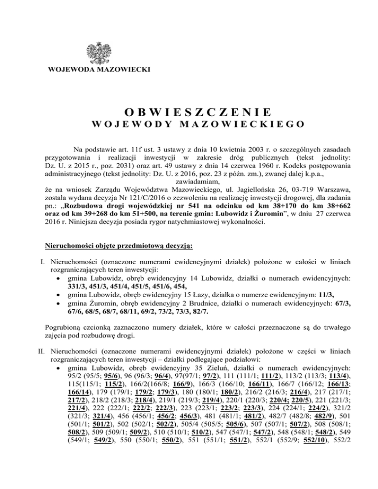 WOJEWODA MAZOWIECKI OBWIESZCZENIE WOJEWODY MAZOWIECKIEGO Na podstawie art. 11f ust. 3 ustawy z dnia 10 kwietnia 2003 r. o szczególnych zasadach przygotowania i realizacji inwestycji w zakresie dróg publicznych (tekst jednolity: Dz. U. z 2015 r., poz. 2031) oraz art. 49 ustawy z dnia 14 czerwca 1960 r. Kodeks postępowania administracyjnego (tekst jednolity: Dz. U. z 2016, poz. 23 z późn. zm.), zwanej dalej k.p.a., zawiadamiam, że na wniosek Zarządu Województwa Mazowieckiego, ul. Jagiellońska 26, 03-719 Warszawa, została wydana decyzja Nr 121/C/2016 o zezwoleniu na realizację inwestycji drogowej, dla zadania pn.: „Rozbudowa drogi wojewódzkiej nr 541 na odcinku od km 38+170 do km 38+662 oraz od km 39+268 do km 51+500, na terenie gmin: Lubowidz i Żuromin”, w dniu 27 czerwca 2016 r. Niniejsza decyzja posiada rygor natychmiastowej wykonalności. Nieruchomości objęte przedmiotową decyzją: I. Nieruchomości (oznaczone numerami ewidencyjnymi działek) położone w całości w liniach rozgraniczających teren inwestycji: gmina Lubowidz, obręb ewidencyjny 14 Lubowidz, działki o numerach ewidencyjnych: 331/3, 451/3, 451/4, 451/5, 451/6, 454, gmina Lubowidz, obręb ewidencyjny 15 Łazy, działka o numerze ewidencyjnym: 11/3, gmina Żuromin, obręb ewidencyjny 2 Brudnice, działki o numerach ewidencyjnych: 67/3, 67/6, 68/5, 68/7, 68/11, 69/2, 73/2, 73/3, 82/7. Pogrubioną czcionką zaznaczono numery działek, które w całości przeznaczone są do trwałego zajęcia pod rozbudowę drogi. II. Nieruchomości (oznaczone numerami ewidencyjnymi działek) położone w części w liniach rozgraniczających teren inwestycji – działki podlegające podziałowi: gmina Lubowidz, obręb ewidencyjny 35 Zieluń, działki o numerach ewidencyjnych: 95/2 (95/5; 95/6), 96 (96/3; 96/4), 97(97/1; 97/2), 111 (111/1; 111/2), 113/2 (113/3; 113/4), 115(115/1; 115/2), 166/2(166/8; 166/9), 166/3 (166/10; 166/11), 166/7 (166/12; 166/13; 166/14), 179 (179/1; 179/2; 179/3), 180 (180/1; 180/2), 216/2 (216/3; 216/4), 217 (217/1; 217/2), 218/2 (218/3; 218/4), 219/1 (219/3; 219/4), 220/1 (220/3; 220/4; 220/5), 221 (221/3; 221/4), 222 (222/1; 222/2; 222/3), 223 (223/1; 223/2; 223/3), 224 (224/1; 224/2), 321/2 (321/3; 321/4), 456 (456/1; 456/2; 456/3), 481 (481/1; 481/2), 482/7 (482/8; 482/9), 501 (501/1; 501/2), 502 (502/1; 502/2), 505/4 (505/5; 505/6), 507 (507/1; 507/2), 508 (508/1; 508/2), 509 (509/1; 509/2), 510 (510/1; 510/2), 547 (547/1; 547/2), 548 (548/1; 548/2), 549 (549/1; 549/2), 550 (550/1; 550/2), 551 (551/1; 551/2), 552/1 (552/9; 552/10), 552/2 (552/11; 552/12), 552/3 (552/13; 552/14), 552/5 (552/15; 552/16), 553 (553/1; 553/2), 554 (554/1; 554/2), 555 (555/1; 555/2), 556 (556/1; 556/2), 557(557/1; 557/2), 558 (558/1; 558/2), 559 (559/1; 559/2), 560 (560/1; 560/2), 561 (561/1; 561/2), 562 (562/1; 562/2), 563 (563/1; 563/2), 564 (564/1; 564/2), 565 (565/1; 565/2), 566 (566/1; 566/2), 567 (567/1; 567/2), 568 (568/1; 568/2), 569 (569/1; 569/2), 571 (571/1; 571/2), 572 (572/1; 572/2), 573 (573/1; 573/2), 574 (574/1; 574/2), 575 (575/1; 575/2), 705 (705/1; 705/2), 3180/2 (3180/4; 3180/5; 3180/6), 3180/3 (3180/7; 3180/8), 3189 (3189/1; 3189/2; 3189/3; 3189/4), 3196/1 (3196/2; 3196/3; 3196/4), gmina Lubowidz, obręb ewidencyjny 24 Ruda, działki o numerach ewidencyjnych: 6 (6/1; 6/2), 7 (7/1; 7/2), 8 (8/1; 8/2), 28 (28/1; 28/2), 30 (30/1; 30/2), 36 (36/1; 36/2), 37 (37/1; 37/2), 38 (38/1; 38/2), 41 (41/1; 41/2), 42 (42/1; 42/2), 44 (44/1; 44/2), 3188/1 (3188/5; 3188/6), 3188/2 (3188/7; 3188/8), 3196/2 (3196/7; 3196/8), 3196/4 (3196/9; 3196/10), 3196/5 (3196/11; 3196/12) 3196/6 (3196/13; 3196/14), gmina Lubowidz, obręb ewidencyjny 14 Lubowidz, działki o numerach ewidencyjnych: 55 (55/2; 55/1), 58 (58/2; 58/1), 72/1 (72/4; 72/3), 73 (73/2; 73/1), 85/1 (85/13; 85/12), 85/4 (85/9; 85/8), 85/6 (85/15; 85/14), 85/7 (85/11; 85/10), 87 (87/2; 87/1), 88 (88/2; 88/1), 89 (89/2; 89/1), 90 (90/2; 90/1), 91 (91/2; 91/1), 92 (92/2; 92/1), 93/2 (93/4; 93/3), 94 (94/2; 94/1), 95/1 (95/4; 95/3), 95/2 (95/6; 95/5), 123 (123/2; 123/1), 124/1 (124/11; 124/10), 124/3 (124/9, 124/8), 124/4 (124/7; 124/5; 124/6), 252 (252/1; 252/3; 252/2), 269 (269/2; 269/1), 277 (277/2; 277/1), 304 (304/2; 304/1), 320/1 (320/4; 320/3), 329 (329/2; 329/1), 332 (332/2; 332/1), 333 (333/2; 333/1), 337 (337/2; 337/1), 345 (345/2; 345/1), 346 (346/2; 346/1), 347 (347/2; 347/1), 349 (349/2; 349/1), 350 (350/2; 350/1), 353 (353/2; 353/1), 356 (356/2; 356/1), 357 (357/2; 357/1), 359 (359/2; 359/1), 360 (360/2; 360/1), 363/2 (363/7; 363/6), 363/3 (363/9; 363/8), 363/5 (363/11; 363/10), 385 (385/2; 385/1), 391/1 (391/9; 391/8), 391/3 (391/13; 391/12), 391/5 (391/15; 391/14), 391/6 (391/11; 391/10), 396 (396/2; 396/1), 397 (397/2; 397/1), 399 (399/2; 399/1), 401 (401/2; 401/1), 403 (403/2; 403/1), 405 (405/2; 405/1), 407 (407/2; 407/1), 409 (409/2; 409/1), 411 (411/2; 411/1), 413 (413/2; 413/1), 415 (415/2; 415/1), 417 (417/2; 417/1), 419 (419/2; 419/1); 421 (421/2; 421/1); 423 (423/2; 423/1), 425 (425/2; 425/1), 427 (427/2; 427/1), 429 (429/2; 429/1), 431 (431/2; 431/1), 452 (452/2; 452/1), 453 (453/2; 453/1), 455 (455/2; 455/1), 456 (456/2; 456/1), 457 (457/2; 457/1), 468/1 (468/5; 468/3; 468/4), 468/2 (468/7; 468/6), 469 (469/2; 469/1; 469/3), 478 (478/3; 478/1; 478/2), 568 (568/2; 568/1), 796 (796/2; 796/1), 835/3 (835/8; 835/7), 835/4 (835/6; 835/5), 856 (856/3; 856/1; 856/2), 861 (861/2; 861/1), 862 (862/2; 862/1), 864/2 (864/5; 864/6), 878 (878/2; 878/1), 879/1 (879/5; 879/4), 879/2 (879/7; 879/6), 881/1 (881/4; 881/3), 882 (882/2; 882/1), 883/1 (883/4; 883/3), 884 (884/2; 884/1), 885 (885/2; 885/1), 886 (886/2; 886/1), 951/1 (951/4; 951/3), 952 (952/2; 952/1), 953/1 (953/4; 953/3), 964 (964/2; 964/1), 965 (965/2; 965/1), 966 (966/2; 966/1), 973 (973/2; 973/1), 975 (975/2; 975/1), 976 (976/2; 976/1), 979 (979/2; 979/1), 980 (980/1; 980/3; 980/2), 990/2 (990/6; 990/5), 1001 (1001/2; 1001/1), 1029/1 (1029/4; 1029/3), 1030 (1030/2; 1030/1), 1095 