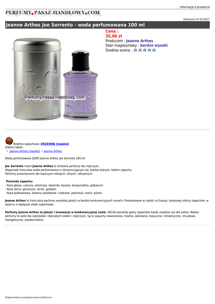 Informacje o produkcie Utworzono 07-03-2017 Jeanne Arthes Joe Sorrento - woda perfumowana 100 ml Cena : 35,00 zł Producent : Jeanne Arthes Stan magazynowy : bardzo wysoki Średnia ocena : Rodzina zapachowa: DRZEWNE [męskie] Zobacz także: Jeanne Arthes [męskie] Jeanne Arthes Woda perfumowana [EDP] Jeanne Arthes Joe Sorrento 100 ml Joe Sorrento marki Jeanne Arthes to drzewne perfumy dla mężczyzn. Wspaniała francuska woda perfumowana o nienarzucającym się, bardzo ładnym, lekkim zapachu. Perfumy przeznaczone dla mężczyzn młodych, silnych i aktywnych. Piramida zapachu: - Nuta głowy: cytryna, artemizja, lawenda, bazylia, bergamotkia, galbanum - Nuta serca: geranium, neroli, goździki - Nuta podstawowa: drewno sandałowe i cedrowe, patchouli, mech, piżmo Jeanne Arthes to francuskie perfumy wysokiej jakości w bardzo konkurencyjnych cenach. Produkowane w całości w Grasse, światowej stolicy zapachów, w oparciu o najlepsze olejki zapachowe. Perfumy Jeanne Arthes to jakość i innowacja w konkurencyjnej cenie. Wśród szerokiej gamy zapachów każdy znajdzie coś dla siebie. Modne perfumy to serie dla nastolatek i dojrzałych kobiet i mężczyzn. Są tu zapachy nowoczesne, modne, seksowne, klasyczne, romantyczne, zmysłowe, energetyczne, uwodzicielskie. Wygenerowano w programie www.oscGold.com