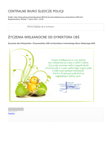CENTRALNE BIURO ŚLEDCZE POLICJI Źródło: http://cbsp.policja.pl/cbs/aktualnosci/85419,Zyczenia-Wielkanocne-od-Dyrektora-CBS.html Wygenerowano: Wtorek, 7 marca 2017, 13:28 Strona znajduje się w archiwum. ŻYCZENIA WIELKANOCNE OD DYREKTORA CBŚ Życzenia dla Policjantów i Pracowników CBŚ od Dyrektora Centralnego Biura Śledczego KGP Ocena: 5/5 (1) Tweetnij