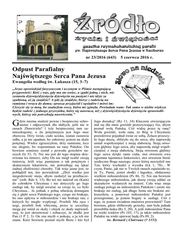 gazetka rzymskokatolickiej parafii pw. Najświętszego Serca Pana Jezusa w Raciborzu nr 23/2016 (643) 5 czerwca 2016 r. Odpust Parafialny Najświętszego Serca Pana Jezusa Ewangelia według św. Łukasza (15, 3–7) „Jezus opowiedział faryzeuszom i uczonym w Piśmie następującą przypowieść: KtóŜ z was, gdy ma sto owiec, a zgubi jedną z nich, nie zostawia dziewięćdziesięciu dziewięciu na pustyni i nie idzie za zgubioną, aŜ ją znajdzie? A gdy ją znajdzie, bierze z radością na ramiona i wraca do domu; sprasza przyjaciół i sąsiadów i mówi im: Cieszcie się ze mną, bo znalazłem owcę, która mi zginęła. Powiadam wam: Tak samo w niebie większa będzie radość z jednego grzesznika, który się nawraca, niŜ z dziewięćdziesięciu dziewięciu sprawiedliwych, którzy nie potrzebują nawrócenia.” G dzie moŜna znaleźć pewne i bezpieczne schronienie i odpoczynek dla słabych, jeśli nie w ranach Zbawiciela? I tyle bezpieczniej tam zamieszkujemy, o ile potęŜniejsza jest Jego moc zbawcza. DrŜy świat, ciało uciska, szatan zastawia sidła, a ja nie upadam, bo załoŜony jestem na skale potęŜnej. Wielce zgrzeszyłem, drŜy sumienie, lecz nie ulegnie, bo wspominam na rany Pańskie. On bowiem zraniony został z powodu grzechów naszych (Iz 53, 5). Nic nie jest do tego stopnia skierowane ku śmierci, Ŝeby On nie mógł ocalić swoją śmiercią. Jeśli więc pamiętam o tak potęŜnym i skutecznym lekarstwie, nie potrzebuję się lękać Ŝadnej złośliwości choroby. Tak więc jasne jest, Ŝe pobłądził ten, kto powiedział: „Zbyt wielka jest niegodziwość moja, abym zasłuŜył na przebaczenie” (zob. Rdz 4, 13). Bo teŜ nie naleŜał on (Kain) do członków Chrystusa i nie dotyczyły go Jego zasługi tak, by mógł uwaŜać za swoje to, co było Chrystusa... Ja jednak z pełną ufnością domagam się z głębi serca Pańskiego tego, czego mi brakuje, bo ono opływa w miłosierdzie i nie brakuje ran, z których by mogło wypłynąć. Przebili Mu ręce i nogi, przebili bok włócznią, przez te szczeliny mogę pić miód ze skały i olejek ze skały najtwardszej, to jest skosztować i zobaczyć, Ŝe słodki jest Pan (1 P 2, 3). On zna myśli o pokoju, a ja ich nie znam. KtóŜ bowiem poznał myśli BoŜe i kto był Jego doradcą? (Rz 11, 34) Kluczem otwierającym stał się dla mnie gwóźdź przeszywający Go, abym poznał wolę Pańską. CóŜ widzę przez tę ranę? Woła gwóźdź, woła rana, Ŝe Bóg w Chrystusie prawdziwie pojednał świat ze sobą. śelazo przeszyło Jego duszę, zbliŜyło się do serca, aby naprawdę umiał współcierpieć z moją słabością. Stoją otworem głębiny Jego serca, aby naprawdę mógł współcierpieć z moją słabością. Stoją otworem głębiny Jego serca dzięki ranie ciała, stoi otworem owa ogromna tajemnica łaskawości, stoi otworem litość serdeczna Boga naszego, przez którą nawiedził nas Ten, który wschodzi z wysoka (Łk 1, 78)... W czym, Panie, jak nie w Twoich ranach zajaśniało to, Ŝe Ty, Panie, jesteś słodki i łagodny, obdarzony wielkim miłosierdziem (Ps 86, 5). Nie ma bowiem większego miłosierdzia, jak duszę swoją oddać za skazańców wydanych na śmierć. Cała więc moja zasługa polega na miłosierdziu Pańskim i zaiste nie brakuje mi zasług, jak długo Jemu nie braknie miłosierdzia, a poniewaŜ miłosierdzie Pańskie jest przeogromne, ja jestem bogaty w zasługi. CóŜ z tego, Ŝe jestem świadom mnóstwa przewinień? Tam bowiem, gdzie obfitowały grzechy, tam była jednak przeobfita łaska (Rz 5, 20). A jeśli miłosierdzie Pana na wieki wieków (Ps 103, 17), ja takŜe miłosierdzie Pańskie na wieki opiewać będę (Ps 89, 2). św. Bernard z Clairvaux († 1153) 2 Źródło - gazetka Poniedziałek – 6 czerwca 2016 Mt 5,1-12 630 Za †† rodziców Annę i Sylwestra, †† brata Ernesta, bratową Urszulę, szwagra Benona i całe †† pokrewieństwo 900 Za †† Floriana i Kazimierę oraz z prośbą o zdrowie i BoŜe błogosławieństwo dla całej rodziny 1800 1. Do Miłosierdzia BoŜego za †† rodziców Genowefę i Filipa, †† rodzeństwo: siostrę Pelagię, braci Jana i Zdzisława, pokrewieństwo z obu stron i dusze w czyśćcu cierpiące 2. Za † mamę Alfredę Pawełek w 1. rocznicę śmierci naboŜeństwo czerwcowe Wtorek – 7 czerwca 2016 Mt 5,13-16 630 Za †† rodziców Józefa i Anielę Durlak, † brata Andrzeja i wszystkich †† z rodziny 800 W języku niemieckim: Für verstorbene Eltern Alois und Magdalene Jaskulla, für verstorbenen Onkel Wilibald, verstorbene Tanten Marie und Stefanie sowie verstorbene Eltern beiderseits 1800 1. Za † Irenę Sosnowską w 4. rocznicę śmierci 2. Msza dziękczynna w intencji Jerzego i Krystyny z okazji 45. rocznicy ślubu z podziękowaniem za otrzymane łaski, z prośbą o BoŜe błogosławieństwo i zdrowie dla jubilatów i w ich rodzinie 3. Do Miłosierdzia BoŜego za †† Emilię i Franciszka Janiszewskich, Franciszkę i Franciszka Muzia i †† z rodziny naboŜeństwo czerwcowe Środa – 8 czerwca 2016 – św. Jadwigi, królowej Mt 5,17-19 630 Do BoŜej Opatrzności prze wstawiennictwo Matki Boskiej Jasnogórskiej w dniu 40. urodzin Gabrieli Flegel z podziękowaniem za wszystkie otrzymane łaski, z prośbą o BoŜe błogosławieństwo Do BoŜej Opatrzności w intencji Zofii w kolejną rocznicę urodzin z podziękowaniem za 900 otrzymane łaski, z prośbą o BoŜe błogosławieństwo i zdrowie 1800 1. Za †† rodziców Józefę i Maksymiliana Lipińskich o Ŝycie wieczne 2. Za † Krystynę Boską (od lokatorów z ulicy Waryńskiego 1d) naboŜeństwo czerwcowe Czwartek – 9 czerwca 2016 Mt 5,20-26 630 Za †† męŜa Henryka, syna Norberta, siostry i rodziców 1630 NaboŜeństwo dla dzieci 1800 1. Za †† rodziców Stefanię i Józefa Kubackich, †† z rodziny Windisch, Grabuńczyk, Kawalec oraz za dusze w czyśćcu cierpiące 2. W intencji rodziny z podziękowaniem za otrzymane łaski, z pro