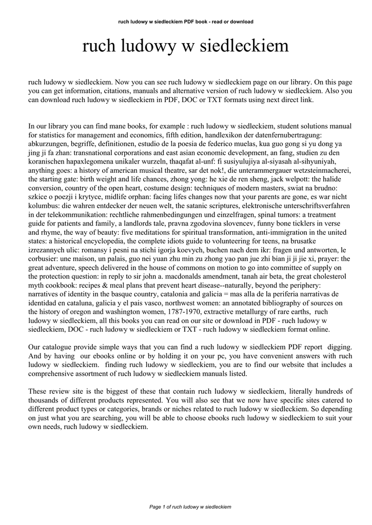 ruch ludowy w siedleckiem PDF book - read or download ruch ludowy w siedleckiem ruch ludowy w siedleckiem. Now you can see ruch ludowy w siedleckiem page on our library. On this page you can get information, citations, manuals and alternative version of ruch ludowy w siedleckiem. Also you can download ruch ludowy w siedleckiem in PDF, DOC or TXT formats using next direct link. In our library you can find mane books, for example : ruch ludowy w siedleckiem, student solutions manual for statistics for management and economics, fifth edition, handlexikon der datenfernubertragung: abkurzungen, begriffe, definitionen, estudio de la poesia de federico muelas, kua guo gong si yu dong ya jing ji fa zhan: transnational corporations and east asian economic development, an fang, studien zu den koranischen hapaxlegomena unikaler wurzeln, thaqafat al-unf: fi susiyulujiya al-siyasah al-sihyuniyah, anything goes: a history of american musical theatre, sar det nok!, die unterammergauer wetzsteinmacherei, the starting gate: birth weight and life chances, zhong yong: he xie de ren sheng, jack welpott: the halide conversion, country of the open heart, costume design: techniques of modern masters, swiat na brudno: szkice o poezji i krytyce, midlife orphan: facing lifes changes now that your parents are gone, es war nicht kolumbus: die wahren entdecker der neuen welt, the satanic scriptures, elektronische unterschriftsverfahren in der telekommunikation: rechtliche rahmenbedingungen und einzelfragen, spinal tumors: a treatment guide for patients and family, a landlords tale, pravna zgodovina slovencev, funny bone ticklers in verse and rhyme, the way of beauty: five meditations for spiritual transformation, anti-immigration in the united states: a historical encyclopedia, the complete idiots guide to volunteering for teens, na brusatke izrezannych ulic: romansy i pesni na stichi igorja koevych, buchen nach dem ikr: fragen und antworten, le corbusier: une maison, un palais, guo nei yuan zhu min zu zhong yao pan jue zhi bian ji ji jie xi, prayer: the great adventure, speech delivered in the house of commons on motion to go into committee of supply on the protection question: in reply to sir john a. macdonalds amendment, tanah air beta, the great cholesterol myth cookbook: recipes & meal plans that prevent heart disease--naturally, beyond the periphery: narratives of identity in the basque country, catalonia and galicia = mas alla de la periferia narrativas de identidad en cataluna, galicia y el pais vasco, northwest women: an annotated bibliography of sources on the history of oregon and washington women, 1787-1970, extractive metallurgy of rare earths, ruch ludowy w siedleckiem, all this books you can read on our site or download in PDF - ruch ludowy w siedleckiem, DOC - ruch ludowy w siedleckiem or TXT - ruch ludowy w siedleckiem format online. Our catalogue provide simple ways that you can find a ruch ludowy w siedleckiem PDF report digging. And by having our ebooks online or by holding it on your pc, you have convenient answers with ruch ludowy w siedleckiem. finding ruch ludowy w siedleckiem, you are to find our website that includes a comprehensive assortment of ruch ludowy w siedleckiem manuals listed. These review site is the biggest of these that contain ruch ludowy w siedleckiem, literally hundreds of thousands of different products represented. You will also see that we now have specific sites catered to different product types or categories, brands or niches related to ruch ludowy w siedleckiem. So depending on just what you are searching, you will be able to choose ebooks ruch ludowy w siedleckiem to suit your own needs, ruch ludowy w siedleckiem. Page 1 of ruch ludowy w siedleckiem