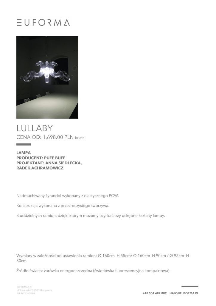LULLABY CENA OD: 1,698.00 PLN brutto LAMPA PRODUCENT: PUFF BUFF PROJEKTANT: ANNA SIEDLECKA, RADEK ACHRAMOWICZ Nadmuchiwany żyrandol wykonany z elastycznego PCW. Konstrukcja wykonana z przezroczystego tworzywa. 8 oddzielnych ramion, dzięki którym możemy uzyskać trzy odrębne kształty lampy. Wymiary w zależności od ustawienia ramion: Ø 160cm H 55cm/ Ø 160cm H 90cm / Ø 95cm H 80cm Źródło światła: żarówka energooszczędna (świetlówka fluorescencyjna kompaktowa) Powered by TCPDF (www.tcpdf.org)