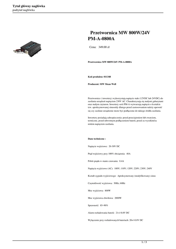 Tytuł główny nagłówka podtytuł nagłówka Przetwornica MW 800W/24V PM-A-0800A Cena: 349.00 zł Przetwornica MW 800W/24V PM-A-0800A Kod produktu: 011348 Producent: MW Mean Well Przetwornice ( inwertery) wykorzystują napięcie stałe (12VDC lub 24VDC) do zasilania urządzeń napięciem 230V AC. Charakteryzują się małymi gabarytami oraz małym ciężarem. Inwertery serii PM-A wytwarzają napięcie o kształcie tzw. aproksymowanej sinusoidy dlatego przed zastosowaniem należy upewnić się czy zasilane urządzenie może być podłączone do takiego źródła zasilania. Inwertery posiadają zabezpieczenia: przed przeciążeniem lub zwarciem, termiczne, przed odwrotnym podłączeniem baterii, przed za wysokim/za niskim napięciem zasilania. Dane techniczne : Napięcie wejściowe: 20-30V DC Prąd wejściowy przy 100% obciążenia: 40A Pobór prądu w stanie czuwania: 0.4A Napięcia wyjściowe (AC): 100V; 110V; 120V; 220V; 230V; 240V Kształt sygnału wyjściowego: Aproksymowany (modyfikowany) sinus Częstotliwość wyjściowa: 50Hz; 60Hz Moc wyjściowa: 800W Moc wyjściowa chwilowa: 2000W Sprawność: 85~90% Alarm rozładowania baterii: 21+/-0.8V DC Wyłączenie przy rozładowanych bateriach: 20+/-0.8V DC 1/3 Tytuł główny nagłówka podtytuł nagłówka Zabezpieczenie termiczne: 60+/-5°C Zabezpieczenie przeciążeniowe: Tak Zabezpieczenie przeciw zwarciowe: Tak Ograniczenie napięcia wejściowego: Tak Zabezpieczenie polaryzacyjne baterii: Tak (bezpiecznik) Bezpiecznik: 4 x 20A Wymiary (dł x szer x wys) [mm]: 280 x 200 x 70 Waga: 2600g Niektóre zastosowania: Moc inwertera 1368 Urządzenia Elektroniczne 14’ i 21’ odbiorniki TV ● HD odbiorniki TV ● Stacje Playstation i X-Box ● Przenośne gry wideo ● Odtwarzacze DVD ● Laptopy ● Komputery PC ( bez monitora) ● Komputery PC ( z monitorem 15’ lub 17’) ● × Ładowarki telefonów komórkowych ● Elektryczne maszynki do golenia ● Drukarki ● Faksy ● Mini wieże stereo ● Sytemy HiFi ● Narzędzia Ładowarki baterii ● 550W wiertarka ● × Szlifierka ● × Mała kompresory ● × Urządzenia gospodarstwa domowego Małe kuchenki mikrofalowe ▲ × Średnie kuchenki mikrofalowe ▲ × Kawiarki ▲ × Żarówki ● Kotły CO ▲ Małe pompy CO ▲ Tostownice ▲ × Suszarki ▲ × × = nie nadaje się* ▲ = odpowiedni* ● =nadaje się* Powyższe informacje należy traktować jako orientacyjne, w razie wątpliwości należy upewni zasianie z danego typu inwertera. Urządzenia podobne: Przetwornice DC/AC z napięciem wyjściowym w kształcie czystej sin 2/3 Tytuł główny nagłówka podtytuł nagłówka Szczegóły Rodzaj przetwornicy Zasilanie i ładowanie DC/AC sinus modyfikowany przetwornice / reduktory napięć 3/3 Powered by TCPDF (www.tcpdf.org)
