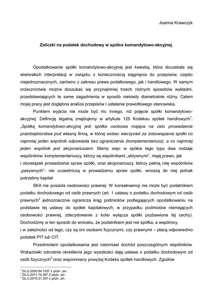 Joanna Krawczyk Zaliczki na podatek dochodowy w spółce komandytowo-akcyjnej. Opodatkowanie spółki komandytowo-akcyjnej jest kwestią, która doczekała się wielorakich interpretacji w związku z koniecznością sięgnięcia do przepisów, często niejednoznacznych, zarówno z zakresu prawa podatkowego, jak i handlowego. W samym orzecznictwie można doszukać się przynajmniej trzech różnych sposobów wykładni, przedstawiających te same zagadnienia w sposób niekiedy diametralnie różny. Celem mojej pracy jest dogłębna analiza przepisów i ustalenie prawidłowego stanowiska. Punktem wyjścia nie może być nic innego, niż pojęcie spółki komandytowoakcyjnej. Definicję legalną znajdujemy w artykule 125 Kodeksu spółek handlowych1: „Spółką komandytowo-akcyjną jest spółka osobowa mająca na celu prowadzenie przedsiębiorstwa pod własną firmą, w której wobec wierzycieli za zobowiązania spółki co najmniej jeden wspólnik odpowiada bez ograniczenia (komplementariusz), a co najmniej jeden wspólnik jest akcjonariuszem. Mamy więc w spółce tego typu dwa rodzaje wspólników: komplementariuszy, którzy są wspólnikami „aktywnymi”, mają prawo, jak i obowiązek prowadzenia spraw spółki, oraz akcjonariuszy, którzy pełnią rolę wspólników „pasywnych”- nie uczestniczą w prowadzeniu spraw spółki, wnoszą do niej jednak potrzebny kapitał. SKA nie posiada osobowości prawnej. W konsekwencji nie może być podatnikiem podatku dochodowego od osób prawnych (art. 1 ustawy o podatku dochodowym od osób prawnych2 jednoznacznie ogranicza krąg podmiotów podlegających opodatkowaniu na podstawie tej ustawy do spółek kapitałowych; w przypadku podmiotów niemających osobowości prawnej, zdecydowanie z kolei wyłącza spółki pozbawione tej cechy). Dochodzimy w ten sposób do wniosku, że podatnikiem jest nie spółka, a wspólnicy, i w zależności od tego, czy są oni osobami fizycznymi, czy prawnymi – płacą odpowiednio podatek PIT lub CIT. Przedmiotem opodatkowania jest natomiast dochód poszczególnych wspólników. Wskazówki odnośnie określenia jego wysokości dają ustawa o podatku dochodowym od osób fizycznych3 oraz wspomniany powyżej Kodeks spółek handlowych. Zgodnie 1 Dz.U.2000.94.1037 z późn. zm. Dz.U.2011.74.397 Z późn. zm. 3 Dz.U.2010.51.307 z późn. zm. 2 z artykułem 8 ust. 1 ustawy o PIT: „Przychody z udziału w spółce niebędącej osobą prawną (...) u każdego podatnika określa się proporcjonalnie do jego prawa do udziału w zysku (udziału) (…). Z kolei według art. 147 ksh udział w zysku jest proporcjonalny do wkładu wspólnika do spółki. („Komplementariusz oraz akcjonariusz uczestniczą w zysku spółki proporcjonalnie do ich wkładów wniesionych do spółki, chyba że statut stanowi inaczej.”) Wysokości podatku będzie więc uzależniona od wniesionego przez niego kapitału, a obliczana jako ułamek od zysków całej spółki. Zyskiem akcjonariusza natomiast będzie, co do zasady, dywidenda wypłacana mu raz w roku, po podjęciu przez walne zgromadzenie spółki uchwały o podziale zysków za dany rok obrotowy. Przychód, jaki uzyskuje wspólnik, można teoretycznie zakwalifikować na dwa sposoby. Pierwszy to przychody z kapitałów pieniężnych. Za takim rozwiązaniem opowiedział się m.in. Wojewódzki Sąd Administracyjny w Krakowie4. Taka kwalifikacja okazuje się jednak błędna. W myśl art 17 ust.1 pkt 4 ustawy o PIT „Za przychody z kapitałów pieniężnych uważa się: dywidendy i inne przychody z tytułu udziału w zyskach osób prawnych, których podstawą uzyskania są udziały (akcje) w spółce mającej osobowość prawną lub spółdzielni.” Przepis ten stwierdza jednoznacznie, że przychodami z kapitałów pieniężnych mogą być tylko dywidendy uzyskane dzięki udziałom w spółkach będących osobami prawnymi, a więc de facto spółek kapitałowych. Do takich SKA bez wątpienia nie należy, a więc dywidenda pochodząca z SKA nie jest dywidendą, o której tutaj mowa. Pojęcie „spółek mających osobowość prawną” nie zostało zdefiniowane w szczególny sposób w cytowanej ustawie, a więc trudno doszukiwać się potrzeby definiowania tego zwrotu w sposób odmienny niż przyjęty w Kodeksie spółek handlowych. Ponadto, samo pojęcie dywidendy ma ścisły związek właśnie ze spółkami kapitałowymi i rozszerzanie go, zdaje się nie mieć celu. We wspomnianym wyżej wyroku sąd argumentował swoje stanowisko tym, że budowa zdania wskazuje na intencje ustawodawcy by fragment przepisu następujący po przecinku odnosił się tylko do „innych przychodów z tytułu udziału w zyskach osób prawnych”. Taka, a nie inna konstrukcja jednostki redakcyjnej miała być spowodowana troską ustawodawcy o poprawność gramatyczną. Argumentacja ta, nie wydaje się być przekonująca. Druga możliwa kwalifikacja dochodów z dywidendy w SKA to przychody z pozarolniczej działalności gospodarczej. Zgodnie z art. 5b ust. 2 ustawy o PIT „Jeżeli pozarolniczą działalność gospodarczą prowadzi spółka niemająca osobowości prawnej, przychody wspólnika z udziału w takiej spółce, określone na podstawie art. 8 ust. 1, uznaje się za przychody ze źródła, o którym mowa w art. 10 ust. 1 pkt 3” czyli przychody 4 Sygn. akt. I SA/Kr 1181/07, LEX nr 463849 z pozarolniczej działalności gospodarczej. Ustawodawca przyjmuje tu fikcję prawną, w wyniku której mamy do czynienia z pozarolniczą działalnością gospodarczą w dwóch przypadkach: 1) gdy prowadzi ją osoba fizyczna zgodnie z definicją działalności w art. 5a pkt 655; 2) uznaje się za prowadzenie pozarolniczej działalności gospodarczej fakt pozostawania wspólnikiem spółki osobowej, która taką działalność prowadzi we własnym imieniu. Tak więc jeśli tylko działalność tego typu prowadzi spółka, to przyjmujemy że wspólnik także. I to każdy wspólnik bez względu na jego status (komplementa