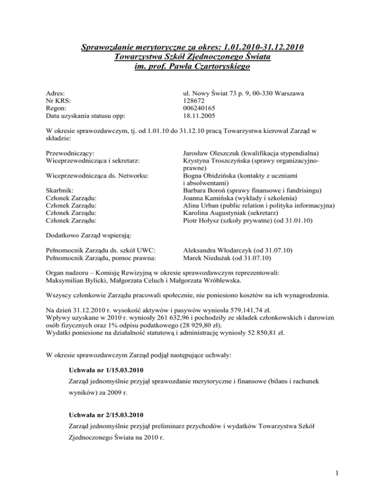 Sprawozdanie merytoryczne za okres: 1.01.2010-31.12.2010 Towarzystwa Szkół Zjednoczonego Świata im. prof. Pawła Czartoryskiego Adres: Nr KRS: Regon: Data uzyskania statusu opp: ul. Nowy Świat 73 p. 9, 00-330 Warszawa 128672 006240165 18.11.2005 W okresie sprawozdawczym, tj. od 1.01.10 do 31.12.10 pracą Towarzystwa kierował Zarząd w składzie: Przewodniczący: Wiceprzewodnicząca i sekretarz: Wiceprzewodnicząca ds. Networku: Skarbnik: Członek Zarządu: Członek Zarządu: Członek Zarządu: Członek Zarządu: Jarosław Oleszczuk (kwalifikacja stypendialna) Krystyna Troszczyńska (sprawy organizacyjnoprawne) Bogna Obidzińska (kontakty z uczniami i absolwentami) Barbara Boroń (sprawy finansowe i fundrisingu) Joanna Kamińska (wykłady i szkolenia) Alina Urban (public relation i polityka informacyjna) Karolina Augustyniak (sekretarz) Piotr Hołysz (szkoły prywatne) (od 31.01.10) Dodatkowo Zarząd wspierają: Pełnomocnik Zarządu ds. szkół UWC: Pełnomocnik Zarządu, pomoc prawna: Aleksandra Włodarczyk (od 31.07.10) Marek Niedużak (od 31.07.10) Organ nadzoru – Komisję Rewizyjną w okresie sprawozdawczym reprezentowali: Maksymilian Bylicki, Małgorzata Celuch i Małgorzata Wróblewska. Wszyscy członkowie Zarządu pracowali społecznie, nie poniesiono kosztów na ich wynagrodzenia. Na dzień 31.12.2010 r. wysokość aktywów i pasywów wyniosła 579.141,74 zł. Wpływy uzyskane w 2010 r. wyniosły 261 632,96 i pochodziły ze składek członkowskich i darowizn osób fizycznych oraz 1% odpisu podatkowego (28 929,80 zł). Wydatki poniesione na działalność statutową i administrację wyniosły 52 850,81 zł. W okresie sprawozdawczym Zarząd podjął następujące uchwały: Uchwała nr 1/15.03.2010 Zarząd jednomyślnie przyjął sprawozdanie merytoryczne i finansowe (bilans i rachunek wyników) za 2009 r. Uchwała nr 2/15.03.2010 Zarząd jednomyślnie przyjął preliminarz przychodów i wydatków Towarzystwa Szkół Zjednoczonego Świata na 2010 r. 1 Uchwała nr 3/15.03.2010 Zarząd przyjął w poczet członków Towarzystwa Szkół Zjednoczonego Świata: Małgorzatę, Witolda, Emiliana, Ryszarda Chojnackich Katarzynę i Piotra Dormusów Mateusza Iwo Dubaniowskiego Agatę i Jana Frankowskich Joannę i Dariusza Horników Annę i Weronikę Jurkiewicz Katarzynę Ladzińską Norberta Mikę Marka Troszczyńskiego van Genderen Małgorzatę i Radosława Stanków Katarzynę i Bartosza Żerebeckich Łukasza Zielińskiego Uchwała nr 4/15.03.2010 Zarząd powierza bieżącą opiekę nad kontem PayPal pani Karolinie Augustyniak. Do zakresu obowiązków pani Karoliny Augustyniak należy : i) przekazywanie środków z konta PayPal na konto bankowe Towarzystwa nie rzadziej niż raz na dwa tygodnie; ii) sporządzanie miesięcznych, przekazywanych drogą elektroniczną raportów dla Zarządu, dotyczących aktywności na koncie PayPal; iii) wykorzystywanie informacji przekazanych przez system PayPal, w celu aktualizacji baz danych Towarzystwa. Jednocześnie Zarząd upoważnia Piotra Hołysza do stworzenia osobnych kont użytkownika do obsługi konta PayPal dla: - Piotra Hołysza odpowiedzialnego za sprawy aministracyjno-prawne (pełny dostęp do konta PayPal), - Marcina Kozioła jako opiekuna strony internetowej Towarzystwa (organiczony dostęp do konta PayPal – jedynie obsługa techniczna, bez możliwości wykonywania operacji finansowych z konta PayPal). Zarząd powierza opiekę nad kontem PayPal pani Karolinie Augustyniak do czasu zrzeknięcia się przez nią pełnienia tych obowiązków na piśmie, skierowanym do prezydium Zarządu, bądź do czasu podjęcia przez Zarząd odpowiedniej uchwały o odebraniu pani Karolinie Augustyniak uprawnień do zarządzania kontem PayPal. 2 Uchwała nr 5/26.03.2010 Zarząd jednomyślnie przyjął, poprawione na wniosek Komisji Rewizyjnej, sprawozdanie merytoryczne i finansowe (wprowadzenie do sprawozdania finansowego, bilans i rachunek wyników) za 2009 r. Uchwała nr 6/26.03.2010 Zarząd zdecydował, że od 2011 r., podczas II i III etapu kwalifikacji, prowadzona będzie punktacja kandydatów ubiegających się o stypendia w szkołach UWC i Public Schools. Uchwała nr 7/26.03.2010 Zarząd zdecydował, że Reunion 2010 odbędzie się w Otwocku w dniach 31 lipca-1 sierpnia. Uchwała nr 8/26.03.2010 Zarząd jednomyślnie przyjął Regulamin Endowment Fund Towarzystwa Szkół Zjednoczonego Świata im. prof. Pawła Czartoryskiego. Uchwała nr 9/29.04.2010 Zarząd postanawia podzielić sumę bilansową Towarzystwa, wynoszącą na koniec 2009 roku 348 524.07 zł na endowment fund w wysokości 340 000 zł, a pozostałą kwotę w wysokości 8 524.07 zł przeznaczyć na bieżącą działalność statutową. Uchwała nr 10/29.04.2010 Zarząd przyjął w poczet członków Towarzystwa Szkół Zjednoczonego Świata następujące osoby: Grażynę Rybarczyk, Jędrzeja Kozaka, Ewę Tomaszewską i Marka Tomaszewskiego. Uchwała nr 11/29.04.2010 Zarząd postanawia umieścić środki z lokaty w PeKaO S.A. zapadającej 27.05.2010 r. na nowej lokacie w Toyota Bank lub PKO BP, wg najkorzystniejszego, oferowanego oprocentowania. Uchwała nr 12/10.05.2010 Zarząd postanawia przyjąć Marcina Kozioła i Łukasza Urbana w poczet członków Towarzystwa oraz skreślić z listy członków Jadwigę Kozioł i Andrzeja Kozioła, wobec przesłanej rezygnacji. 3 Uchwała nr 13/3.07.2010 Zarząd podejmuje uchwałę o wyborach uzupełniających do Zarządu, które odbędą się w czasie Nadzwyczajnego Walnego Zgromadzenia Członków Towarzystwa Szkół Zjednoczonego Świata im. prof. Pawła Czartoryskiego, które odbędzie się 31 lipca 2010 r. w Ośrodku Doskonalenia Zawodowego Kadr Celnych i Skarbowych w Otwocku, o godzinie 9:15 w pierwszym terminie oraz o godzinie 9:30 w drugim terminie. Wybory uzupełniające mają na celu obsadzenie dwóch dodatkowych stanowisk w Zarządzie: koordynatora programu szkół prywatnych oraz sekretarza. Zarząd rekomenduje na te stanowiska odpowiednio Pio