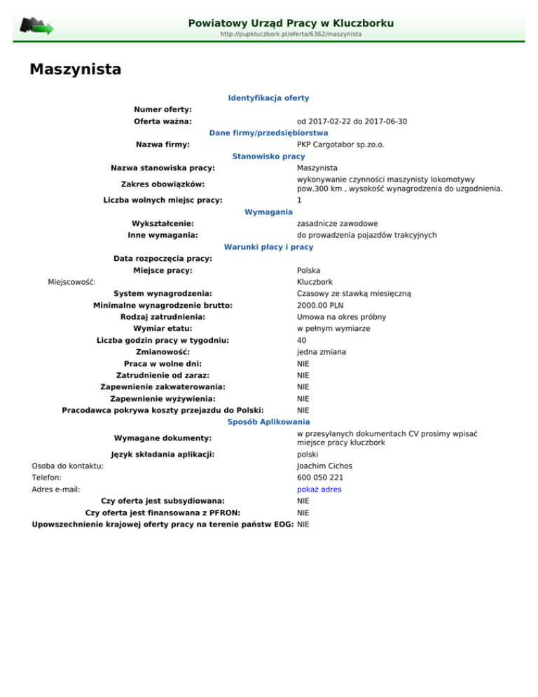 Maszynista - Powiatowy Urząd Pracy w Kluczborku