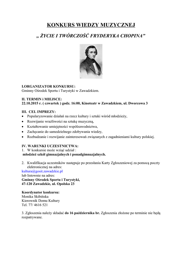 KONKURS WIEDZY MUZYCZNEJ ,, ŻYCIE I TWÓRCZOŚĆ FRYDERYKA CHOPINA” I.ORGANIZATOR KONKURSU: Gminny Ośrodek Sportu i Turystyki w Zawadzkiem. II. TERMIN i MIEJSCE: 22.10.2015 r. ( czwartek ) godz. 16:00, Kinoteatr w Zawadzkiem, ul. Dworcowa 3 III. CEL IMPREZY: Popularyzowanie działań na rzecz kultury i sztuki wśród młodzieży, Rozwijanie wrażliwości na sztukę muzyczną, Kształtowanie umiejętności współzawodnictwa, Zachęcanie do samodzielnego zdobywania wiedzy, Rozbudzanie i rozwijanie zainteresowań związanych z zagadnieniami kultury polskiej. IV. WARUNKI UCZESTNICTWA: 1. W konkursie może wziąć udział : młodzież szkół gimnazjalnych i ponadgimnazjalnych. 2. Kwalifikacja uczestników następuje po przesłaniu Karty Zgłoszeniowej za pomocą poczty elektronicznej na adres: [email protected] lub listownie na adres: Gminny Ośrodek Sportu i Turystyki, 47-120 Zawadzkie, ul. Opolska 23 Koordynator konkursu: Monika Skibińska Kierownik Domu Kultury Tel. 77/ 4616 521 3. Zgłoszenia należy składać do 16 października br. Zgłoszenia złożone po terminie nie będą rozpatrywane. REGULAMIN KONKURSU 1. Konkurs skierowany jest do młodzieży szkół gimnazjalnych i ponadgimnazjalnych z terenu gminy Zawadzkie. 2. Jednym z głównych kryteriów decydującym o zakwalifikowaniu do udziału w konkursie decyduje terminowe złożenie kompletu dokumentów- czyli formularza zgłoszeniowego. 3. Z uwagi na kryteria wiekowe uczestników- zgłoszenia do konkursu dokonywane są przez rodziców, opiekunów lub przez przedstawicieli szkoły. Z tego powodu - zgłoszenie powinno być podpisane przez zgłaszającego i uczestnika konkursu. ( Nie dotyczy uczestników powyżej 18 roku życia. ) 4. Organizator w razie potrzeby a także w szczególności w razie wystąpienia przeszkód, z przyczyn od niego niezależnych, zastrzega sobie prawo do ewentualnej zmiany postanowień Regulaminu. Organizator zobowiązuje się powiadomienia uczestników o wszelkich zmianach telefonicznie lub poprzez internet, lub jakikolwiek inny sposób, z odpowiednim wyprzedzeniem. W sytuacji wyjątkowej, Organizator zastrzega sobie prawo do odwołania konkursu. W takiej sytuacji wszystkie osoby zgłoszone i zakwalifikowane zostaną o tym fakcie poinformowane. 5. Nagrody: Organizatorzy przewidują: Dyplomy i nagrody rzeczowe za zajęcie I,II i III miejsca. 6. Decyzje JURY są ostateczne i niepodważalne, nie przysługuje im odwołanie. 7. Konkurs będzie składał się z dwóch części: pisemnej i słuchowej. część pisemna - test wiedzy o Fryderyku Chopinie, część słuchowa - utwory do rozpoznania. 8. Zagadnienia konkursowe: CZĘŚĆ PISEMNA I. Dzieciństwo i młodość F. Chopina 1. Lata nauki 2. Pierwsze kompozycje i koncerty 3. Podróże II. Fryderyk Chopin- lata dojrzałe 1. Życie na emigracji: Wiedeń i Paryż 2. Twórczość 3. Ostatnie lata życia kompozytora III. Konkursy Chopinowskie - Polscy laureaci Bibliografia: Bohdan Muchenberg: ,, Pogadanki o muzyce” cz. II, Wydawnictwo: PWN. CZĘŚĆ SŁUCHOWA: 1. Koncert fortepianowy Nr 1 e-moll Op.11 2. Etiuda Rewolucyjna 3. Polonez A-dur 4. Walc a-moll 5. Grand Valse brilliante Es-dur Op.18 6. Marsz żałobny 7. Walc cis-moll 8. Polonez As-dur op. 53 9. Nokturn Es- dur Nr 2 Op.9 10. Pieśni Chopina: - Życzenie - Piosnka Litewska