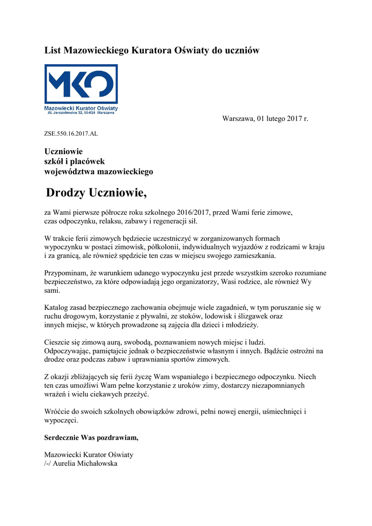 List Mazowieckiego Kuratora Oświaty do uczniów Warszawa, 01 lutego 2017 r. ZSE.550.16.2017.AL Uczniowie szkół i placówek województwa mazowieckiego Drodzy Uczniowie, za Wami pierwsze półrocze roku szkolnego 2016/2017, przed Wami ferie zimowe, czas odpoczynku, relaksu, zabawy i regeneracji sił. W trakcie ferii zimowych będziecie uczestniczyć w zorganizowanych formach wypoczynku w postaci zimowisk, półkolonii, indywidualnych wyjazdów z rodzicami w kraju i za granicą, ale również spędzicie ten czas w miejscu swojego zamieszkania. Przypominam, że warunkiem udanego wypoczynku jest przede wszystkim szeroko rozumiane bezpieczeństwo, za które odpowiadają jego organizatorzy, Wasi rodzice, ale również Wy sami. Katalog zasad bezpiecznego zachowania obejmuje wiele zagadnień, w tym poruszanie się w ruchu drogowym, korzystanie z pływalni, ze stoków, lodowisk i ślizgawek oraz innych miejsc, w których prowadzone są zajęcia dla dzieci i młodzieży. Cieszcie się zimową aurą, swobodą, poznawaniem nowych miejsc i ludzi. Odpoczywając, pamiętajcie jednak o bezpieczeństwie własnym i innych. Bądźcie ostrożni na drodze oraz podczas zabaw i uprawniania sportów zimowych. Z okazji zbliżających się ferii życzę Wam wspaniałego i bezpiecznego odpoczynku. Niech ten czas umożliwi Wam pełne korzystanie z uroków zimy, dostarczy niezapomnianych wrażeń i wielu ciekawych przeżyć. Wróćcie do swoich szkolnych obowiązków zdrowi, pełni nowej energii, uśmiechnięci i wypoczęci. Serdecznie Was pozdrawiam, Mazowiecki Kurator Oświaty /-/ Aurelia Michałowska
