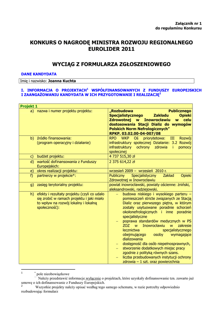 Załącznik nr 1 do regulaminu Konkursu KONKURS O NAGRODĘ MINISTRA ROZWOJU REGIONALNEGO EUROLIDER 2011 WYCIĄG Z FORMULARZA ZGŁOSZENIOWEGO DANE KANDYDATA Imię i nazwisko: Joanna Kuchta I. INFORMACJA O PROJEKTACH1 WSPÓŁFINANSOWANYCH Z FUNDUSZY EUROPEJSKICH I ZAANGAśOWANIU KANDYDATA W ICH PRZYGOTOWANIE I REALIZACJĘ2 Projekt 1 a) nazwa i numer projektu projektu: b) źródło finansowania: (program operacyjny i działanie) c) budŜet projektu: d) wartość dofinansowania z Funduszy Europejskich: e) okres realizacji projektu: f) partnerzy w projekcie*: g) zasięg terytorialny projektu: h) efekty i rezultaty projektu (czyli co udało się zrobić w ramach projektu i jaki miało to wpływ na rozwój lokalny i lokalną społeczność): 1 * „Rozbudowa Publicznego Specjalistycznego Zakładu Opieki Zdrowotnej w Inowrocławiu w celu dostosowania Stacji Dializ do wymogów Polskich Norm Nefrologicznych” RPKP. 03.02.00-04-007/08 RPO WKP Oś priorytetowa: III Rozwój infrastruktury społecznej Działanie: 3.2 Rozwój infrastruktury ochrony zdrowia i pomocy społecznej 4 737 515,30 zł 2 375 614,22 zł wrzesień 2009 – wrzesień 2010 r. Publiczny Specjalistyczny Zakład Opieki Zdrowotnej w Inowrocławiu powiat inowrocławski, powiaty ościenne: Ŝniński, aleksandrowski, radziejowski. − budowa niskiego i wysokiego parteru – pomieszczeń stricte związanych ze Stacją Dializ oraz pierwszego piętra, w którym zostały usytuowane poradnie schorzeń okołonefrologicznych i inne poradnie specjalistyczne − poprawa standardów medycznych w PS ZOZ w Inowrocławiu w zakresie lecznictwa specjalistycznego obejmującego osoby wymagające dializowania − dostępność dla osób niepełnosprawnych, − stworzenie dodatkowych miejsc pracy zgodnie z polityką równych szans. − liczba przebudowanych instytucji ochrony zdrowia – 1 szt. oraz powierzchnia pole nieobowiązkowe NaleŜy przedstawić informacje wyłącznie o projektach, które uzyskały dofinansowanie tzn. zawarto juŜ umowę o ich dofinansowanie z Funduszy Europejskich. 2 Wszystkie projekty naleŜy opisać według tego samego schematu, w razie potrzeby odpowiednio rozbudowując formularz − − − − − − − i) przebudowanych/rozbudowanych obiektów ochrony zdrowia – 1250 m2 potencjalna liczba specjalistycznych świadczeń medycznych przeprowadzonych w Stacji Dializ – 13097 szt. poprawa standardu medycznego w PS ZOZ w Inowrocławiu w zakresie lecznictwa specjalistycznego obejmującego osoby wymagające dializowania poprzez spełnienie standardów wytyczonych przez Polskie Normy Nefrologiczne, zwiększenie bezpieczeństwa zdrowotnego pacjentów przewlekle chorych wymagających częstego dializowania, wykluczenie konieczności przewoŜenia do ośrodka sąsiedniego z naraŜeniem ich Ŝycia lepsze zaspokajanie potrzeb pacjentów korzystających z usług dializacyjnych poprawa warunków hignienicznosanitarnych i technicznych pomieszczeń Stacji Dializ poprawa komfortu pacjentów unowocześnienie infrastruktury Stacji Dializ Tak/ Nie projekt został juŜ zrealizowany (zaznaczyć właściwe): j) projekt jest w trakcie realizacji (zaznaczyć właściwe): ZaangaŜowanie kandydata w Projekt 1. Czy kandydat: k) jest pomysłodawcą projektu Tak/ Nie l) uczestniczył w przygotowaniu projektu lub wniosku o dofinansowanie projektu m) jest/był bezpośrednio zaangaŜowany w realizację projektu Tak/Nie Tak/ Nie Tak/ Nie W jakim zakresie? Opis: W jakim zakresie? Jakie zadania wykonywał? Opis: kandydat był Pełnomocnikiem ds. przygotowania Indywidualnego Projektu Kluczowego i monitorował gotowość projektu do złoŜenia w Instytucji Zarządzającej(comiesięczne raporty składane w IZ), był współautorem projektu oraz nadzorował przygotowanie studium wykonalności i wniosku o dofinansowanie. Prowadził w imieniu Beneficjenta wraz z partnerem projektu PSZOZ w Inowrocławiu negocjacje z Instytucją Zarządzającą w zakresie zakresu rzeczowego projektu i kwalifikowalności wydatków. W jakim zakresie? Jakie zdania/czynności wykonuje/wykonywał? Opis: kandydat był koordynatorem projektu w imieniu Beneficjenta, monitorował postęp rzeczowy i finansowy, monitorował wspólnie z n) prowadzi/prowadził swoje działania związane z realizacją projektu w ramach obowiązków słuŜbowych, czy te działania wykraczają poza jego obowiązki słuŜbowe o) realizuje/realizował swoje działania związane z realizację projektu w sposób partnerski i na czym polegało partnerstwo (np. czy prowadził konsultacje społeczne, czy informował społeczność o swoich działaniach, czy zapraszał do udziału w projekcie inne podmioty itp.) partnerem projektu pomiar wskaźników i rezultatów, nadzorował realizację projektu w zakresie wypełniania horyzontalnych polityk wspólnotowych, prowadził zarządzanie finansowe : nadzorował przygotowanie wniosków o płatność z częścią sprawozdawczą, co miesięcznych harmonogramów płatności, opracował strukturę zarządzania projektem, prowadził promocję projektu , reprezentował Beneficjenta podczas kontroli problemowych realizacji projektu. W ramach projektu zrealizowano takŜe: wykonanie tablicy informacyjnej, wykonanie dwóch tablic pamiątkowych, zorganizowanie konferencji inaugurującej oraz podsumowującej projekt, opublikowanie ogłoszeń, informacji w mediach regionalnych i lokalnych (dzienników innych publikacji, w tym równieŜ portali internetowych, Polskiej Agencji Prasowej), opracowanie folderu informacyjnego oraz gadŜetów promujących projekt. W trakcie realizacji projektu społeczność była informowana o poszczególnych etapach projektu, a po jego zakończeniu o osiągniętych rezultatach. Dodatkowo informacje dotyczące projektu opublikowane zostały na podstronie projektu do istniejącej domeny witryny Powiatu Inowrocławskiego. prowadził swoje działania związane z realizacją projektu w ramach obowiązków słuŜbowych realizował swoje działania związane z realizacją