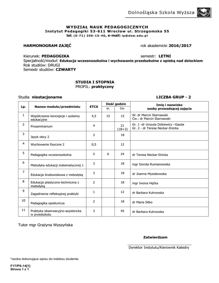WYDZIAŁ NAUK PEDAGOGICZNYCH HARMONOGRAM ZAJĘĆ rok