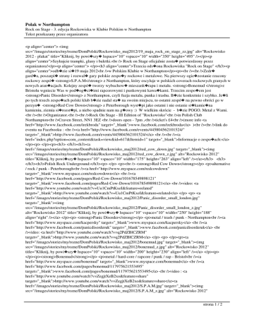 Polak w Northampton Rock on Stage - 3. edycja Rockowiska w Klubie Polskim w Northampton Tekst przekazany przez organizatora <p align="center"> <img src="/images/stories/my/rozne/DomPolski/Rockowisko_maj2012/19_maja_rock_on_stage_zz.jpg" alt="Rockowisko 2012 - plakat" title="Kliknij, by powi�szy� hspace="10" vspace="10" width="350" height="495" /></p><p align="center">Szykujcie trampki, glany i baletki.<br /> Rock on Stage oficjalnie zosta� potwierdzony przez organizatora!</p><p align="center"> </p><h3 align="center">Trzecia ods�ona Rockowiska "Rock on Stage" </h3><p align="center">odb�zie si�19 maja 2012<br />w Polskim Klubie w Northampton</p><p><br /><br />Zedr� gard�a, poszarpi� struny i rozwal� gary polskie zespo�y rockowe i metalowe. Na pierwszy ogie�zostanie rzucony rockowy zespó� <strong>S.P.A.M</strong> z Northampton, który oscyluje w polskich coverach rockowych granych w nowych aran�acjach. Kolejny zespó� tworzy wybuchow� mieszank�rapu i metalu. <strong>Bonemud </strong>z Bristolu wgniecie Was w pod�og�ci�imi rapcorowymi i punkowymi kawa�kami. Trzecim zespo�em jest <strong>Panic Disorder</strong> z Northampton, czyli fuzja metalu, punka i trashu. B�zie konkretnie i szybko. Je�li po tych trzech zespo�ach polski klub b�zie nadal sta� na swoim miejscu, to ostatni zespó� na pewno obróci go w perzyn� <strong>Red Cow Down</strong> z Peterborough wyst�pi jako ostatni i nie ostanie si�kamie�na kamieniu, ziemia si�rozst�pi, a niebo spadnie nam na g�owy :) W wielkim skrócie - b�zie POGO. Metal z Wami. <br /><br />Organizator.<br /><br />Rock On Stage - III Edition of "Rockowisko"<br />in Polish Club Northampton<br />Craven Street, NN1 3EZ <br />doors open - 7pm ,<br />ticket's £4<br />(more info <a href="http://www.facebook.com/irekbroda" target="_blank">www.facebook.com/irekbroda</a> )<br /><br />link do eventu na Facebooku : <br /><a href="http://www.facebook.com/events/445804562101524/" target="_blank">http://www.facebook.com/events/445804562101524/</a> <br /><br /><a href="index.php?option=com_content&task=view&id=617&Itemid=1" target="_blank">Informacje o zespo�ach:</a> </p><p> </p><p><h3> </h3><h3><a href="/images/stories/my/rozne/DomPolski/Rockowisko_maj2012/red_cow_down.jpg" target="_blank"><img src="/images/stories/my/rozne/DomPolski/Rockowisko_maj2012/red_cow_down_z.jpg" alt="Rockowisko 2012" title="Kliknij, by powi�szy� hspace="10" vspace="10" width="175" height="263" align="left" /></a></h3> <h3> </h3><h3>Polish Rock Underground:</h3><p> </p> <p><br /> <strong>Red Cow Down</strong></p> <p>alternative / rock / punk - Peterborough<br /><a href="http://www.myspace.com/redcowdown" target="_blank">www.myspace.com/redcowdown</a> <br /><a href="http://www.facebook.com/pages/Red-Cow-Down/101678549898121" target="_blank">www.facebook.com/pages/Red-Cow-Down/101678549898121</a> <br />video: <a href="http://www.youtube.com/watch?v=Uu1CmPtKxeI&feature=related" target="_blank">http://www.youtube.com/watch?v=Uu1CmPtKxeI&feature=related</a> </p> <p> <a href="/images/stories/my/rozne/DomPolski/Rockowisko_maj2012/Panic_disorder_small_london.jpg" target="_blank"><img src="/images/stories/my/rozne/DomPolski/Rockowisko_maj2012/Panic_disorder_small_london_z.jpg" alt="Rockowisko 2012" title="Kliknij, by powi�szy� hspace="10" vspace="10" width="250" height="188" align="right" /></a> </p><p> <strong>Panic Disorder</strong></p> <p>metal / trash / punk - Northampton<br /><a href="http://www.myspace.com/kacpersky" target="_blank">www.myspace.com/kacpersky</a> <br /><a href="http://www.facebook.com/panicdisorderuk" target="_blank">www.facebook.com/panicdisorderuk</a> <br />video: <a href="http://www.youtube.com/watch?v=q2PdZBlCZRM" target="_blank">http://www.youtube.com/watch?v=q2PdZBlCZRM</a> </p> <p> </p><p><a href="/images/stories/my/rozne/DomPolski/Rockowisko_maj2012/bonemud.jpg" target="_blank"><img src="/images/stories/my/rozne/DomPolski/Rockowisko_maj2012/bonemud_z.jpg" alt="Rockowisko 2012" title="Kliknij, by powi�szy� hspace="10" vspace="10" width="200" height="230" align="left" /></a> </p><p> </p><p><strong>Bonemud</strong></p> <p>metal / hard-core / rapcore / punk / rap - Bristol<br /><a href="http://www.myspace.com/bonemud" target="_blank">www.myspace.com/bonemud</a> <br /><a href="http://www.facebook.com/pages/bonemud/117975621553495" target="_blank">www.facebook.com/pages/bonemud/117975621553495</a> <br />video : <a href="http://www.youtube.com/watch?v=ZegjtXeB2xo&feature=share" target="_blank">http://www.youtube.com/watch?v=ZegjtXeB2xo&feature=share</a><a href="/images/stories/my/rozne/DomPolski/Rockowisko_maj2012/S.P.A.M.jpg" target="_blank"><img src="/images/stories/my/rozne/DomPolski/Rockowisko_maj2012/S.P.A.M_z.jpg" alt="Rockowisko 2012" strona 1 / 2 Polak w Northampton Rock on Stage - 3. edycja Rockowiska w Klubie Polskim w Northampton Tekst przekazany przez organizatora title="Kliknij, by powi�szy� hspace="10" vspace="10" width="250" height="166" align="right" /></a> </p><p> </p><p><strong>S.P.A.M</strong> </p><p>rock - Northampton<br /><a href="http://www.myspace.com/s.p.a.m" target="_blank">www.myspace.com/s.p.a.m</a> <br /><a href="http://www.facebook.com/pages/SPAM/226912460738321" target="_blank">www.facebook.com/pages/SPAM/226912460738321 </a> </p><p> </p><p> </p> strona 2 / 2