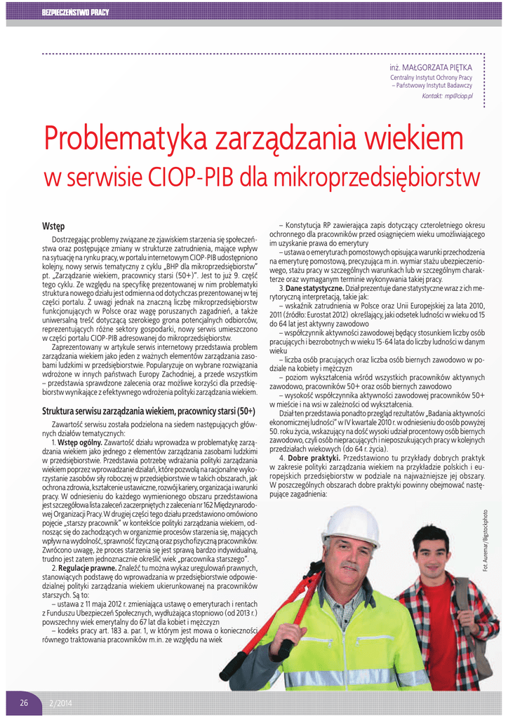 in¿. MA£GORZATA PIÊTKA Centralny Instytut Ochrony Pracy – Pañstwowy Instytut Badawczy Kontakt: [email protected] Problematyka zarz¹dzania wiekiem w serwisie CIOP-PIB dla mikroprzedsiêbiorstw Dostrzegaj¹c problemy zwi¹zane ze zjawiskiem starzenia siê spo³eczeñstwa oraz postêpuj¹ce zmiany w strukturze zatrudnienia, maj¹ce wp³yw na sytuacjê na rynku pracy, w portalu internetowym CIOP-PIB udostêpniono kolejny, nowy serwis tematyczny z cyklu „BHP dla mikroprzedsiêbiorstw” pt. „Zarz¹dzanie wiekiem, pracownicy starsi (50+)”. Jest to ju¿ 9. czêļæ tego cyklu. Ze wzglêdu na specyfikê prezentowanej w nim problematyki struktura nowego dzia³u jest odmienna od dotychczas prezentowanej w tej czêļci portalu. Z uwagi jednak na znaczn¹ liczbê mikroprzedsiêbiorstw funkcjonuj¹cych w Polsce oraz wagê poruszanych zagadnieñ, a tak¿e uniwersaln¹ treļæ dotycz¹c¹ szerokiego grona potencjalnych odbiorców, reprezentuj¹cych ró¿ne sektory gospodarki, nowy serwis umieszczono w czêļci portalu CIOP-PIB adresowanej do mikroprzedsiêbiorstw. Zaprezentowany w artykule serwis internetowy przedstawia problem zarz¹dzania wiekiem jako jeden z wa¿nych elementów zarz¹dzania zasobami ludzkimi w przedsiêbiorstwie. Popularyzuje on wybrane rozwi¹zania wdro¿one w innych pañstwach Europy Zachodniej, a przede wszystkim – przedstawia sprawdzone zalecenia oraz mo¿liwe korzyļci dla przedsiêbiorstw wynikaj¹ce z efektywnego wdro¿enia polityki zarz¹dzania wiekiem. Struktura serwisu zarz¹dzania wiekiem, pracownicy starsi (50+) Zawartoļæ serwisu zosta³a podzielona na siedem nastêpuj¹cych g³ównych dzia³ów tematycznych: 1. Wstêp ogólny. Zawartoļæ dzia³u wprowadza w problematykê zarz¹dzania wiekiem jako jednego z elementów zarz¹dzania zasobami ludzkimi w przedsiêbiorstwie. Przedstawia potrzebê wdra¿ania polityki zarz¹dzania wiekiem poprzez wprowadzanie dzia³añ, które pozwol¹ na racjonalne wykorzystanie zasobów si³y roboczej w przedsiêbiorstwie w takich obszarach, jak ochrona zdrowia, kszta³cenie ustawiczne, rozwój kariery, organizacja i warunki pracy. W odniesieniu do ka¿dego wymienionego obszaru przedstawiona jest szczegó³owa lista zaleceñ zaczerpniêtych z zalecenia nr 162 Miêdzynarodowej Organizacji Pracy. W drugiej czêļci tego dzia³u przedstawiono omówiono pojêcie „starszy pracownik” w kontekļcie polityki zarz¹dzania wiekiem, odnosz¹c siê do zachodz¹cych w organizmie procesów starzenia siê, maj¹cych wp³yw na wydolnoļæ, sprawnoļæ fizyczn¹ oraz psychofizyczn¹ pracowników. Zwrócono uwagê, ¿e proces starzenia siê jest spraw¹ bardzo indywidualn¹, trudno jest zatem jednoznacznie okreļliæ wiek „pracownika starszego”. 2. Regulacje prawne. ZnaleŚæ tu mo¿na wykaz uregulowañ prawnych, stanowi¹cych podstawê do wprowadzania w przedsiêbiorstwie odpowiedzialnej polityki zarz¹dzania wiekiem ukierunkowanej na pracowników starszych. S¹ to: – ustawa z 11 maja 2012 r. zmieniaj¹ca ustawê o emeryturach i rentach z Funduszu Ubezpieczeñ Spo³ecznych, wyd³u¿aj¹ca stopniowo (od 2013 r.) powszechny wiek emerytalny do 67 lat dla kobiet i mê¿czyzn – kodeks pracy art. 183 a. par. 1, w którym jest mowa o koniecznoļci równego traktowania pracowników m.in. ze wzglêdu na wiek 26 2/2014 – Konstytucja RP zawieraj¹ca zapis dotycz¹cy czteroletniego okresu ochronnego dla pracowników przed osi¹gniêciem wieku umo¿liwiaj¹cego im uzyskanie prawa do emerytury – ustawa o emeryturach pomostowych opisuj¹ca warunki przechodzenia na emeryturê pomostow¹, precyzuj¹ca m.in. wymiar sta¿u ubezpieczeniowego, sta¿u pracy w szczególnych warunkach lub w szczególnym charakterze oraz wymaganym terminie wykonywania takiej pracy. 3. Dane statystyczne. Dzia³ prezentuje dane statystyczne wraz z ich merytoryczn¹ interpretacj¹, takie jak: – wskaŚnik zatrudnienia w Polsce oraz Unii Europejskiej za lata 2010, 2011 (Śród³o: Eurostat 2012) okreļlaj¹cy, jaki odsetek ludnoļci w wieku od 15 do 64 lat jest aktywny zawodowo – wspó³czynnik aktywnoļci zawodowej bêd¹cy stosunkiem liczby osób pracuj¹cych i bezrobotnych w wieku 15-64 lata do liczby ludnoļci w danym wieku – liczba osób pracuj¹cych oraz liczba osób biernych zawodowo w podziale na kobiety i mê¿czyzn – poziom wykszta³cenia wļród wszystkich pracowników aktywnych zawodowo, pracowników 50+ oraz osób biernych zawodowo – wysokoļæ wspó³czynnika aktywnoļci zawodowej pracowników 50+ w mieļcie i na wsi w zale¿noļci od wykszta³cenia. Dzia³ ten przedstawia ponadto przegl¹d rezultatów „Badania aktywnoļci ekonomicznej ludnoļci” w IV kwartale 2010 r. w odniesieniu do osób powy¿ej 50. roku ¿ycia, wskazuj¹cy na doļæ wysoki udzia³ procentowy osób biernych zawodowo, czyli osób niepracuj¹cych i nieposzukuj¹cych pracy w kolejnych przedzia³ach wiekowych (do 64 r. ¿ycia). 4. Dobre praktyki. Przedstawiono tu przyk³ady dobrych praktyk w zakresie polityki zarz¹dzania wiekiem na przyk³adzie polskich i europejskich przedsiêbiorstw w podziale na najwa¿niejsze jej obszary. W poszczególnych obszarach dobre praktyki powinny obejmowaæ nastêpuj¹ce zagadnienia: Fot. Auremar/Bigstockphoto Wstêp – utrzymywanie w zatrudnieniu/rekrutacja – otwarty dla wszystkich kategorii wiekowych dostêp do pracy – kszta³cenie ustawiczne – zapewnienie starszym pracownikom mo¿liwoļci rozwoju zawodowego oraz równego dostêpu do kszta³cenia – rozwój kariery zawodowej – mo¿liwoļæ awansu i pewnoļæ zatrudnienia dla starszych pracowników poprzez zapewnienie rozwoju zawodowego – elastyczny czas pracy – zapewnienie ró¿nych form elastycznego czasu pracy – promocja zdrowia – umo¿liwienie pracownikom kontroli w³asnego zdrowia i jego poprawy – przeniesienia miêdzy stanowiskami – dopasowanie wymagañ pracy do mo¿liwoļci starszych pracowników – przygotowanie do emerytury – zmniejszanie liczby godzin pracy. Dzi