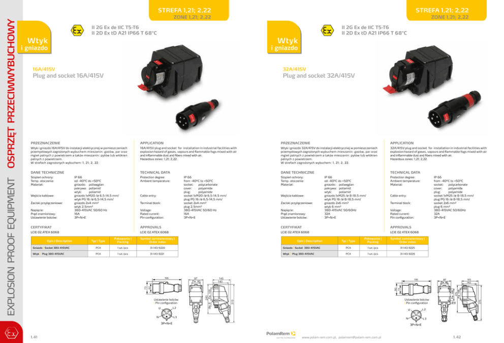 STREFA 1,21; 2,22 ZONE 1,21; 2,22 ZONE 1,21; 2,22 II 2G Ex de IIC T5-T6 II 2D Ex tD A21 IP66 T 68°C II 2G Ex de IIC T5-T6 II 2D Ex tD A21 IP66 T 68°C Wtyk i gniazdo i gniazdo 16A/415V 32A/415V Plug and socket 16A/415V Plug and socket 32A/415V PRZEZNACZENIE APPLICATION PRZEZNACZENIE APPLICATION Wtyk i gniazdo 16A/415V do instalacji elektrycznej w pomieszczeniach przemysłowych zagrożonych wybuchem mieszanin: gazów, par oraz mgieł palnych z powietrzem a także mieszanin: pyłów lub włókien palnych z powietrzem. W strefach zagrożonych wybuchem: 1, 21; 2, 22. 16A/415V plug and socket for installation in industrial facilities with explosion hazard of gases, vapours and flammable fogs mixed with air and inflammable dust and fibers mixed with air. Hazardous zones: 1,21; 2,22. Wtyk i gniazdo 32A/415V do instalacji elektrycznej w pomieszczeniach przemysłowych zagrożonych wybuchem mieszanin: gazów, par oraz mgieł palnych z powietrzem a także mieszanin: pyłów lub włókien palnych z powietrzem. W strefach zagrożonych wybuchem: 1, 21; 2, 22. 32A/415V plug and socket for installation in industrial facilities with explosion hazard of gases, vapours and flammable fogs mixed with air and inflammable dust and fibers mixed with air. Hazardous zones: 1,21; 2,22. DANE TECHNICZNE TECHNICAL DATA DANE TECHNICZNE TECHNICAL DATA Stopień ochrony: Temp. otoczenia: Materiał: Wejścia kablowe: Zaciski przyłączeniowe: Napięcie: Prąd znamionowy: Ustawienie bolców: IP 66 od -40⁰C do +50⁰C gniazdo: poliwęglan pokrywa: poliamid wtyk: poliamid gniazdo 1xM20 /ø 6,5-14,5 mm/ wtyk PG 16 /ø 6,5-14,5 mm/ gniazdo 2x4 mm² wtyk 2,5mm² 380-415VAC 50/60 Hz 16A 3P+N+E Protection degree: Ambient temperature: IP 66 from -40⁰C to +50⁰C socket: polycarbonate cover: polyamide plug: polyamide socket 1xM20 /ø 6,5-14,5 mm/ plug PG 16 /ø 6,5-14,5 mm/ socket 2x4 mm² plug 2,5mm² 380-415VAC 50/60 Hz 16A 3P+N+E Cable entry: Terminal block: Voltage: Rated current: Pin configuration: Stopień ochrony: Temp. otoczenia: Materiał: Wejścia kablowe: Zaciski przyłączeniowe: Napięcie: Prąd znamionowy: Ustawienie bolców: IP 66 od -40⁰C do +50⁰C gniazdo: poliwęglan pokrywa: poliamid wtyk: poliamid gniazdo 1xM25 /ø 8-18,5 mm/ wtyk PG 16 /ø 8-18,5 mm/ gniazdo 2x6 mm² wtyk 6 mm² 380-415VAC 50/60Hz 32A 3P+N+E Protection degree: Ambient temperature: Material: Terminal block: Voltage: Rated current: Pin configuration: APPROVALS CERTYFIKAT APPROVALS LCIE 02 ATEX 6068 LCIE 02 ATEX 6068 LCIE 02 ATEX 6068 LCIE 02 ATEX 6068 Typ | Type Pakowanie | Packing Symbol zamówieniowy | Order index Gniazdo | Socket 380-415VAC PCX 1 szt./pcs 31-143-9220 Wtyk | Plug 380-415VAC PCX 1 szt./pcs 31-143-9221 Opis | Description IP 66 from -40⁰C to +50⁰C socket: polycarbonate cover: polyamide plug: polyamide socket 1xM25 /ø 8-18,5 mm/ plug PG 16 /ø 8-18,5 mm/ socket 2x6 mm² plug 6 mm² 380-415VAC 50/60Hz 32A 3P+N+E Cable entry: CERTYFIKAT Typ | Type Pakowanie | Packing Symbol zamówieniowy | Order index Gniazdo | Socket 380-415VAC PCX 1 szt./pcs 31-143-9225 Wtyk | Plug 380-415VAC PCX 1 szt./pcs 31-143-9226 Opis | Description 166 195 165 140 275 74 80 62 73 Ustawienie bolców | Pin configuration Ustawienie bolców | Pin configuration L2 L1 N 6h L3 N 3P+N+E 1.41 L2 L1 6h 375 EXPLOSION PROOF EQUIPMENT OSPRZĘT PRZECIWWYBUCHOWY Wtyk STREFA 1,21; 2,22 L3 3P+N+E www.polam-rem.com.pl, [email protected] 1.42