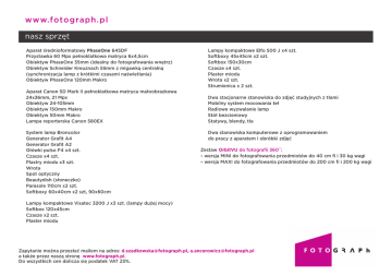 www.fo to gra p h.p l nasz sprzęt Aparat średnioformatowy PhaseOne 645DF Przystawka 60 Mpx pełnoklatkowa matryca 6x4,5cm Obiektyw PhaseOne 35mm (idealny do fotografowania wnętrz) Obiektyw Schneider Kreuznach 55mm z migawką centralną (synchronizacja lamp z krótkimi czasami naświetlania) Obiektyw PhaseOne 120mm Makro Aparat Canon 5D Mark II pełnoklatkowa matryca małoobrazkowa 24x36mm, 21 Mpx Obiektyw 24-105mm Obiektyw 150mm Makro Obiektyw 50mm Makro Lampa reporterska Canon 580EX System lamp Broncolor Generator Grafit A4 Generator Grafit A2 Główki pulso F4 x4 szt. Czasze x4 szt. Plastry miodu x3 szt. Wrota Spot optyczny Beautydish (słoneczko) Parasole 110cm x2 szt. Softboxy 60x40cm x2 szt, 90x60cm Lampy kompaktowe Elfo 500 J x4 szt. Softboxy 45x45cm x2 szt. Softbox 150x30cm Czasze x4 szt. Plaster miodu Wrota x2 szt. Strumienica x 2 szt. Dwa stacjonarne stanowiska do zdjęć studyjnych z tłami Mobilny system mocowania teł Radiowe wyzwalanie lamp Stół bezcieniowy Statywy, blendy, tła Dwa stanowiska komputerowe z oprogramowaniem do pracy z aparatem i obróbki zdjęć Zestaw OrbitVU do fotografii 360˚: – wersja MINI do fotografowania przedmiotów do 40 cm fi i 30 kg wagi – wersja MAXI do fotografowania przedmiotów do 200 cm fi i 200 kg wagi Lampy kompaktowe Visatec 3200 J x3 szt. (lampy dużej mocy) Softbox 120x45cm Czasze x2 szt. Plaster miodu Zapytanie można przesłać mailem na adres: [email protected], [email protected] a także przez naszą stronę www.fotograph.pl. Do wszystkich cen dolicza się podatek VAT 23%.