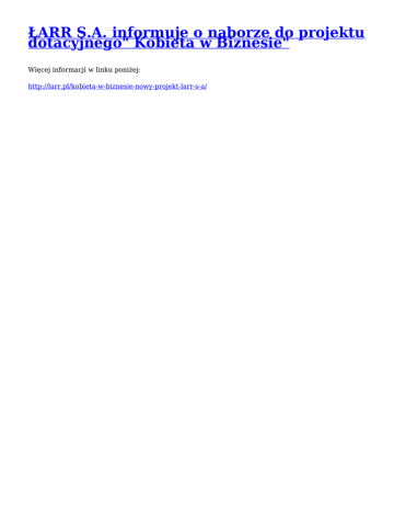 ŁARR S.A. informuje o naborze do projektu dotacyjnego" Kobieta w Biznesie" Więcej informacji w linku poniżej: http://larr.pl/kobieta-w-biznesie-nowy-projekt-larr-s-a/