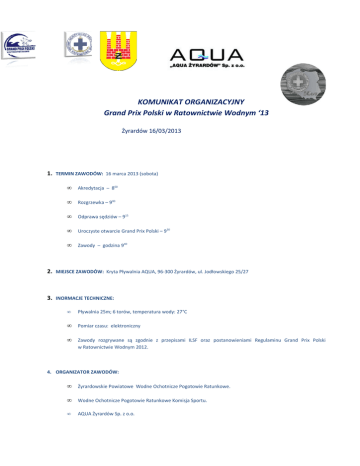 KOMUNIKAT ORGANIZACYJNY Grand Prix Polski w Ratownictwie Wodnym ‘13 Żyrardów 16/03/2013 1. TERMIN ZAWODÓW: 16 marca 2013 (sobota) • Akredytacja – 800 • Rozgrzewka – 900 • Odprawa sędziów – 915 • Uroczyste otwarcie Grand Prix Polski – 930 • Zawody – godzina 940 2. MIEJSCE ZAWODÓW: Kryta Pływalnia AQUA, 96-300 Żyrardów, ul. Jodłowskiego 25/27 3. INORMACJE TECHNICZNE: • Pływalnia 25m; 6 torów, temperatura wody: 27°C • Pomiar czasu: elektroniczny • Zawody rozgrywane są zgodnie z przepisami ILSF oraz postanowieniami Regulaminu Grand Prix Polski w Ratownictwie Wodnym 2012. 4. ORGANIZATOR ZAWODÓW: • Żyrardowskie Powiatowe Wodne Ochotnicze Pogotowie Ratunkowe. • Wodne Ochotnicze Pogotowie Ratunkowe Komisja Sportu. • AQUA Żyrardów Sp. z o.o. 5. PATRONAT: • Prezydent Miasta Żyrardowa Andrzej Wilk 6. PATRONAT MEDIALNY: • GŁOS Żyrardowa i okolic. 7. ZASADY FINANSOWANIA: • Koszty organizacyjne pokrywają organizatorzy • Uczestnicy przyjeżdżają na koszt własny • Opłata startowa wynosi 30 zł od zawodnika 8. ZASADY UCZESTNICTWA: W GP prawo startu mają zawodnicy posiadający ważną legitymację członka WOPR na dany rok oraz aktualne badania lekarskie: a) Zawodnik może startować i być sklasyfikowany wyłącznie w swojej kategorii wiekowej( dot. M i JM ). b) Podczas GP prowadzona będzie klasyfikacja w czterech kategoriach wiekowych: - w kategorii młodzików 12-13 lat (ukończonych w roku rozgrywania zawodów), - w kategorii juniorów młodszych 14-15 lat (ukończonych w roku rozgrywania zawodów), - w kategorii juniorów 16-18 lat (ukończonych w roku rozgrywania zawodów), - w kategorii OPEN. c) W przypadku startu zawodników w kategorii młodzik – wymagane członkowstwo w WOPR oraz ważna legitymacja WOPR. d) W przypadku startu startu w pozostałych kategoriach – wymagany jest stopień minimum Młodszego Ratownika WOPR. • Osoby niepełnoletnie muszą posiadać pisemną zgodę prawnego opiekuna. • Zawodnicy reprezentują własne jednostki terenowe lub wojewódzkie WOPR. • Obecność zawodników na otwarciu i zamknięciu GPP ’13 obowiązkowa. 9. ZGŁOSZENIA DO ZAWODÓW należy przesłać w postaci pliku lenex (*lxf) na adres: [email protected] • Zgłoszenie musi zawierać: imię i nazwisko zawodnika, pełną datę urodzenia (DD/MM/RRRR), nazwę drużyny, dystans, konkurencję oraz najlepszy czas uzyskany w ostatnich 12 miesiącach • Termin zgłoszeń upływa we czwartek 14 marca 2013 10. REGULAMIN ROZGRZEWKI: Tory 1 i 6 są torami jednokierunkowym przeznaczonym również na skoki do wody. Skoki do wody w innych miejscach są niedopuszczalne pod groźbą wykluczenia z zawodów. NAGRODY: 1. Trzech najlepszych zawodników w każdej konkurencji GP otrzymuje medale i dyplomy według zajętych miejsc z podziałem na kobiety i mężczyzn oraz z podziałem na kategorie: młodzików, juniorów młodszych, juniorów i open. 2. Najwszechstronniejszy zawodnik w klasyfikacji generalnej GP otrzymuje pamiątkowy puchar lub statuetkę wg sumy zdobytych punktów wielobojowych z podziałem na kobiety i mężczyzn oraz kategorie młodzik, junior młodszy, junior i open. 11. PROGRAM ZAWODÓW: 1 3 5 7 9 11 13 Kobiety 50m ratowanie manekina (O, J, JM) 25m ratowanie manekina (M) 100m ratowanie manekina w płetwach (O, J,) 50m ratowanie manekina w płetwach ( JM, M) 100m ratowanie kombinowane (O, J ) 50m ratownik ( JM) 100m ratownik (O, J) 2 4 6 8 10 12 14 Mężczyźni 50m ratowanie manekina (O, J, JM) 25m ratowanie manekina (M) 100m ratowanie manekina w płetwach(O, J) 50m ratowanie manekina w płetwach ( JM, M) 100m ratowanie kombinowane (O, J ) 50m ratownik ( JM) 100m ratownik (O, J) 12. POSTANOWIENIA KOŃCOWE: • zgłoszenie do zawodów jest równoznaczne z akceptacją postanowień niniejszego komunikatu oraz Regulaminu Grand Prix Polski w Ratownictwie Wodnym 2012 • Prawo interpretacji Regulaminu Grand Prix w Ratownictwie Wodnym przysługuje organizatorom. • W sprawach nie uregulowanych regulaminem decyduje przedstawiciel Komisji Sportu WOPR • Organizator zastrzega sobie prawo do korekty czasowo – programowej zawodów. 13. PROPOZYCJE ZAKWATEROWANIA HOTEL ADRES 1 Hotel AQUA Żyrardów 96-300Żyrardów Jodłowskiego 25/27 2 Hotel M4 96-300Żyrardów 1Maja 37A 3 Orchidea 96-300 Żyrardów Południowa TELEFON 46 854-16-46 46 855-39-89 601 154 846 46 854 22 93 MAIL WWW [email protected] www.aqua.zyrardow.pl [email protected] www.hotel.zyrardow.pl restauracja @cefido.pl