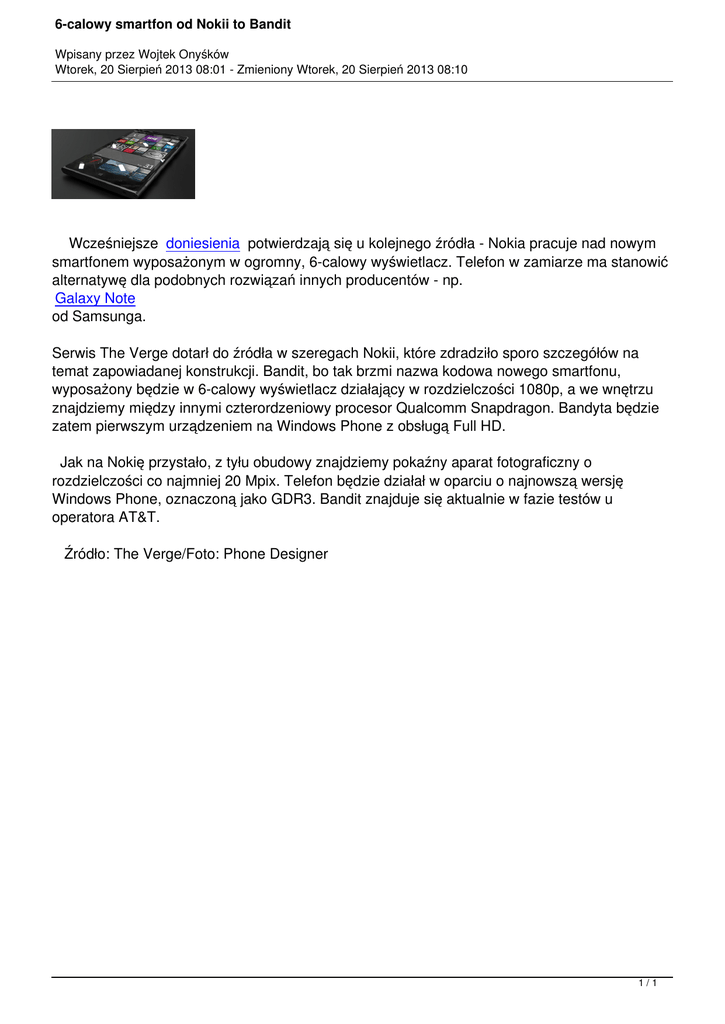 6-calowy smartfon od Nokii to Bandit Wpisany przez Wojtek Onyśków Wtorek, 20 Sierpień 2013 08:01 - Zmieniony Wtorek, 20 Sierpień 2013 08:10 Wcześniejsze doniesienia potwierdzają się u kolejnego źródła - Nokia pracuje nad nowym smartfonem wyposażonym w ogromny, 6-calowy wyświetlacz. Telefon w zamiarze ma stanowić alternatywę dla podobnych rozwiązań innych producentów - np. Galaxy Note od Samsunga. Serwis The Verge dotarł do źródła w szeregach Nokii, które zdradziło sporo szczegółów na temat zapowiadanej konstrukcji. Bandit, bo tak brzmi nazwa kodowa nowego smartfonu, wyposażony będzie w 6-calowy wyświetlacz działający w rozdzielczości 1080p, a we wnętrzu znajdziemy między innymi czterordzeniowy procesor Qualcomm Snapdragon. Bandyta będzie zatem pierwszym urządzeniem na Windows Phone z obsługą Full HD. Jak na Nokię przystało, z tyłu obudowy znajdziemy pokaźny aparat fotograficzny o rozdzielczości co najmniej 20 Mpix. Telefon będzie działał w oparciu o najnowszą wersję Windows Phone, oznaczoną jako GDR3. Bandit znajduje się aktualnie w fazie testów u operatora AT&T. Źródło: The Verge/Foto: Phone Designer 1/1