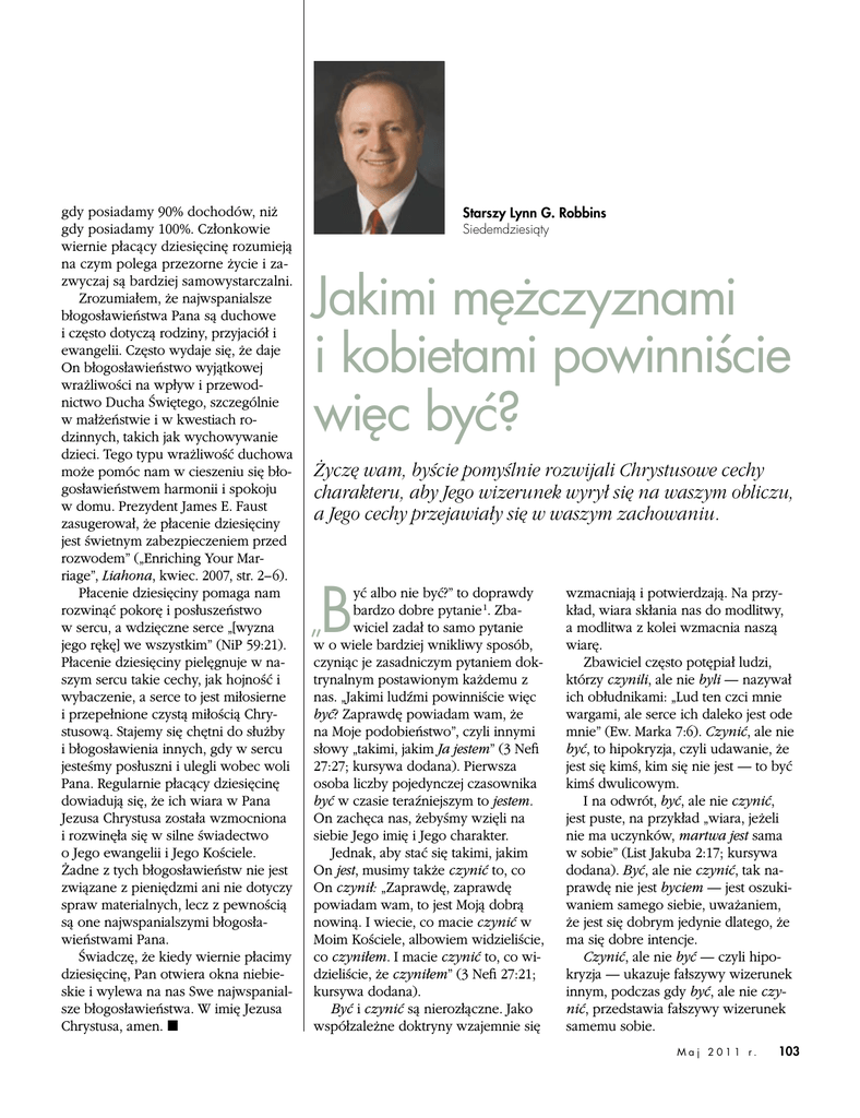 gdy posiadamy 90% dochodów, niż gdy posiadamy 100%. Członkowie wiernie płacący dziesięcinę rozumieją na czym polega przezorne życie i za zwyczaj są bardziej samowystarczalni. Zrozumiałem, że najwspanialsze błogosławieństwa Pana są duchowe i często dotyczą rodziny, przyjaciół i ewangelii. Często wydaje się, że daje On błogosławieństwo wyjątkowej wrażliwości na wpływ i przewod nictwo Ducha Świętego, szczególnie w małżeństwie i w kwestiach ro dzinnych, takich jak wychowywanie dzieci. Tego typu wrażliwość duchowa może pomóc nam w cieszeniu się bło gosławieństwem harmonii i spokoju w domu. Prezydent James E. Faust zasugerował, że płacenie dziesięciny jest świetnym zabezpieczeniem przed rozwodem” („Enriching Your Mar riage”, Liahona, kwiec. 2007, str. 2–6). Płacenie dziesięciny pomaga nam rozwinąć pokorę i posłuszeństwo w sercu, a wdzięczne serce „[wyzna jego rękę] we wszystkim” (NiP 59:21). Płacenie dziesięciny pielęgnuje w na szym sercu takie cechy, jak hojność i wybaczenie, a serce to jest miłosierne i przepełnione czystą miłością Chry stusową. Stajemy się chętni do służby i błogosławienia innych, gdy w sercu jesteśmy posłuszni i ulegli wobec woli Pana. Regularnie płacący dziesięcinę dowiadują się, że ich wiara w Pana Jezusa Chrystusa została wzmocniona i rozwinęła się w silne świadectwo o Jego ewangelii i Jego Kościele. Żadne z tych błogosławieństw nie jest związane z pieniędzmi ani nie dotyczy spraw materialnych, lecz z pewnością są one najwspanialszymi błogosła wieństwami Pana. Świadczę, że kiedy wiernie płacimy dziesięcinę, Pan otwiera okna niebie skie i wylewa na nas Swe najwspanial sze błogosławieństwa. W imię Jezusa Chrystusa, amen. ◼ Starszy Lynn G. Robbins Siedemdziesiąty Jakimi mężczyznami i kobietami powinniście więc być? Życzę wam, byście pomyślnie rozwijali Chrystusowe cechy charakteru, aby Jego wizerunek wyrył się na waszym obliczu, a Jego cechy przejawiały się w waszym zachowaniu. B yć albo nie być?” to doprawdy bardzo dobre pytanie 1. Zba wiciel zadał to samo pytanie w o wiele bardziej wnikliwy sposób, czyniąc je zasadniczym pytaniem dok trynalnym postawionym każdemu z nas. „Jakimi ludźmi powinniście więc być? Zaprawdę powiadam wam, że na Moje podobieństwo”, czyli innymi słowy „takimi, jakim Ja jestem” (3 Nefi 27:27; kursywa dodana). Pierwsza osoba liczby pojedynczej czasownika być w czasie teraźniejszym to jestem. On zachęca nas, żebyśmy wzięli na siebie Jego imię i Jego charakter. Jednak, aby stać się takimi, jakim On jest, musimy także czynić to, co On czynił: „Zaprawdę, zaprawdę powiadam wam, to jest Moją dobrą nowiną. I wiecie, co macie czynić w Moim Kościele, albowiem widzieliście, co czyniłem. I macie czynić to, co wi dzieliście, że czyniłem” (3 Nefi 27:21; kursywa dodana). Być i czynić są nierozłączne. Jako współzależne doktryny wzajemnie się „ wzmacniają i potwierdzają. Na przy kład, wiara skłania nas do modlitwy, a modlitwa z kolei wzmacnia naszą wiarę. Zbawiciel często potępiał ludzi, którzy czynili, ale nie byli — nazywał ich obłudnikami: „Lud ten czci mnie wargami, ale serce ich daleko jest ode mnie” (Ew. Marka 7:6). Czynić, ale nie być, to hipokryzja, czyli udawanie, że jest się kimś, kim się nie jest — to być kimś dwulicowym. I na odwrót, być, ale nie czynić, jest puste, na przykład „wiara, jeżeli nie ma uczynków, martwa jest sama w sobie” (List Jakuba 2:17; kursywa dodana). Być, ale nie czynić, tak na prawdę nie jest byciem — jest oszuki waniem samego siebie, uważaniem, że jest się dobrym jedynie dlatego, że ma się dobre intencje. Czynić, ale nie być — czyli hipo kryzja — ukazuje fałszywy wizerunek innym, podczas gdy być, ale nie czynić, przedstawia fałszywy wizerunek samemu sobie. M a j 2 0 1 1 r. 103 Zbawiciel ganił uczonych w Piśmie i faryzeuszy za ich hipokryzję: „Biada wam, uczeni w Piśmie i faryzeusze, obłudnicy, że dajecie dziesięcinę” — coś, co czynili — „z mięty i z kopru, i z kminku, a zaniedbaliście tego, co ważniejsze w zakonie: sprawiedli wości, miłosierdzia i wierności” (Ew. Mateusza 23:23). Innymi słowy, nie byli tacy, jacy powinni byli być. Doceniając znaczenie słowa czynić, Zbawiciel wskazał na słowo być jako na to, „co ważniejsze”. Większe znaczenie bycia zilustrować można następującymi przykładami: • Wkraczanie w wody chrztu jest czymś, co czynimy. Zanim to uczynimy, musi być wiara w Jezusa Chrystusa i wielka przemiana serca. • Przyjmowanie sakramentu jest czymś, co czynimy. Bycie godnym przyjęcia sakramentu, jest tym, „co ważniejsze” i jest o wiele bardziej znamienną kwestią. • Ustanowienie do kapłaństwa jest czynem. Jednakże tym, co ważniej sze, jest moc w kapłaństwie, która działa „według zasad prawości” (NiP 121:36) — czyli według tego, jakimi jesteśmy. Wielu z nas tworzy listy rzeczy do zrobienia, które przypominają nam o tym, co chcemy osiągnąć. Jednakże ludzie rzadko tworzą listy tego, jakimi chcą być. Dlaczego? Rzeczy do zrobienia to zajęcia i wydarzenia, które łatwo odznaczyć na liście, kiedy je już zrobimy. Bycie jednakże kimś lub czymś nigdy nie ma końca. Bycia nie da się odhaczyć krzyżykiem. Mogę spędzić z żoną wspaniały wieczór w najbliższy piątek, co jest czynieniem. Ale bycie dobrym mężem to nie wy darzenie — to musi być częścią mojej natury i mojego charakteru, czyli tego, kim jestem. 104 Liahona A będąc rodzicem, kiedy mogę odhaczyć pozycję „dziecko” jako załatwione ? Nigdy nie kończymy pracy nad tym, by być dobrym rodzicem. A jako dobrzy rodzice jedną z naj ważniejszych rzeczy, jakich możemy nauczyć nasze dzieci, jest to, jak mogą być bardziej na podobieństwo Zbawiciela. Chrystusowego być nie da się zobaczyć, ale jest ono m