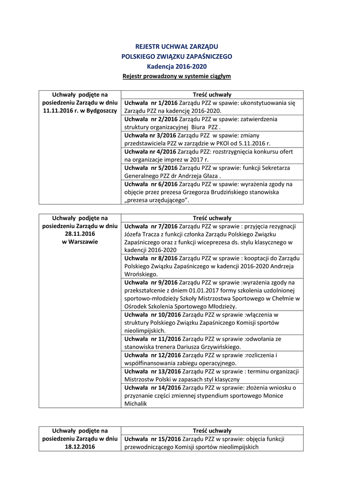 REJESTR UCHWAŁ ZARZĄDU POLSKIEGO ZWIĄZKU ZAPAŚNICZEGO Kadencja 2016-2020 Rejestr prowadzony w systemie ciągłym Uchwały podjęte na posiedzeniu Zarządu w dniu 11.11.2016 r. w Bydgoszczy Treść uchwały Uchwała nr 1/2016 Zarządu PZZ w spawie: ukonstytuowania się Zarządu PZZ na kadencję 2016-2020. Uchwała nr 2/2016 Zarządu PZZ w spawie: zatwierdzenia struktury organizacyjnej Biura PZZ . Uchwała nr 3/2016 Zarządu PZZ w spawie: zmiany przedstawiciela PZZ w zarządzie w PKOl od 5.11.2016 r. Uchwała nr 4/2016 Zarządu PZZ: rozstrzygnięcia konkursu ofert na organizacje imprez w 2017 r. Uchwała nr 5/2016 Zarządu PZZ w sprawie: funkcji Sekretarza Generalnego PZZ dr Andrzeja Głaza . Uchwała nr 6/2016 Zarządu PZZ w spawie: wyrażenia zgody na objęcie przez prezesa Grzegorza Brudzińskiego stanowiska „prezesa urzędującego”. Uchwały podjęte na posiedzeniu Zarządu w dniu 28.11.2016 w Warszawie Treść uchwały Uchwała nr 7/2016 Zarządu PZZ w sprawie : przyjęcia rezygnacji Józefa Tracza z funkcji członka Zarządu Polskiego Związku Zapaśniczego oraz z funkcji wiceprezesa ds. stylu klasycznego w kadencji 2016-2020 Uchwała nr 8/2016 Zarządu PZZ w sprawie : kooptacji do Zarządu Polskiego Związku Zapaśniczego w kadencji 2016-2020 Andrzeja Wrońskiego. Uchwała nr 9/2016 Zarządu PZZ w sprawie :wyrażenia zgody na przekształcenie z dniem 01.01.2017 formy szkolenia uzdolnionej sportowo-młodzieży Szkoły Mistrzostwa Sportowego w Chełmie w Ośrodek Szkolenia Sportowego Młodzieży. Uchwała nr 10/2016 Zarządu PZZ w sprawie :włączenia w struktury Polskiego Związku Zapaśniczego Komisji sportów nieolimpijskich. Uchwała nr 11/2016 Zarządu PZZ w sprawie :odwołania ze stanowiska trenera Dariusza Grzywińskiego. Uchwała nr 12/2016 Zarządu PZZ w sprawie :rozliczenia i współfinansowania zabiegu operacyjnego. Uchwała nr 13/2016 Zarządu PZZ w sprawie : terminu organizacji Mistrzostw Polski w zapasach styl klasyczny Uchwała nr 14/2016 Zarządu PZZ w sprawie: złożenia wniosku o przyznanie części zmiennej stypendium sportowego Monice Michalik Uchwały podjęte na posiedzeniu Zarządu w dniu 18.12.2016 Treść uchwały Uchwała nr 15/2016 Zarządu PZZ w sprawie: objęcia funkcji przewodniczącego Komisji sportów nieolimpijskich Uchwała nr 16/2016 Zarządu PZZ w sprawie: utworzenia sztabu trenerskiego przez trenerów szkolenia olimpijskiego w zapasach styl wolny, w zapasach kobiet, styl klasyczny. Uchwała nr 17/2016 Zarządu PZZ w sprawie: zatwierdzenia Regulaminu systemu współzawodnictwa sportowego dzieci i młodzieży w zapasach, obowiązujący w 2017 roku. Uchwała nr 18/2016 Zarządu PZZ w sprawie: wyznaczenia i przyjęcia opłaty za zmianę barw klubowych zawodnika w zapasach w stylu klasycznym -Romana Pacurkowskiego Uchwała nr 19/2016 Zarządu PZZ w sprawie: zatwierdzenia ryczałtów sędziowskich w lidze KLZ obowiązujących w 2017 roku. Uchwała nr 20/2016 Zarządu PZZ w sprawie: upoważnienia prezesa Polskiego Związku Zapaśniczego do podpisania umowy ubezpieczenia obowiązującej w roku 2017. Uchwała nr 21/2016 Zarządu PZZ w sprawie: akceptacji struktury Polskiego Związku Zapaśniczego. Uchwały podjęte na posiedzeniu Zarządu w dniu 13.01.2017 Treść uchwały Uchwała nr 22/2017 Zarządu PZZ w sprawie: przyjęcia rezygnacji Zbigniewa Grudnia z funkcji członka Zarządu Polskiego Związku Zapaśniczego w kadencji 2016-2020. Uchwała nr 23/2017 Zarządu PZZ w sprawie: zatwierdzenia Pełnomocnika ds. kontaktów z Radą Główną LZS w kadencji 20162020. Uchwała nr 24/2017 Zarządu PZZ w sprawie: : zatwierdzenia zmiany w schemacie organizacyjnym struktury Zarządu poprzez wprowadzenie Komisji ds. współpracy z KLZ . Uchwała nr 25/2017 Zarządu PZZ w sprawie: zatwierdzenia stawek opłat licencyjnych Uchwała nr 26/2017 Zarządu PZZ w sprawie: zatwierdzenia Administratora Danych Osobowych w kadencji 2016-2020. Uchwała nr 27/2017 Zarządu PZZ w sprawie: zatwierdzenia zmiany terminu Mistrzostw Polski Seniorów w stylu klasycznym i zmian do Kalendarza Imprez na rok 2017. Uchwała nr 28/2017 Zarządu PZZ w sprawie: zatwierdzenia Regulaminu Organizacyjno-Sportowego Imprez Polskiego Związku Zapaśniczego określającego zasady organizacyjne i sportowe obowiązujące w Polskim Związku Zapaśniczym oraz Kalendarza Imprez PZZ na 2017 rok. Uchwała nr 29/2017 Zarządu PZZ w sprawie: przyjęcia Raportu otwarcia kadencji 2016-2020. Uchwała nr 30/2017 Zarządu PZZ w sprawie: zatwierdzenia Regulaminu Pracy Komisji Zmiany Barw Klubowych Polskiego Związku Zapaśniczego. Uchwała nr 31/2017 Zarządu PZZ w sprawie: zatwierdzenia Regulaminu Pracy Komisji organizacji i mediów Polskiego Związku Zapaśniczego. Uchwała nr 32/2017 Zarządu PZZ w sprawie: : zatwierdzenia Regulaminu Pracy Komisji Dyscyplinarno-Arbitrażowej Polskiego Związku Zapaśniczego. Uchwała nr 33/2017 Zarządu PZZ w sprawie: zatwierdzenia Regulaminu Pracy Komisji Odznaczeń i Wyróżnień Polskiego Związku Zapaśniczego Uchwała nr 34/2017 Zarządu PZZ w sprawie: zatwierdzenia Regulaminu Pracy Komisji Sprzętowej Polskiego Związku Zapaśniczego. Uchwała nr 35/2017 Zarządu PZZ w sprawie: zatwierdzenia Regulaminu Pracy kolegium Sędziów Polskiego Związku Zapaśniczego Uchwała nr 36/2017 Zarządu PZZ w sprawie: zatwierdzenia Regulaminu Pracy Komisji Organizacji Imprez Polskiego Związku Zapaśniczego Uchwała nr 37/2017 Zarządu PZZ w sprawie: zatwierdzenia Regulaminu Pracy Komisji Sportowej i Sportu Młodzieżowego Polskiego Związku Zapaśniczego Uchwała nr 38/2017 Zarządu PZZ w sprawie: zatwierdzenia Regulaminu Pracy Zarządu i Prezydium Polskiego Związku Zapaśniczego Uchwała nr 39/2017 Zarządu PZZ w sprawie: zatwierdzenia podjęcia współpracy z trenerami kdry narodowej juniorów młodszych w zapasach w stylu wolnym i juniorek młodszych w zapasach kobiet. Uchwała nr 40/2017 Zarządu PZZ w sprawie: ustanowienia kryteriów powoływania kadr narodowych w 2017 roku. U