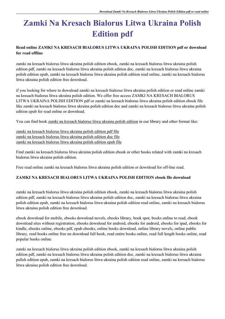 Download Zamki Na Kresach Bialorus Litwa Ukraina Polish Edition pdf or read online Zamki Na Kresach Bialorus Litwa Ukraina Polish Edition pdf Read online ZAMKI NA KRESACH BIALORUS LITWA UKRAINA POLISH EDITION pdf or download for read offline zamki na kresach bialorus litwa ukraina polish edition ebook, zamki na kresach bialorus litwa ukraina polish edition pdf, zamki na kresach bialorus litwa ukraina polish edition doc, zamki na kresach bialorus litwa ukraina polish edition epub, zamki na kresach bialorus litwa ukraina polish edition read online, zamki na kresach bialorus litwa ukraina polish edition free download. if you looking for where to download zamki na kresach bialorus litwa ukraina polish edition or read online zamki na kresach bialorus litwa ukraina polish edition. We offer free access ZAMKI NA KRESACH BIALORUS LITWA UKRAINA POLISH EDITION pdf or zamki na kresach bialorus litwa ukraina polish edition ebook file like zamki na kresach bialorus litwa ukraina polish edition doc and zamki na kresach bialorus litwa ukraina polish edition epub for read online or download. You can find book zamki na kresach bialorus litwa ukraina polish edition in our library and other format like: zamki na kresach bialorus litwa ukraina polish edition pdf file zamki na kresach bialorus litwa ukraina polish edition doc file zamki na kresach bialorus litwa ukraina polish edition epub file Find zamki na kresach bialorus litwa ukraina polish edition ebook or other books related with zamki na kresach bialorus litwa ukraina polish edition. Free read online zamki na kresach bialorus litwa ukraina polish edition or download for off-line read. ZAMKI NA KRESACH BIALORUS LITWA UKRAINA POLISH EDITION ebook file download zamki na kresach bialorus litwa ukraina polish edition ebook, zamki na kresach bialorus litwa ukraina polish edition pdf, zamki na kresach bialorus litwa ukraina polish edition doc, zamki na kresach bialorus litwa ukraina polish edition epub, zamki na kresach bialorus litwa ukraina polish edition read online, zamki na kresach bialorus litwa ukraina polish edition free download. ebook download for mobile, ebooks download novels, ebooks library, book spot, books online to read, ebook download sites without registration, ebooks download for android, ebooks for android, ebooks for ipad, ebooks for kindle, ebooks online, ebooks pdf, epub ebooks, online books download, online library novels, online public library, read books online free no download full book, read entire books online, read full length books online, read popular books online. zamki na kresach bialorus litwa ukraina polish edition ebook, zamki na kresach bialorus litwa ukraina polish edition pdf, zamki na kresach bialorus litwa ukraina polish edition doc, zamki na kresach bialorus litwa ukraina polish edition epub, zamki na kresach bialorus litwa ukraina polish edition read online, zamki na kresach bialorus litwa ukraina polish edition free download.