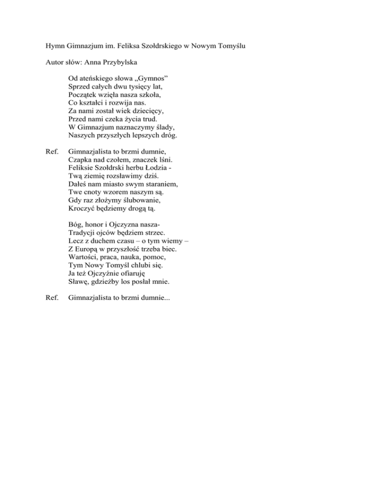 Hymn Gimnazjum im. Feliksa Szołdrskiego w Nowym Tomyślu Autor słów: Anna Przybylska Od ateńskiego słowa „Gymnos” Sprzed całych dwu tysięcy lat, Początek wzięła nasza szkoła, Co kształci i rozwija nas. Za nami został wiek dziecięcy, Przed nami czeka życia trud. W Gimnazjum naznaczymy ślady, Naszych przyszłych lepszych dróg. Ref. Gimnazjalista to brzmi dumnie, Czapka nad czołem, znaczek lśni. Feliksie Szołdrski herbu Łodzia Twą ziemię rozsławimy dziś. Dałeś nam miasto swym staraniem, Twe cnoty wzorem naszym są. Gdy raz złożymy ślubowanie, Kroczyć będziemy drogą tą. Bóg, honor i Ojczyzna naszaTradycji ojców będziem strzec. Lecz z duchem czasu – o tym wiemy – Z Europą w przyszłość trzeba biec. Wartości, praca, nauka, pomoc, Tym Nowy Tomyśl chlubi się. Ja też Ojczyźnie ofiaruję Sławę, gdzieżby los posłał mnie. Ref. Gimnazjalista to brzmi dumnie...