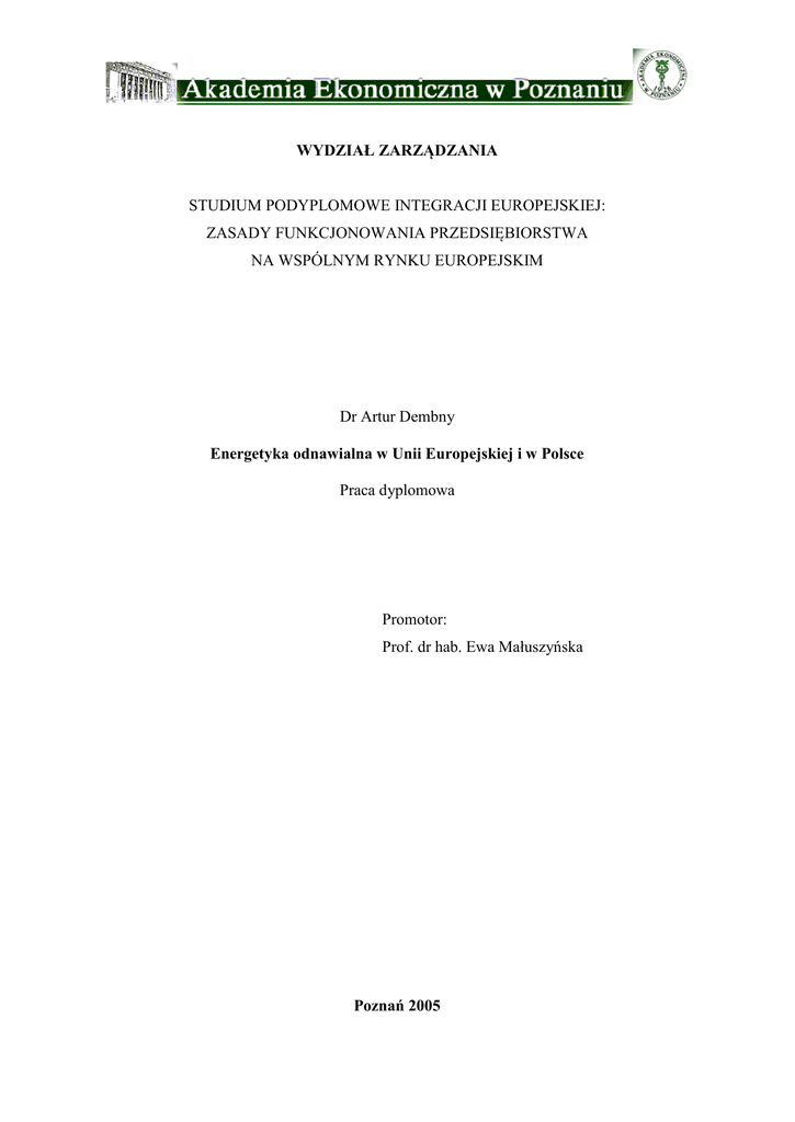 WYDZIAŁ ZARZĄDZANIA STUDIUM PODYPLOMOWE INTEGRACJI EUROPEJSKIEJ: ZASADY FUNKCJONOWANIA PRZEDSIĘBIORSTWA NA WSPÓLNYM RYNKU EUROPEJSKIM Dr Artur Dembny Energetyka odnawialna w Unii Europejskiej i w Polsce Praca dyplomowa Promotor: Prof. dr hab. Ewa Małuszyńska Poznań 2005 AKADEMIA EKONOMICZNA W POZNANIU – KATEDRA EUROPEISTYKI Spis treści SPIS TREŚCI............................................................................................................................ 2 WSTĘP ...................................................................................................................................... 3 ROZDZIAŁ 1 - SZCZYT ZIEMI W RIO DE JANEIRO I PROTOKÓŁ Z KIOTO ....... 5 ROZDZIAŁ 2 - ODNAWIALNE ŹRÓDŁA ENERGII ELEKTRYCZNEJ (OZE) ......... 8 2.1. 2.2. TERMINOLOGIA ........................................................................................................... 8 RODZAJE ODNAWIALNYCH ŹRÓDEŁ ENERGII .............................................................. 9 ROZDZIAŁ 3 - POLITYKA UE W STOSUNKU DO EKOLOGII I ODNAWIALNYCH ŹRÓDEŁ ENERGII ............................................................................................................... 15 3.1. 3.2. 3.3. BIAŁA KSIĘGA KOMISJI EUROPEJSKIEJ ...................................................................... 18 PROGRAMY ENERGETYCZNE UNII EUROPEJSKIEJ....................................................... 22 DYREKTYWY ............................................................................................................. 25 ROZDZIAŁ 4 - ENERGETYKA ODNAWIALNA W POLSCE ...................................... 27 4.1. POLITYKA ENERGETYCZNA PAŃSTWA W STOSUNKU DO OZE.................................... 28 4.2. WDRAŻANIE REGULACJI UNIJNYCH DO PRAWODAWSTWA KRAJOWEGO ..................... 31 4.3. FINANSOWANIE OZE Z FUNDUSZY UNIJNYCH............................................................ 33 4.3.1. Finansowanie z ZPORR ....................................................................................... 34 4.3.2. Finansowanie z SPO-WKP................................................................................... 36 4.4. STAN ENERGETYKI ODNAWIALNEJ W POLSCE ........................................................... 42 PODSUMOWANIE ............................................................................................................... 47 SPIS TABEL ........................................................................................................................... 49 SPIS WYKRESÓW................................................................................................................ 49 SPIS RYSUNKÓW ................................................................................................................ 49 LITERATURA ....................................................................................................................... 50 2 AKADEMIA EKONOMICZNA W POZNANIU – KATEDRA EUROPEISTYKI Wstęp Wyczerpywanie się tradycyjnych źródeł energii (węgla, ropy naftowej, gazu ziemnego), wzrost świadomości ekologicznej oraz nadmierne zanieczyszczenie środowiska naturalnego, w ostatnich kilku dekadach spowodowały ogromny wzrost zainteresowania problematyką wytwarzania energii, w tzw. Odnawialnych Źródłach Energii (OZE). Źródła te stanowią doskonałą alternatywę dla tradycyjnych nośników energii, ponieważ ich zasoby (biomasa, energia wody, energia wnętrza Ziemi, energia wiatru, energia Słońca) uzupełniają się w naturalnych procesach - co oznacza, że są praktycznie niewyczerpalne. Ponadto, w przeciwieństwie do energii pozyskiwanej w tradycyjny sposób, Energia Odnawialna jest przyjazna dla środowiska. Eksploatacja OZE nie powoduje emisji szkodliwych dla środowiska substancji a zwłaszcza gazów cieplarnianych, które są głównym problemem wynikającym ze spalania paliw kopalnych. Wzrost koncentracji gazów cieplarnianych w atmosferze, a przede wszystkim dwutlenku węgla, spowodował niepokojące zmiany klimatyczne. Zaobserwowano, że w ciągu ostatnich stu lat, temperatura na Ziemi podniosła się o około 0,6˚C. Zjawisko to jest potocznie zwane efektem cieplarnianym. Skutki efektu cieplarnianego dla środowiska naturalnego, a w związku z tym dla całej ludzkiej cywilizacji, mogą być dramatyczne. Przewiduje się, że do roku 2100 średni poziom morza podniesie się o około 9 - 88 cm, co spowoduje zalanie ogromnych obszarów lądu. Może wzrosnąć częstość występowania ekstremalnych zjawisk atmosferycznych takich jak susze, powodzie czy huragany. Strefy klimatyczne mogą ulec przesunięciu, co oznaczałoby nie tylko utratę bezcennych ekosystemów oraz wyginięcie wielu gatunków, ale także utratę wielu gruntów rolnych, co w wielu regionach mogłoby zakończyć się klęską głodową. Na całym świecie obserwuje się obecnie zmiany w energetyce, które są konsekwencją powyższych rozważań (energetyka jest jednym ze „sprawców” efektu cieplarnianego), a także rosnących cen ropy i gazu. Stawiają one nowe wyzwania przed sektorami energetycznymi różnych państw. W krajach Unii Europejskiej najważniejsze wydają się być zagadnienia dotyczące zapewnienia bezpieczeństwa energetycznego, zastopowania zmian klimatu i tworzenia wewnętrznego rynku energetycznego1. Stąd bierze się zainteresowanie OZE, które traktowane są jako środek do osiągnięcia celu: czystego i ekologicznego środowiska naturalnego z nienaruszonymi zasobami. 1 H.Rechul, Zielona energia, www.elektrownie-wiatrowe.org.pl/art_zielona_energia.htm 3 AKADEMIA EKONOMICZNA W POZNANIU – KATEDRA EUROPEISTYKI Celem niniejszej pracy jest przedstawienie koncepcji wspierania OZE na obszarze Unii Europejskiej na skutek wdrażania dedykowanych temu problemowi aktów prawnych i innych regulacji. Niniejsza praca została podzielona na trzy rozdziały. W Rozdziale 1 Autor omawia podstawy narodzin świadomości ekologicznej na świecie, kt