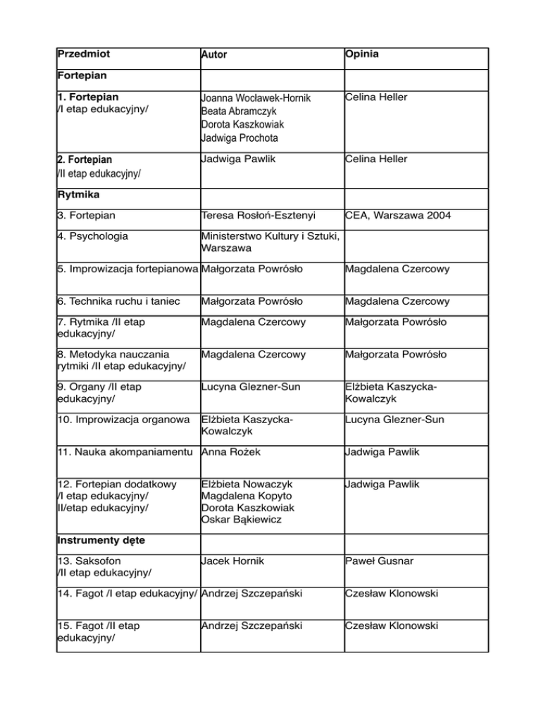 Autor Opinia 1. Fortepian /I etap edukacyjny/ Joanna Wocławek-Hornik Beata Abramczyk Dorota Kaszkowiak Jadwiga Prochota Celina Heller 2. Fortepian /II etap edukacyjny/ Jadwiga Pawlik Celina Heller 3. Fortepian Teresa Rosłoń-Esztenyi CEA, Warszawa 2004 4. Psychologia Ministerstwo Kultury i Sztuki, Warszawa Przedmiot Fortepian Rytmika 5. Improwizacja fortepianowa Małgorzata Powrósło Magdalena Czercowy 6. Technika ruchu i taniec Małgorzata Powrósło Magdalena Czercowy 7. Rytmika /II etap edukacyjny/ Magdalena Czercowy Małgorzata Powrósło 8. Metodyka nauczania rytmiki /II etap edukacyjny/ Magdalena Czercowy Małgorzata Powrósło 9. Organy /II etap edukacyjny/ Lucyna Glezner-Sun Elżbieta KaszyckaKowalczyk 10. Improwizacja organowa Elżbieta KaszyckaKowalczyk Lucyna Glezner-Sun 11. Nauka akompaniamentu Anna Rożek Jadwiga Pawlik 12. Fortepian dodatkowy /I etap edukacyjny/ II/etap edukacyjny/ Elżbieta Nowaczyk Magdalena Kopyto Dorota Kaszkowiak Oskar Bąkiewicz Jadwiga Pawlik Jacek Hornik Paweł Gusnar Instrumenty dęte 13. Saksofon /II etap edukacyjny/ 14. Fagot /I etap edukacyjny/ Andrzej Szczepański Czesław Klonowski 15. Fagot /II etap edukacyjny/ Czesław Klonowski Andrzej Szczepański 17. Flet /II etap edukacyjny/ Michał Rosiak Mariola Fedorowicz 18. Tuba /I etap edukacyjny/ Janusz Wyrwał Harald Powrósło 19. Tuba /II etap edukacyjny/ Janusz Wyrwał Harald Powrósło 20. Akordeon /I etap edukacyjny/ Dariusz Kownacki Olga Strelc Bogdan Dowlasz 21. Akordeon /II etap edukacyjny/ Dariusz Kownacki Olga Strelc Bogdan Dowlasz 22. Obój /I etap edukacyjny/ Katarzyna Blicharska Tadeusz Widera 23. Obój /II etap edukacyjny/ Michał Szymała Tadeusz Widera 24. Klarnet /I etap edukacyjny/ Michał Kowalski Grzegorz Okoń 25. Klarnet /II etap edukacyjny/ Grzegorz Okoń Michał Kowalski 26. Puzon /I etap edukacyjny/ Harald Powrósło Zdzisław Stolarczyk 27. Puzon /II etap edukacyjny/ Harald Powrósło Michał Mazurkiewicz 28. Trąbka II stopnia Piotr Waloszczyk Roman Gryń 29. Perkusia /I etap edukacyjny/ Grzegorz Szkliński Krzysztof Jaguszewski 30. Perkusja /II etap edukacyjny/ Adam Kędzia Krzysztof Jaguszewski 31. Waltornia /I etap edukacyjny/ Gotfryd Włodarz Piotr Waloszczyk 32. Waltornia /II etap edukacyjny/ Gotfryd Włodarz Piotr Waloszczyk 33. Skrzypce /I etap edukacyjny/ Barbara Zwolińska-Kobiela Joanna Widawska Bożena Wołowczyk Janusz Gajownik 34. Skrzypce /II etap edukacyjny/ Renata Gajownik Janusz Gajownik Gajana Liszka Instrumenty Smyczkowe 35. Wiolonczela /I etap edukacyjny/ Anna Hryniów-Kościów Agnieszka Płoszejowska Anna Tohl 36. Wiolonczela /II etap edukacyjny/ Anna Hryniów-Kościów Agnieszka Płoszejowska 37. Altówka /II etap edukacyjny/ Janina Stark Beata Toczek 38. Kontrabas /II etap edukacyjny/ Andrzej Szajda Grzegorz Wieczorek 39. Gitara /I etap edukacyjny/ Lucyna Janowska Tadeusz Wybraniec 40. Gitara /II etap edukacyjny/ Tadeusz Wybraniec Monika Zębaty 41. Śpiew solowy /II etap edukacyjny/ Rafał Żurakowski Barbara Malinowska Teoria 42. Audycje muzyczne /I etap Marianna Hrymniak edukacyjny/ cykl 6-letni i 4letni Dorota Kurek-Piesoczyńska 43. Historia muzyki z literaturą muzyczną /II etap edukacyjny/ Małgorzata KowalskaWaloszczyk Wiesława Pośpiech 44. Formy muzyczne Barbara Mażak Małgorzata KowalskaWaloszczyk 45. Kształcenie słuchu /II etap edukacyjny/ Katarzyna Kaczmarczyk Alfred Bączkowicz 46. Kształcenie słuchu Maria Wacholc Program do KS dla klas I-VI SM I stopnia i ogólnokształcącej szkoły muzycznej I stopnia, Warszawa 2006 ISBN 978-83-88924-34-7 47. Rytmika - klasy I-III /I etap edukacyjny/ Anita Grabowski Magdalena Czercowy 48. Zasady muzyki Anna Wojatycka Katarzyna Kaczmarczyk 49. Literatura muzyczna /II etap edukacyjny/ Wiesława Pośpiech Barbara Mażak 50. Harmonia /II etap edukacyjny/ Alfred Bączkowicz Katarzyna Kaczmarczyk 51. Chór /I etap edukacyjny/ Ludmiła Zawadzka Hubert Prochota 52. Chór /II etap edukacyjny/ Ludmiła Zawadzka Hubert Prochota 53. Orkiestra II stopień Janusz Gajownik Hubert Prochota 54. Zespół smyczkowy /I etap Ludmiła Zawadzka edukacyjny/ Hubert Prochota 55. Dykcja i recytacja Barbara Malinowska Rafał Żurakowski 56. Program edukacji czytelniczej i medialnej Dorota Kasprzyk Sławomira Stawniczy/ Aldona Kolejowska